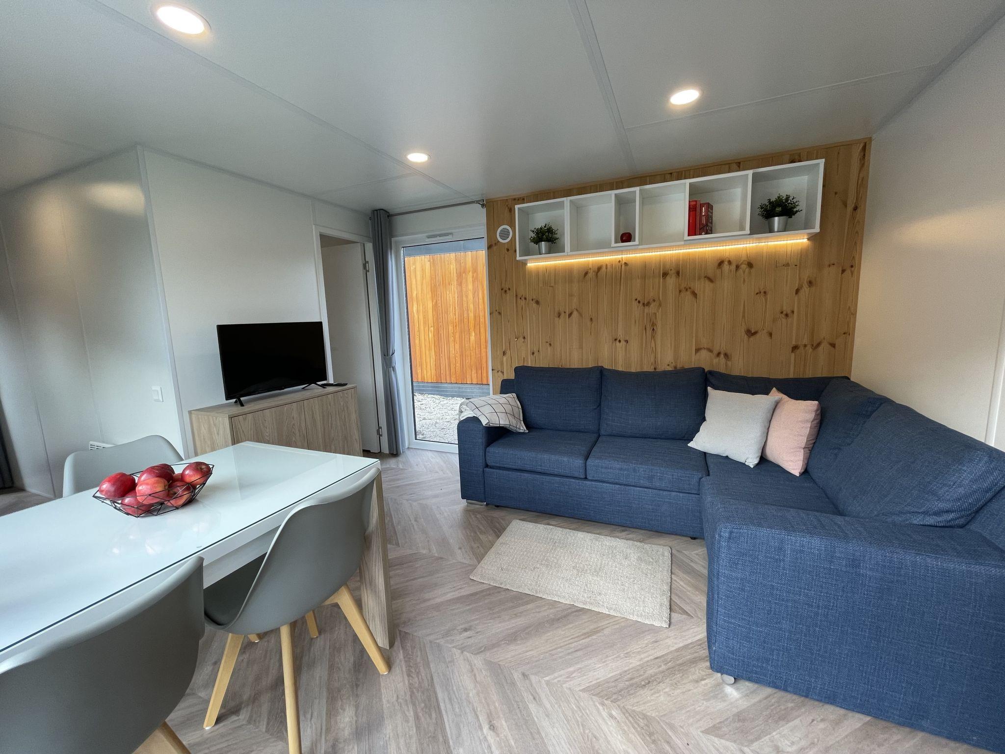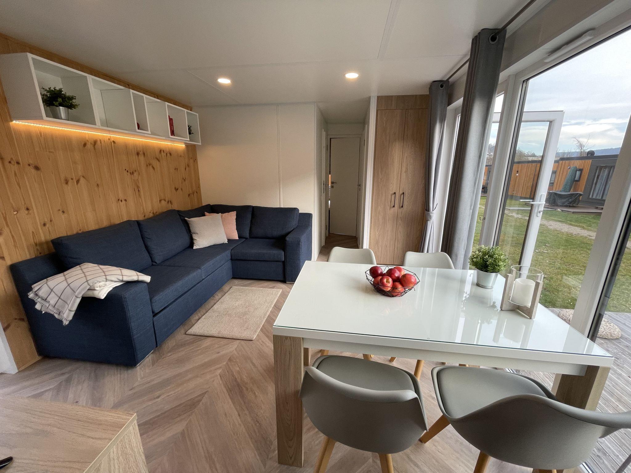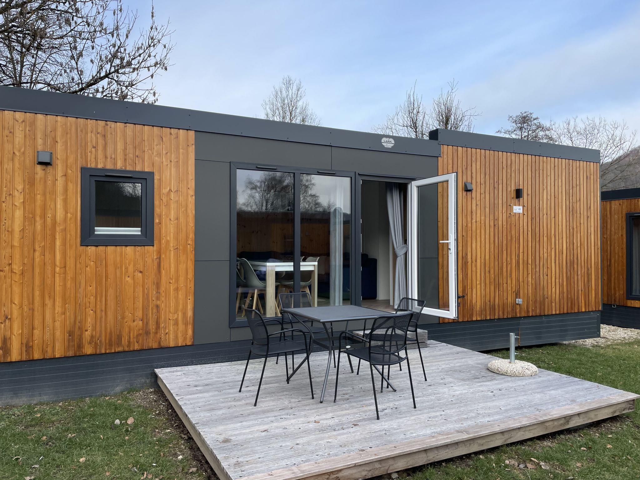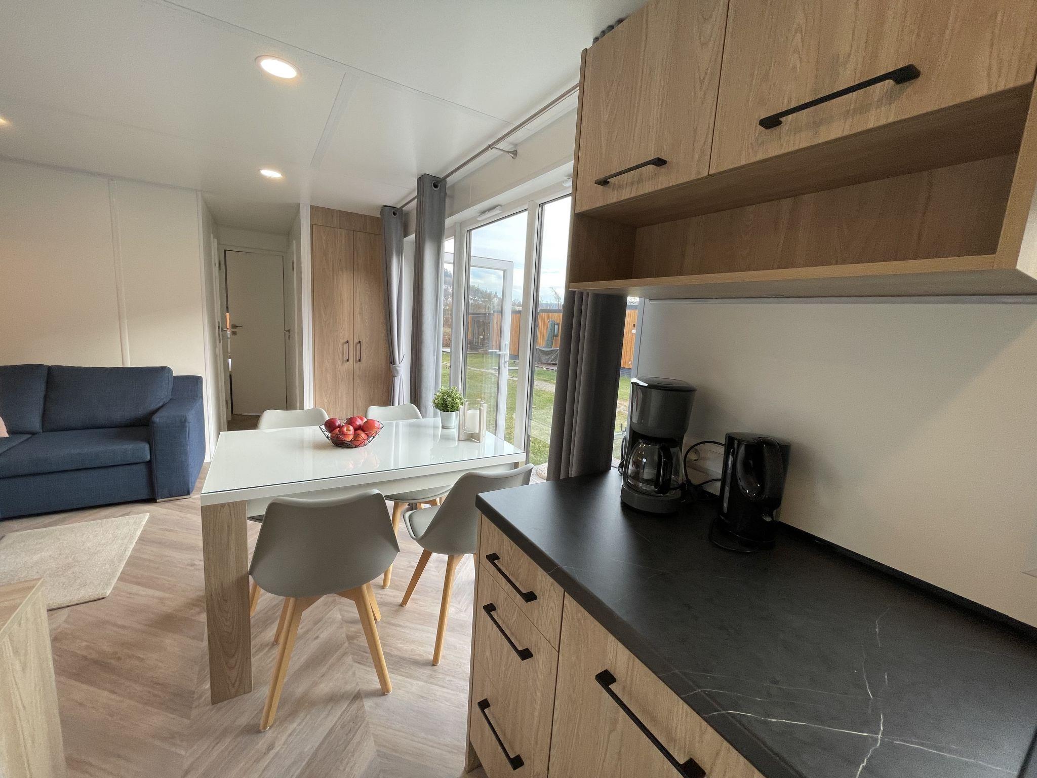 "Tiny Haus Schildkrötenstube", 3-room mobile home 32 m2. Cosy furnishings: living/sleeping room with (120 cm, length 170 cm), satellite TV. Exit to the terrace. 1 room with 1 french bed (140 cm, length 200 cm). 1 room with 2 beds (80 cm, length 200 cm). Open kitchen (4 ceramic glass hob hotplates, toaster, kettle, freezer, electric coffee machine). Shower/WC. Electric heating. Small terrace. Terrace furniture. Parking at the house. Please note: non-smoking house. Maximum 2 pets/ dogs allowed.
