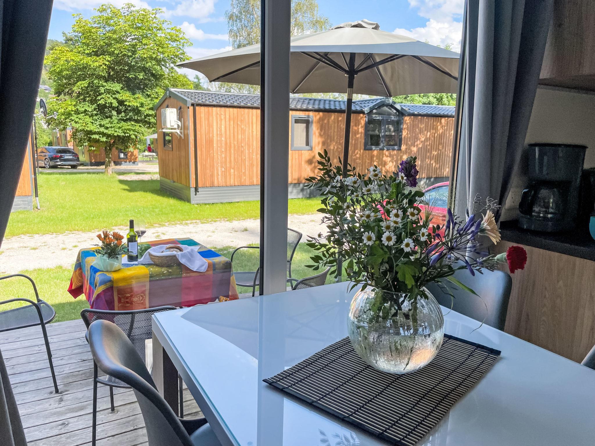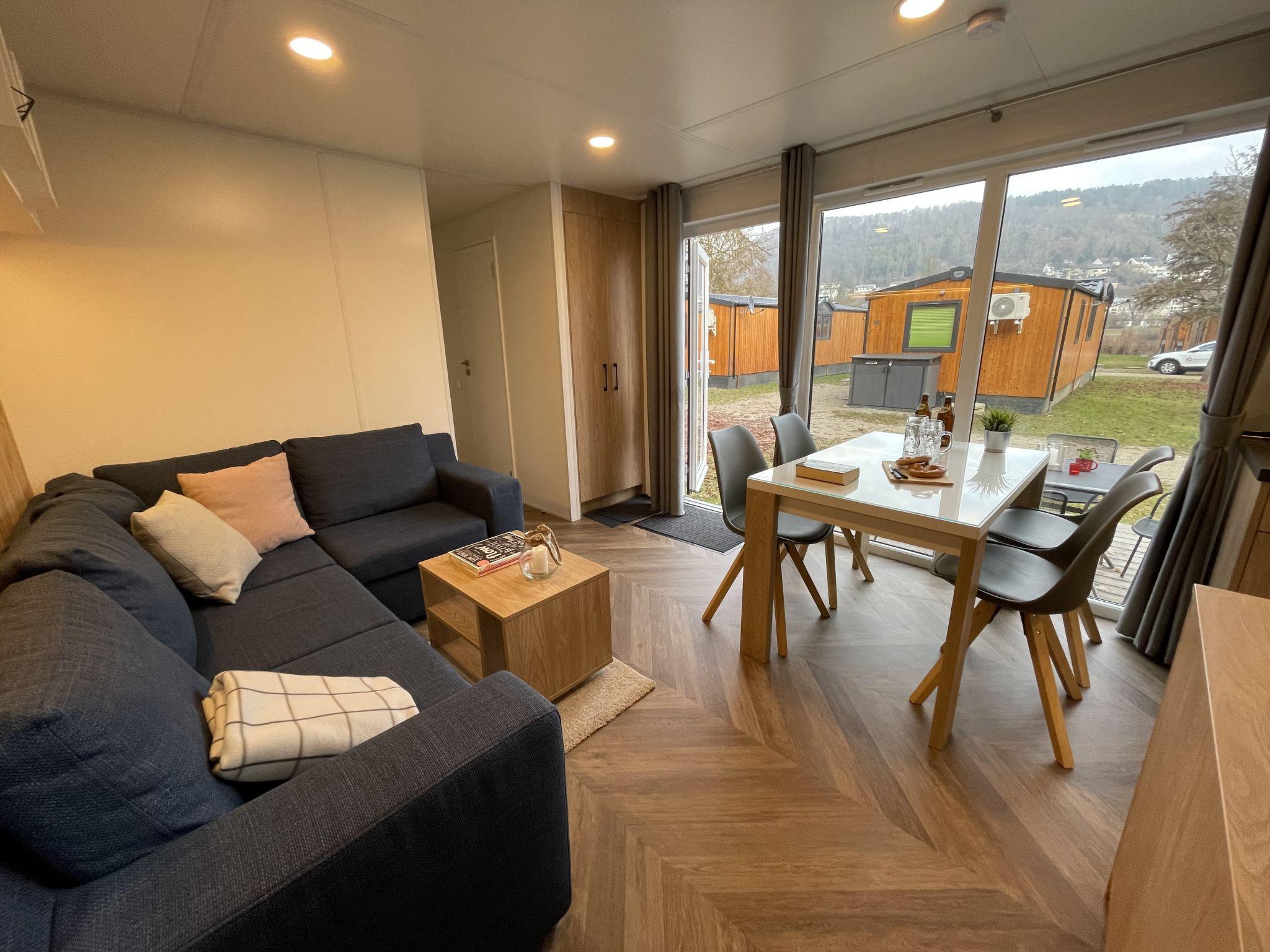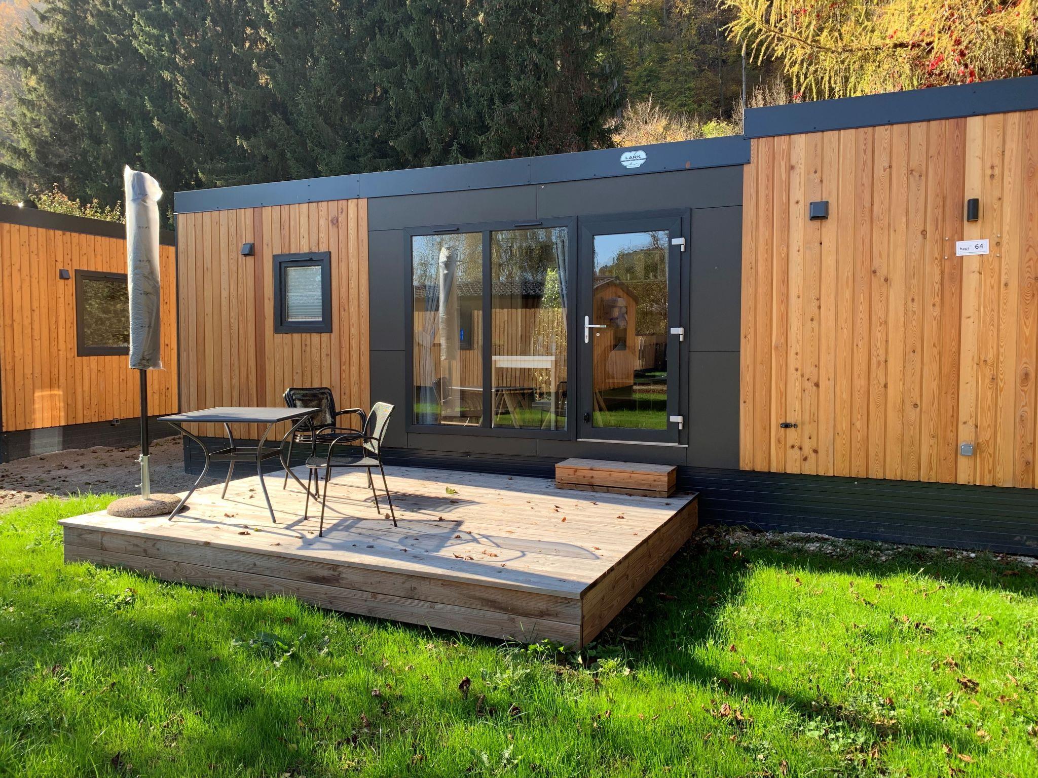 "Tiny Haus Rotkehlchen", 3-room mobile home 32 m2, on the ground floor. Cosy furnishings: living/sleeping room with 1 sofabed (120 cm, length 170 cm), dining table and satellite TV (flat screen). Exit to the terrace. 1 room with 1 french bed (140 cm, length 200 cm). 1 room with 2 beds (80 cm, length 200 cm). Kitchenette (4 ceramic glass hob hotplates, kettle, freezer, electric coffee machine). Shower, sep. WC. Electric heating. Small terrace. Terrace furniture. Facilities: hair dryer. Parking (1 car) at the house. Please note: non-smoking house. Maximum 1 pet/ dog allowed. Smoke alarm.