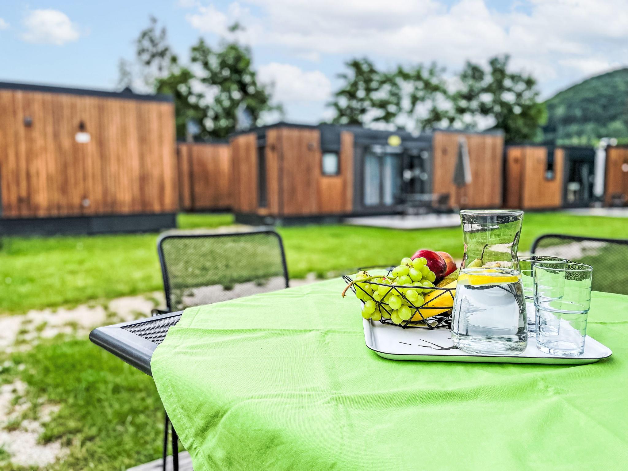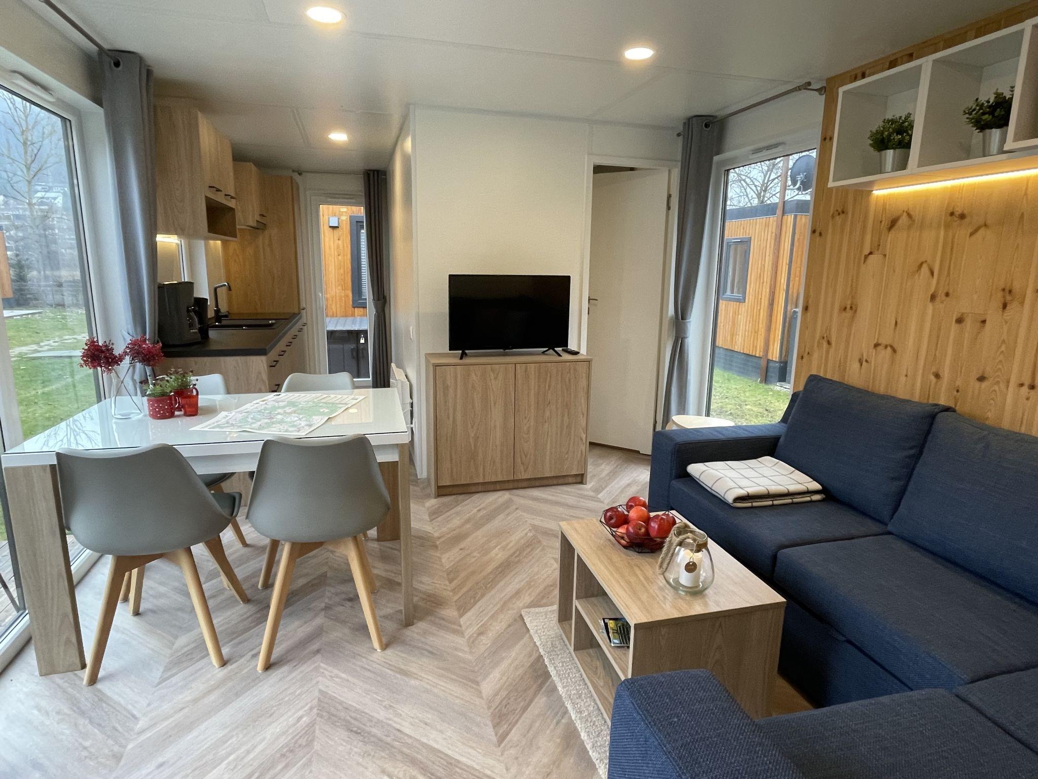 "Villa Ramses", 3-room mobile home 32 m2. Cosy furnishings: living/sleeping room with 1 double sofabed (120 cm, length 170 cm), satellite TV. Exit to the terrace. 1 room with 1 french bed (140 cm, length 200 cm). 1 room with 2 beds. Open kitchen (4 ceramic glass hob hotplates, kettle, freezer, electric coffee machine). Shower, sep. WC. Terrace furniture. Facilities: hair dryer. Parking at the house. Please note: non-smoking house. Maximum 2 pets/ dogs allowed.