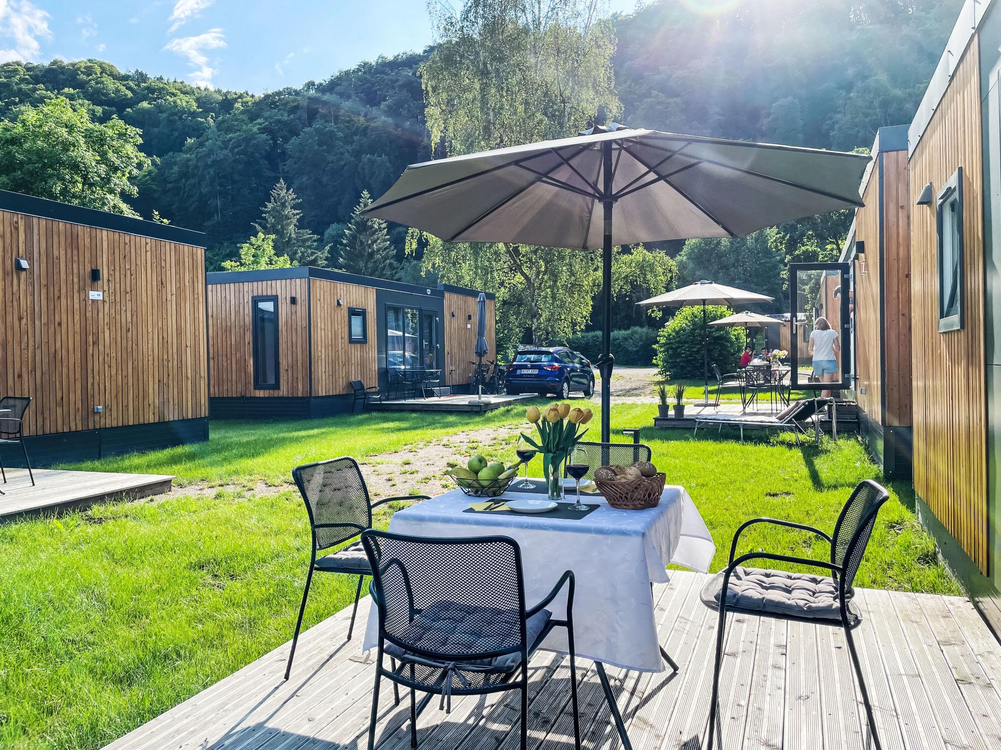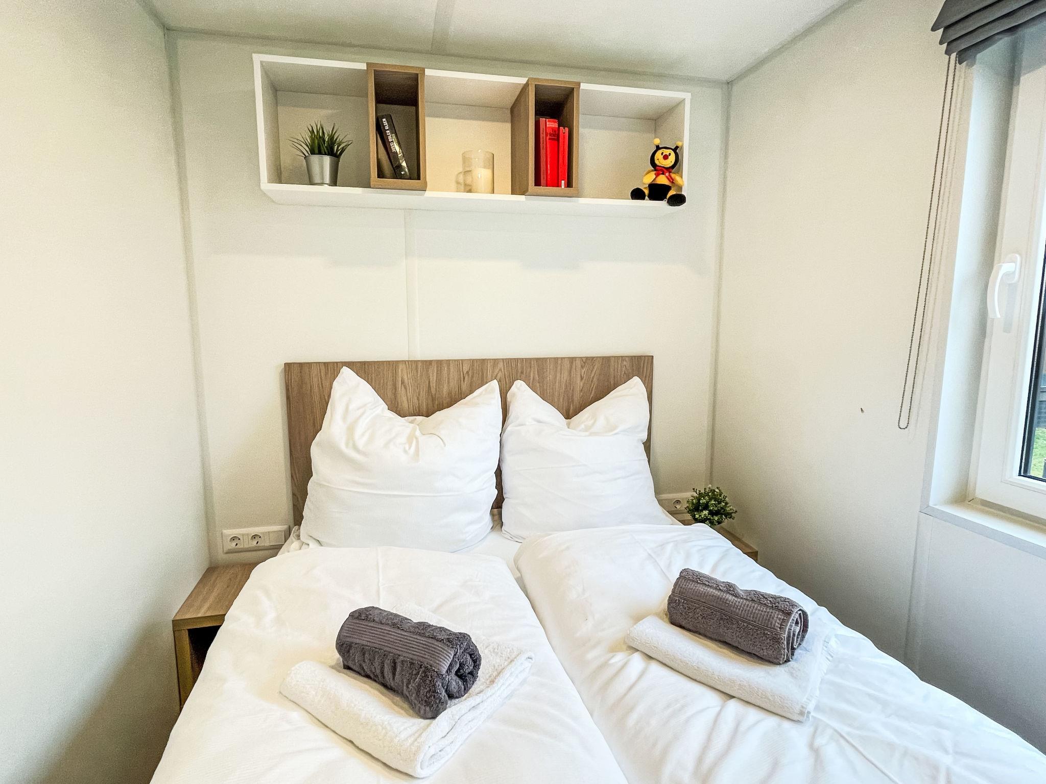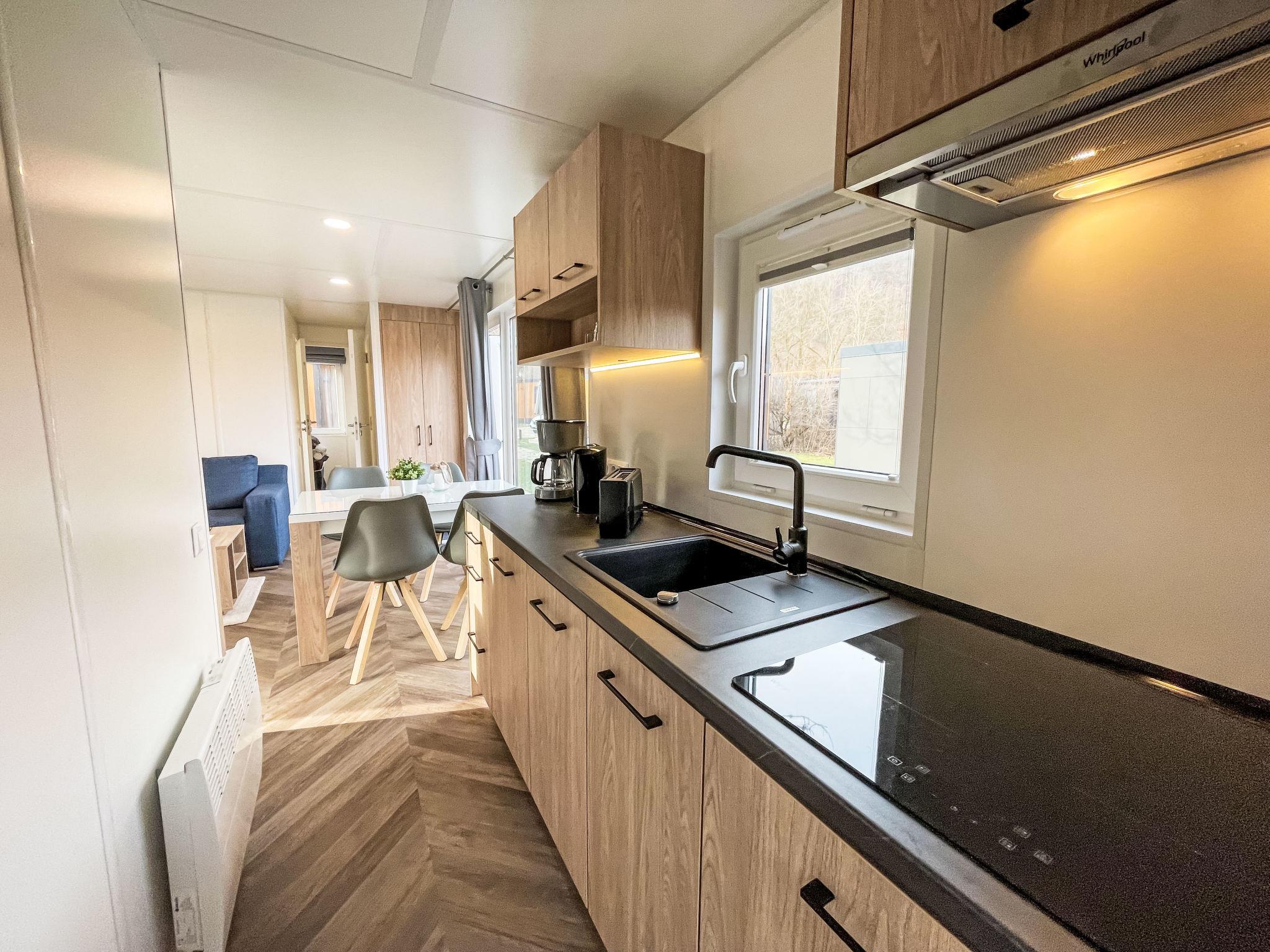 "Tiny Haus Villa Sunrise", 3-room mobile home 32 m2. Cosy furnishings: living room with satellite TV (flat screen). Exit to the terrace. 1 room with 1 french bed (140 cm, length 200 cm). 1 room with 2 beds (80 cm, length 200 cm). Kitchenette (4 ceramic glass hob hotplates, kettle, electric coffee machine). Shower/WC. Electric heating. Terrace. Terrace furniture. Facilities: hair dryer. Parking (1 car) at 30 m. Please note: non-smoking house. Smoke alarm.
