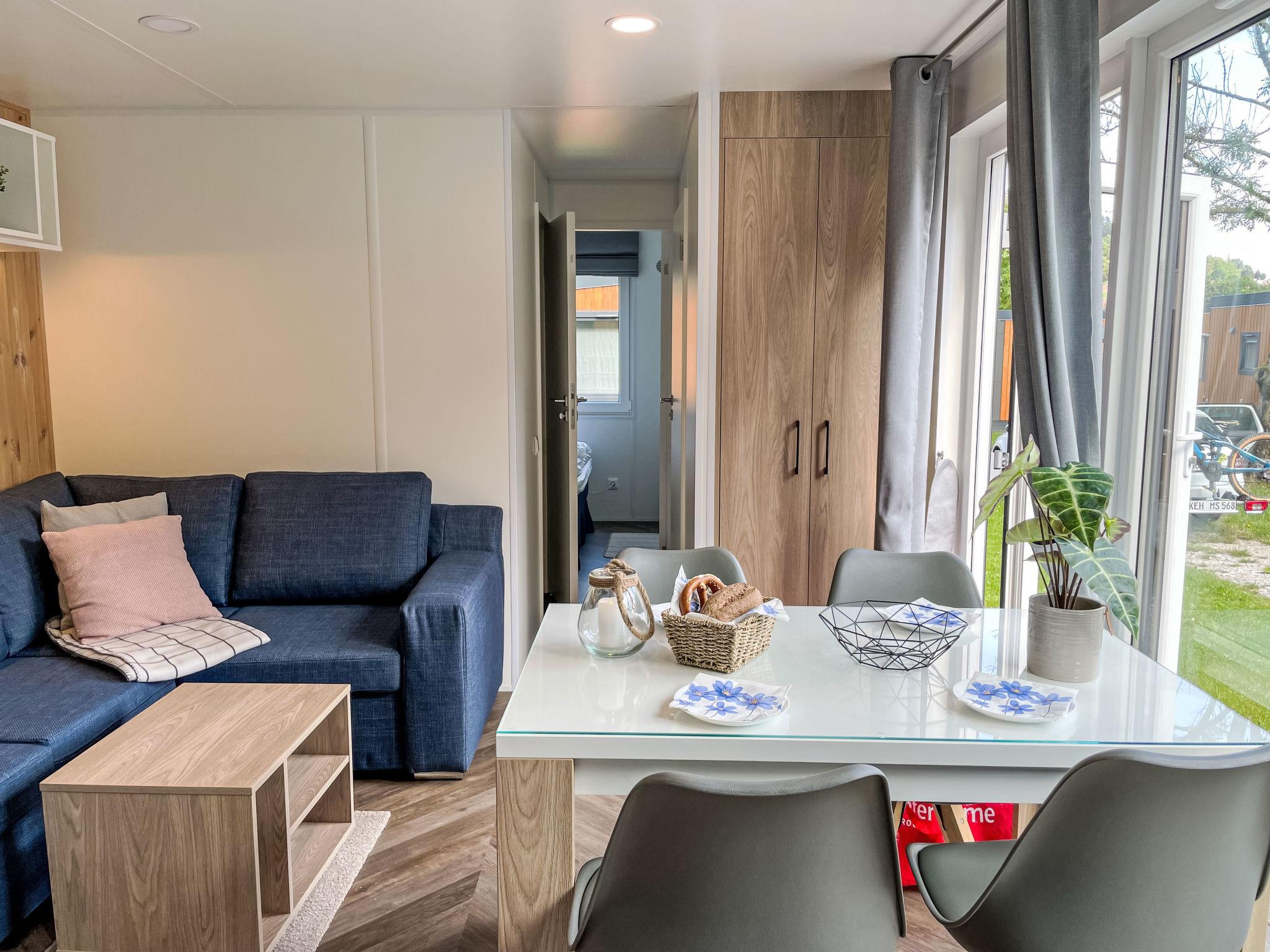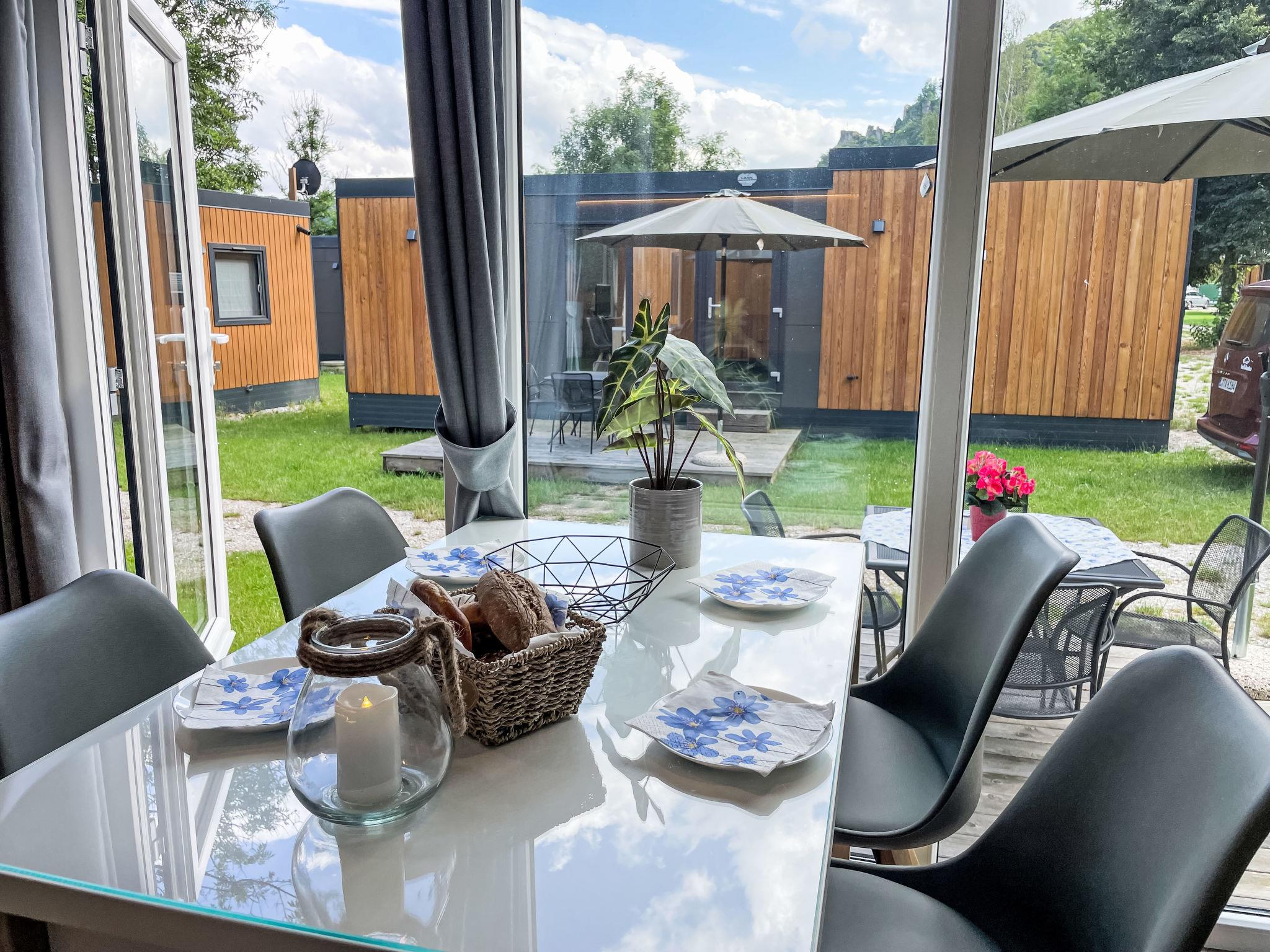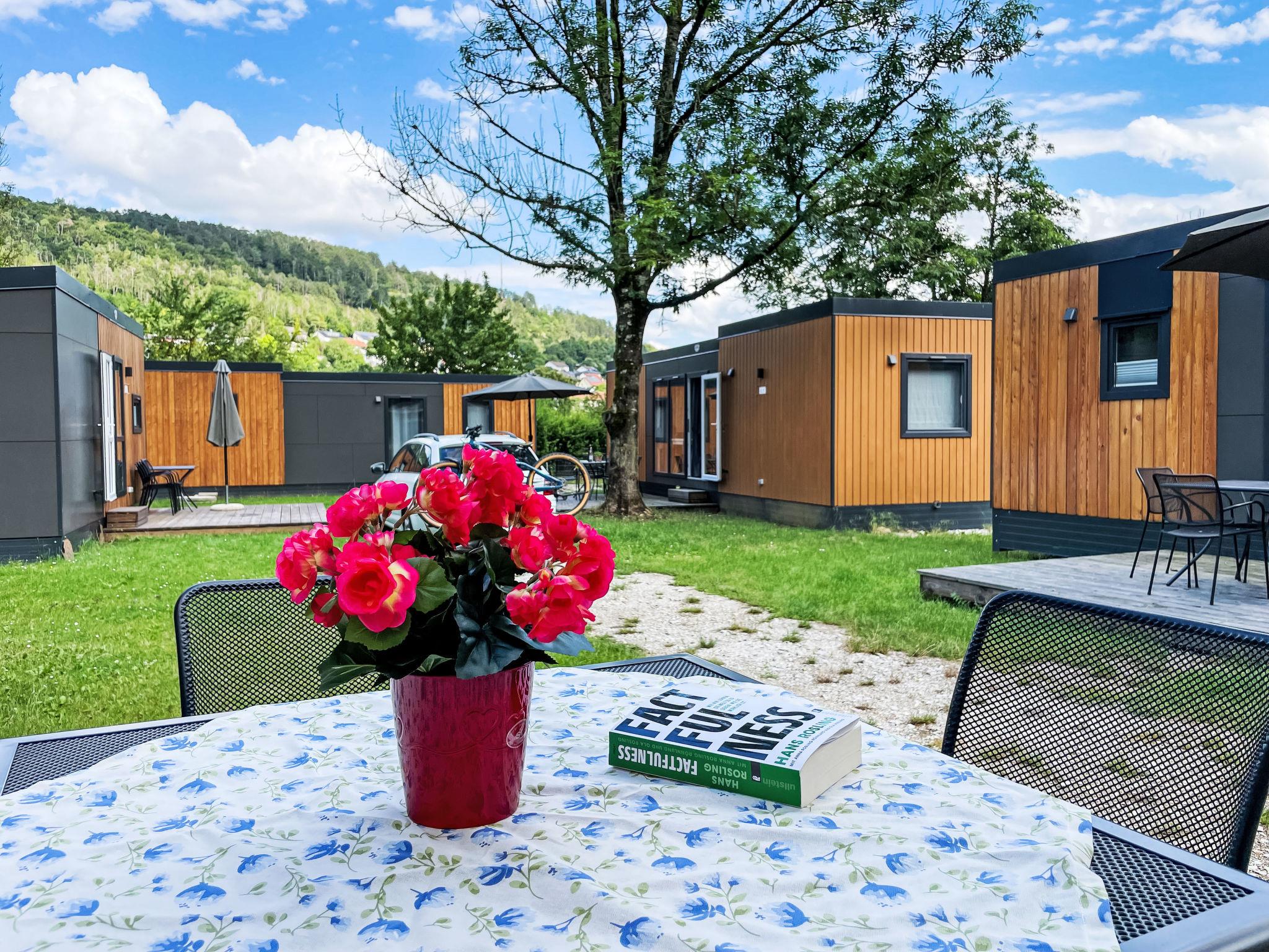 "Tiny Haus Limmer", 3-room mobile home 32 m2. Cosy furnishings: living/sleeping room with (120 cm, length 170 cm), satellite TV. Exit to the terrace. 1 room with 1 french bed (140 cm, length 190 cm). 1 room with 2 beds (70 cm, length 190 cm). Open kitchen (4 ceramic glass hob hotplates, kettle, electric coffee machine). Shower, sep. WC. Electric heating. Small terrace. Terrace furniture. Parking at the house. Please note: non-smoking house.