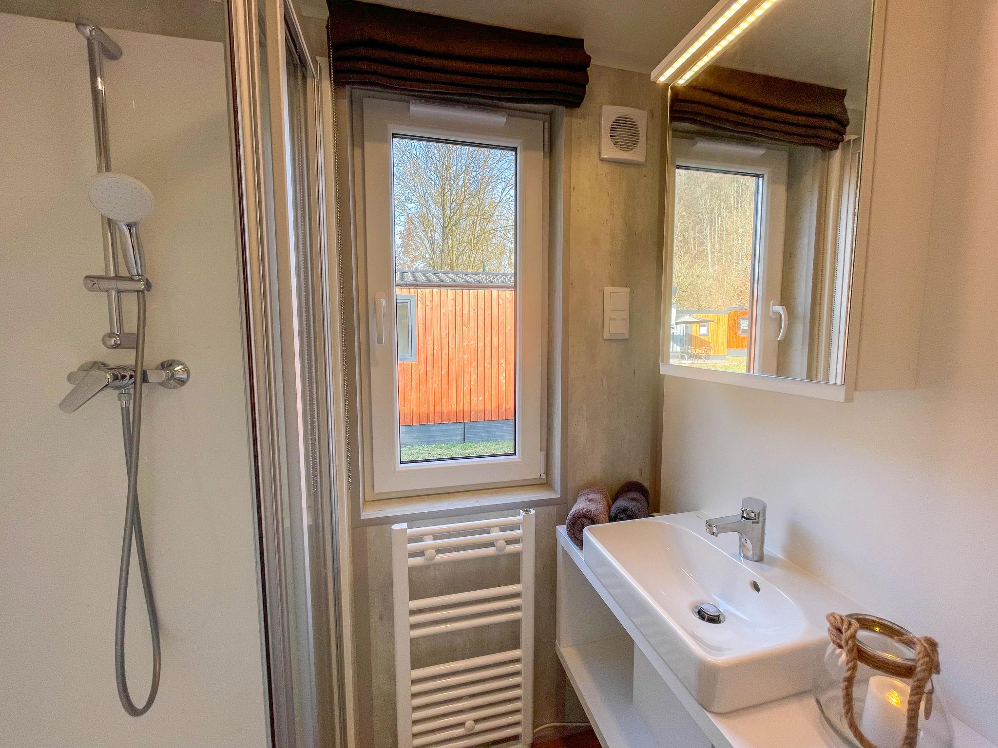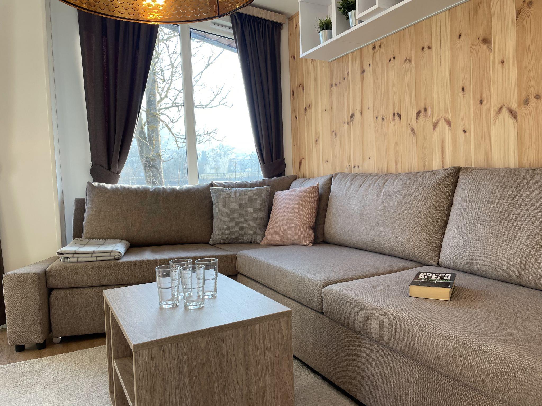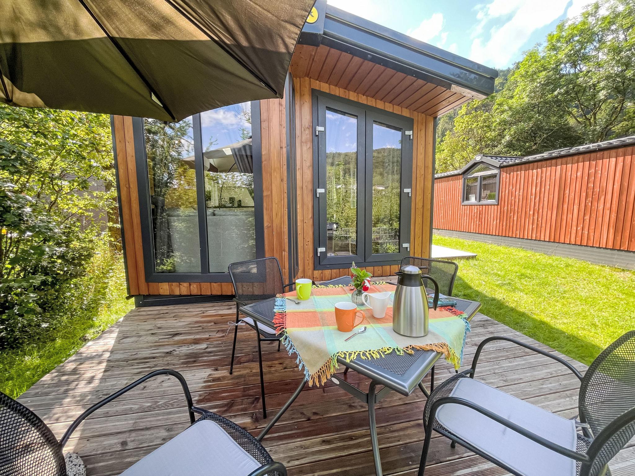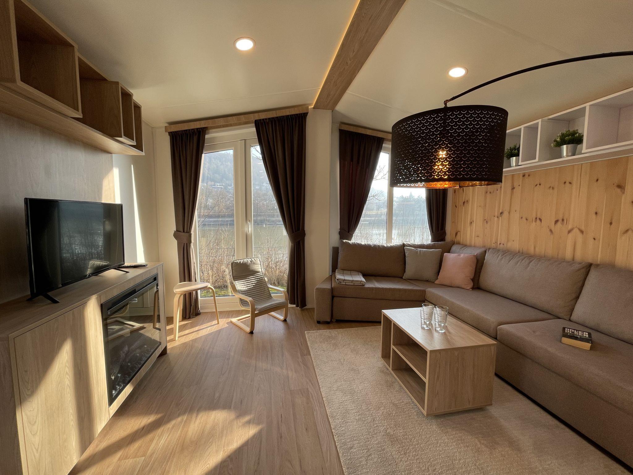"Tiny Haus Donaublick", 3-room mobile home 48 m2. Comfortable furnishings: living/sleeping room with 1 double sofabed (160 cm, length 200 cm), Scandinavian wood stove (only for decoration), satellite TV and air conditioning. Exit to the terrace. 1 room with 1 french bed (160 cm, length 200 cm). 1 room with 2 beds (80 cm, length 200 cm). Open kitchen (oven, dishwasher, 4 ceramic glass hob hotplates, kettle, freezer, electric coffee machine). Shower, sep. WC. Small terrace. Terrace furniture. Facilities: washing machine, dryer. Parking at the house. Please note: non-smokers only.