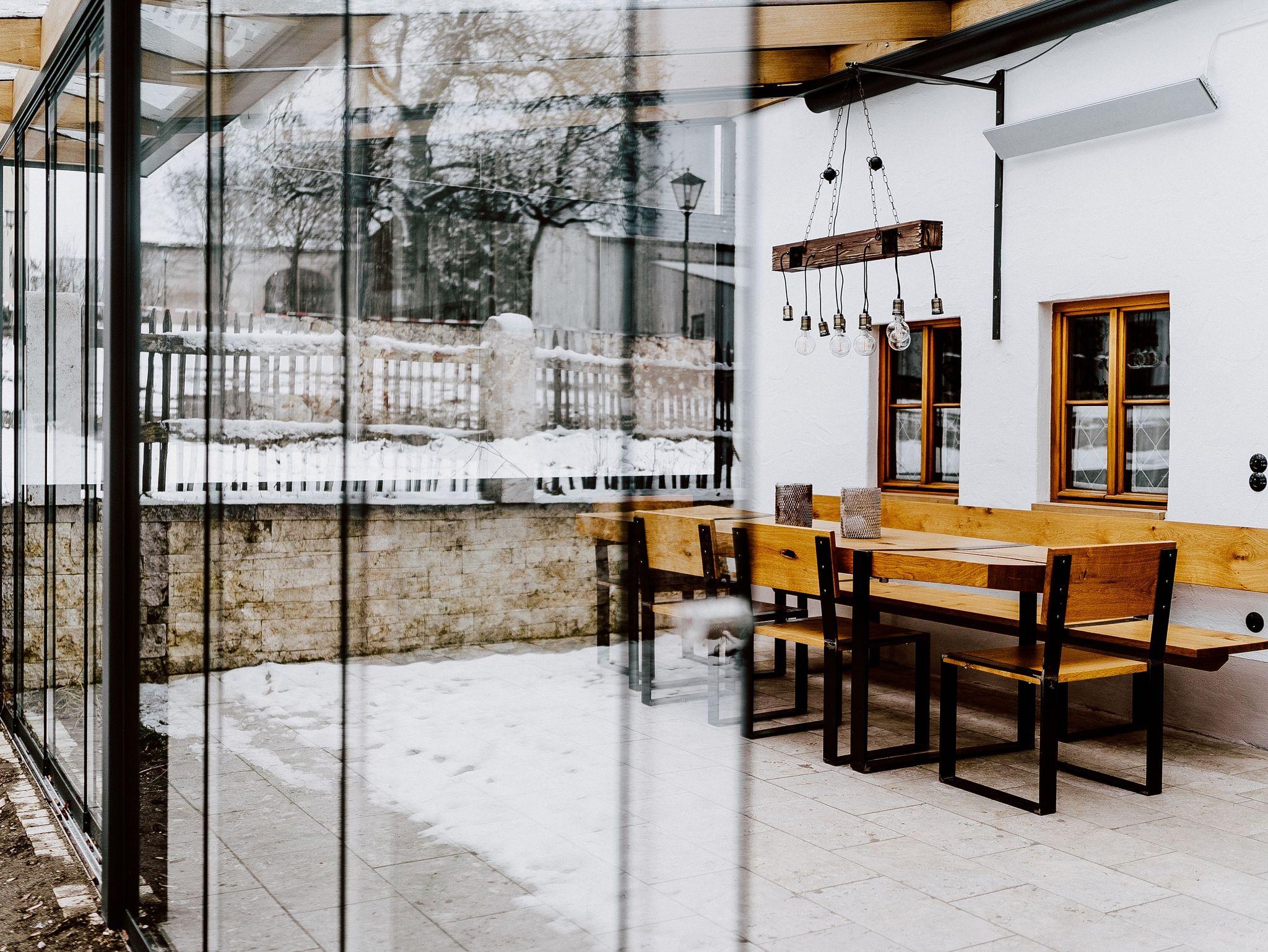 Damit sie die Abendstunden lange genießen können, ist die Terrasse mit einem Deckenheizer und Glas-Schiebe-Elemente ausgestattet.