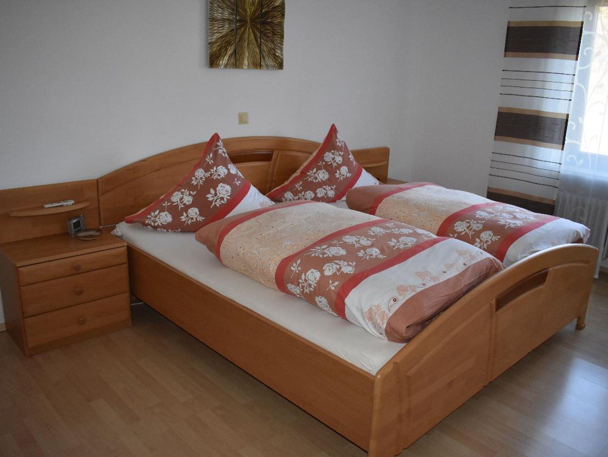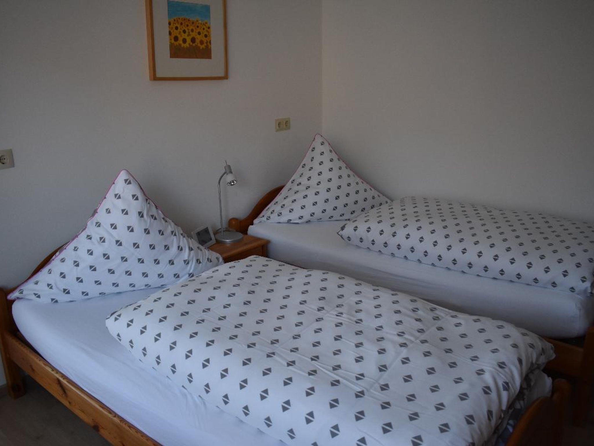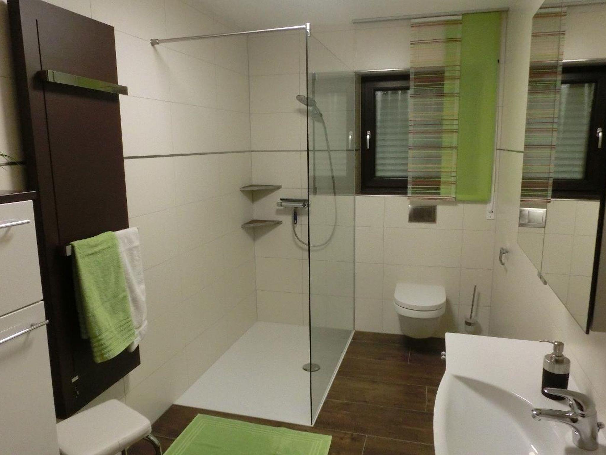 Unsere Ferienwohnung (85qm) ist mit einem Schlafzimmer mit einem Doppelbett und einem Schlafzimmer mit zwei Einzelbetten ausgestattet. Die Wohnküche mit voll ausgestatteter Küchenzeile (Kühlschrank mit Gefrierfach, Kaffeemaschine, Toaster, Eierkocher, Wasserkocher, Backofen), Polster- und Essecke, Flachbild-TV, Internetradio lädt zu gemütlichen Runden ein. Das Bad verfügt über ein barrierefreie Dusche, WC und Handtücher. Bettwäsche ist vorhanden. Ausserdem steht Ihnen eine überdachte Terasse mit Gartenmöbel zur Verfügung. Für Behinderte geeignet.