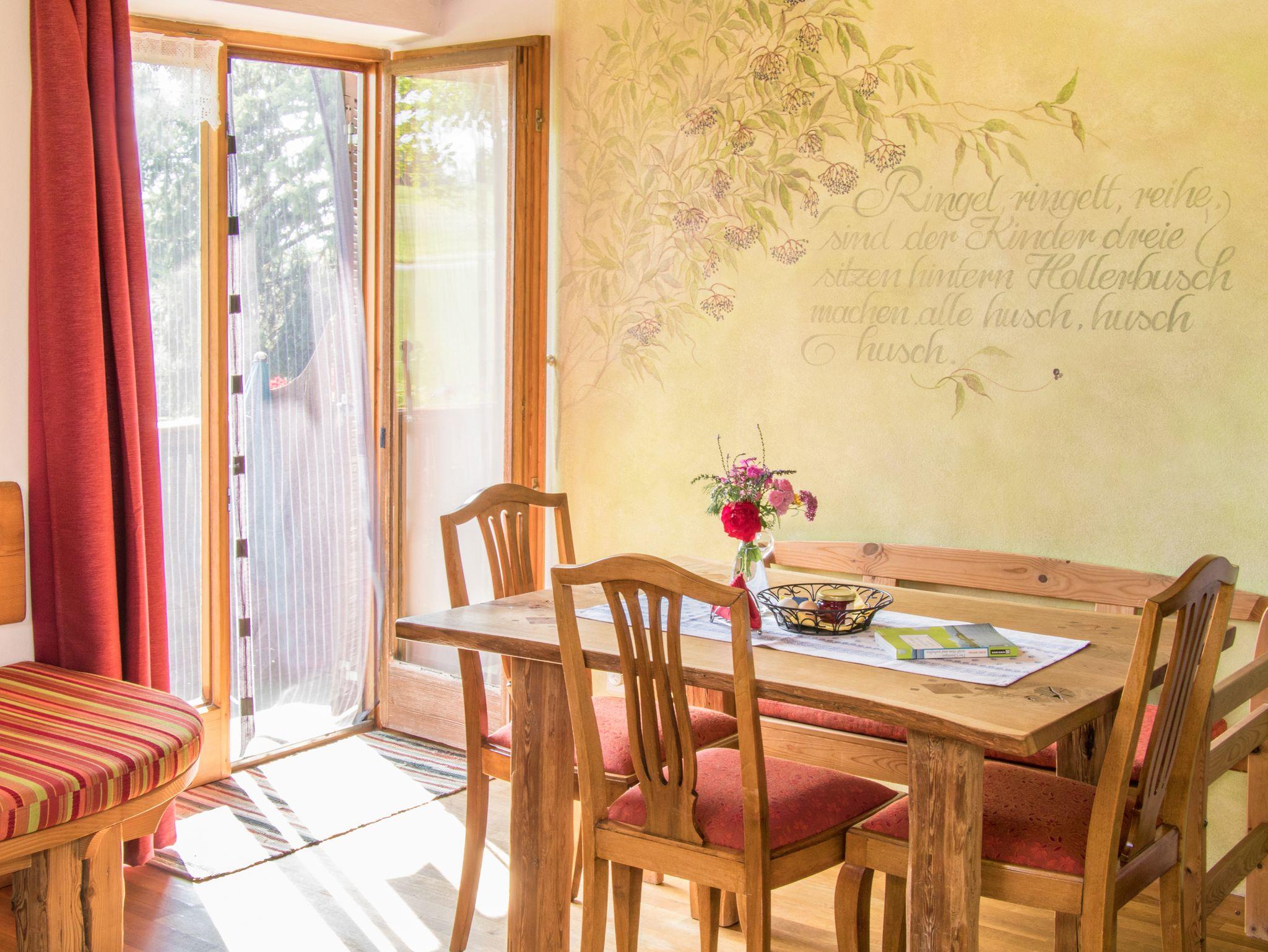 Ein schöner Holztisch lädt zum Frühstück ein oder Sie genießen das Frühstück auf dem Balkon, mit Aussicht auf die Kirche und die Berge.
