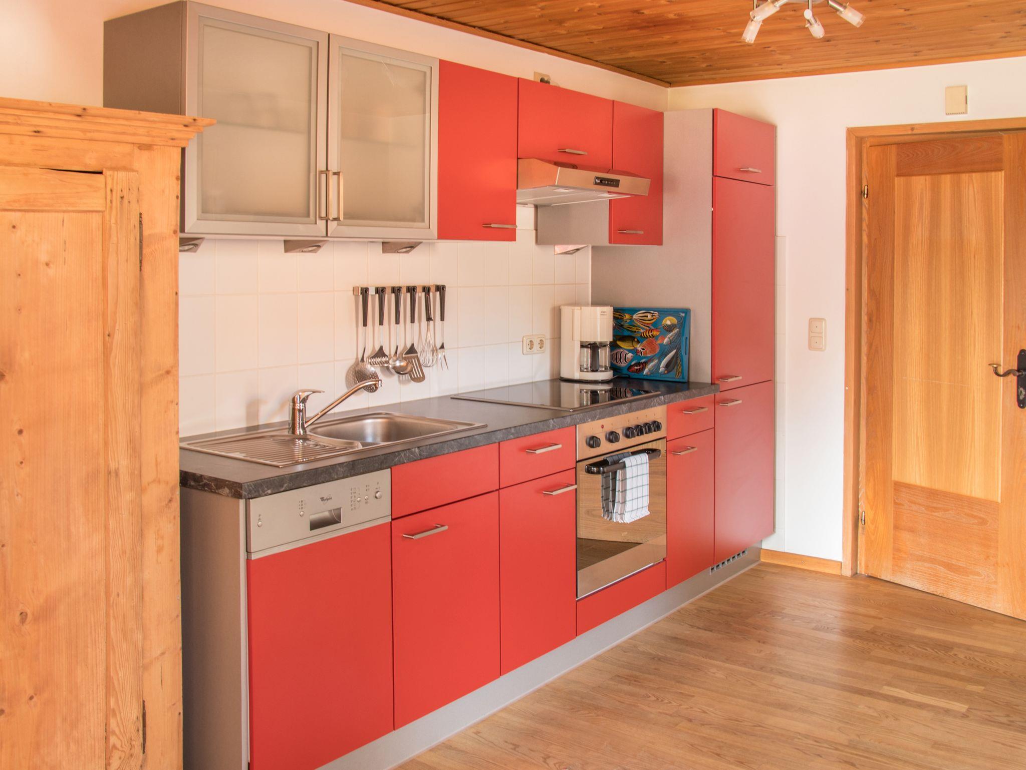 Das 1 Raum Appartement Bernadette liegt im Dachgeschoß und hat eine komplett ausgestattete Küche mit Backofen, Spülmaschine, Toaster, Wasserkocher und eine Kaffemaschine.