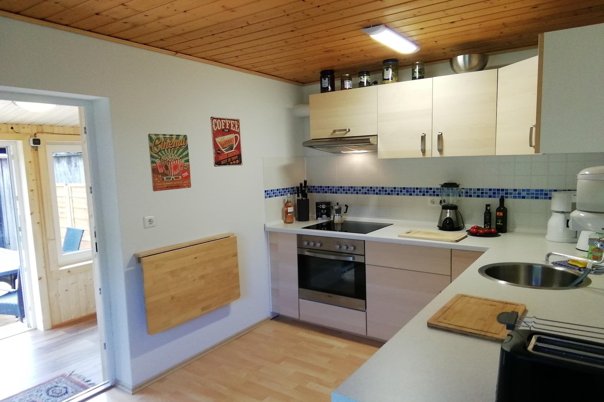 Stueetage: (Indgang , gang, Køkken(elkedel, brødrister, komfur(Komfur med fire kogeplader, glaskeramisk), kaffemaskine(kaffetragt), ovn, opvaskemaskine , køleskab(+ fryser), fryser), stue / spisestue(Fjernsyn(fladskærm, parabol), kakkelovn(træ), sofahjørne), toilet(håndvask)) Loft: (soveværelse(dobbeltseng(180 x 200 cm)), soveværelse(køjeseng), svalegang soveværelse(enkeltseng, enkeltseng, enkeltalkove), badeværelse(badekar med bruser, bruser, 2x håndvask, toilet, bidet)) varme(central, gas), terrasse(privat, 16 m2), have(privat, indhegnet, 1200 m2), havemøbler, grill(trækul), 2x parkering, dam, liggestole, bordfodbold, barnestol, Håndklæder/sengelinned (inkl.)