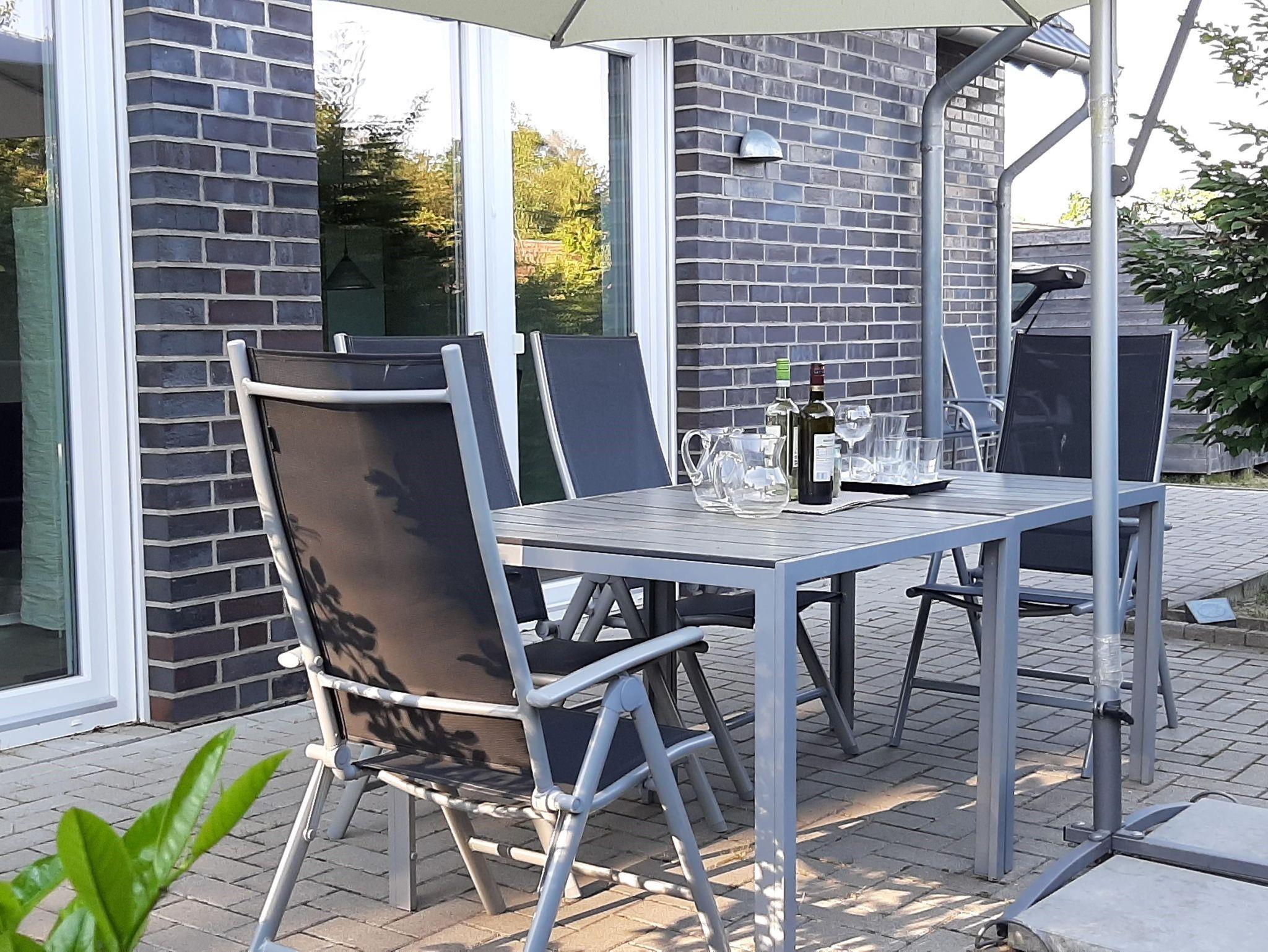 Der Außenbereich der Ferienunterkunft umfasst eine Terrasse in Südrichtung mit Sonnensegel oder einem Sonnenschirm, Gartenmöbeln, Grill, einen kleinen Garten, einen Stellplatz für das Auto sowie eine Unterstellmöglichkeit für Fahrräder.