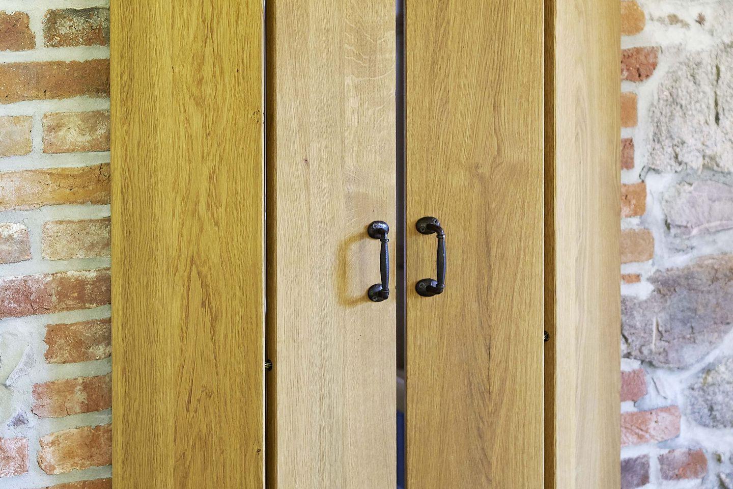 Zur Ausstattung gehören ein Schlafzimmer mit 2 Betten und eine urige Schlafgalerie mit 2 Betten, aus massivem Eichenholz aus dem benachbarten Wald gebaut. Ein großzügiger, lichtdurchfluteter Wohnbereich mit innenliegender Feldsteinmauer, holzbefeuertem Kaminofen, Smart-TV, Musikanlage, Essecke, gemütlichem Ecksofa, Bad mit bequemer, bodengleicher Dusche und WC, hochwertig ausgestattete Einbauküche mit Geschirrspüler, Herd und Backofen, Kühlschrank mit Tiefkühlfach und Waschmaschine gehören zur modernen Ausstattung. Eine überdachte Südterrasse mit Liegestühlen und Gartenmöbeln sowie ein eigener Garten laden zum Entspannen in der Natur ein.