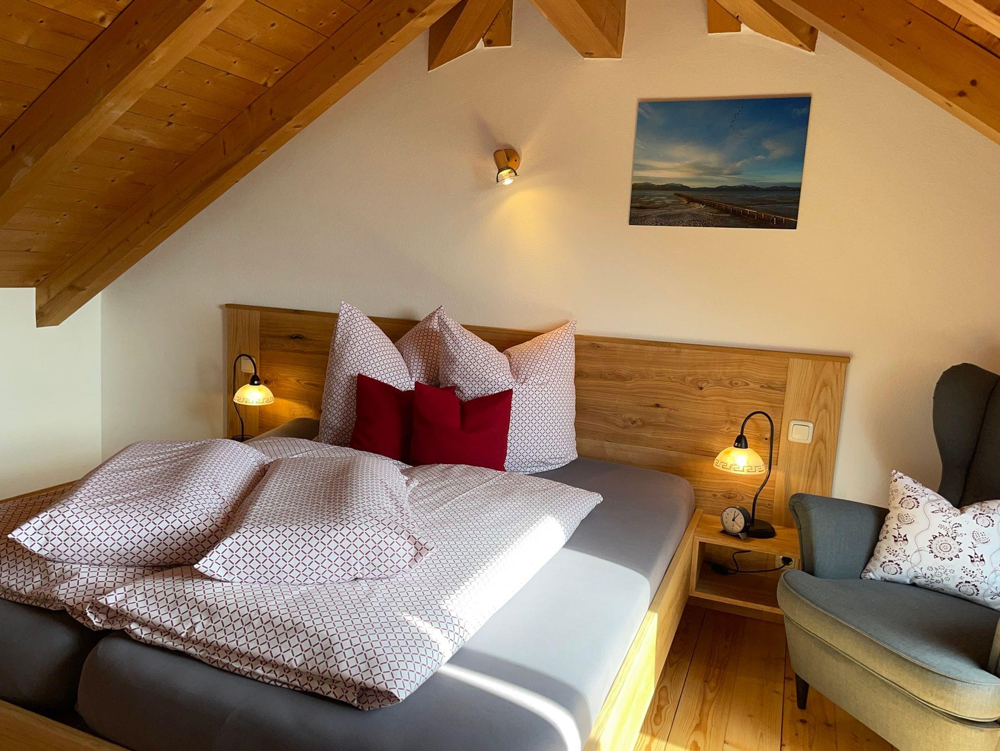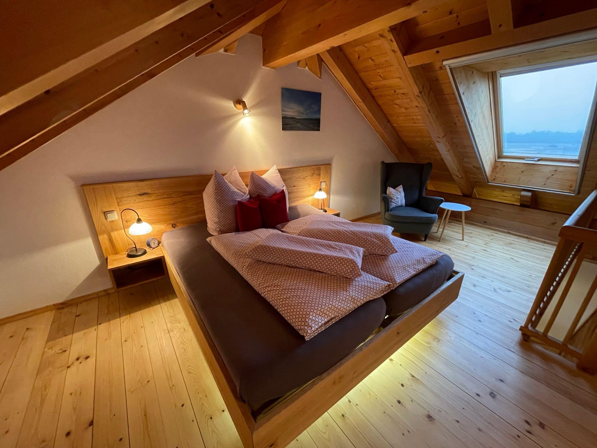 Die etwa 48 qm große Ferienwohnung ist durch eine Schlafgalerie räumlich getrennt und befindet sich im 2. Stock des See Cafe Toni, ein einzelstehendes Landhaus am Nordufer des Chiemsees mit Blick über die Schafwaschener Bucht und die Chiemgauer Alpenkette.