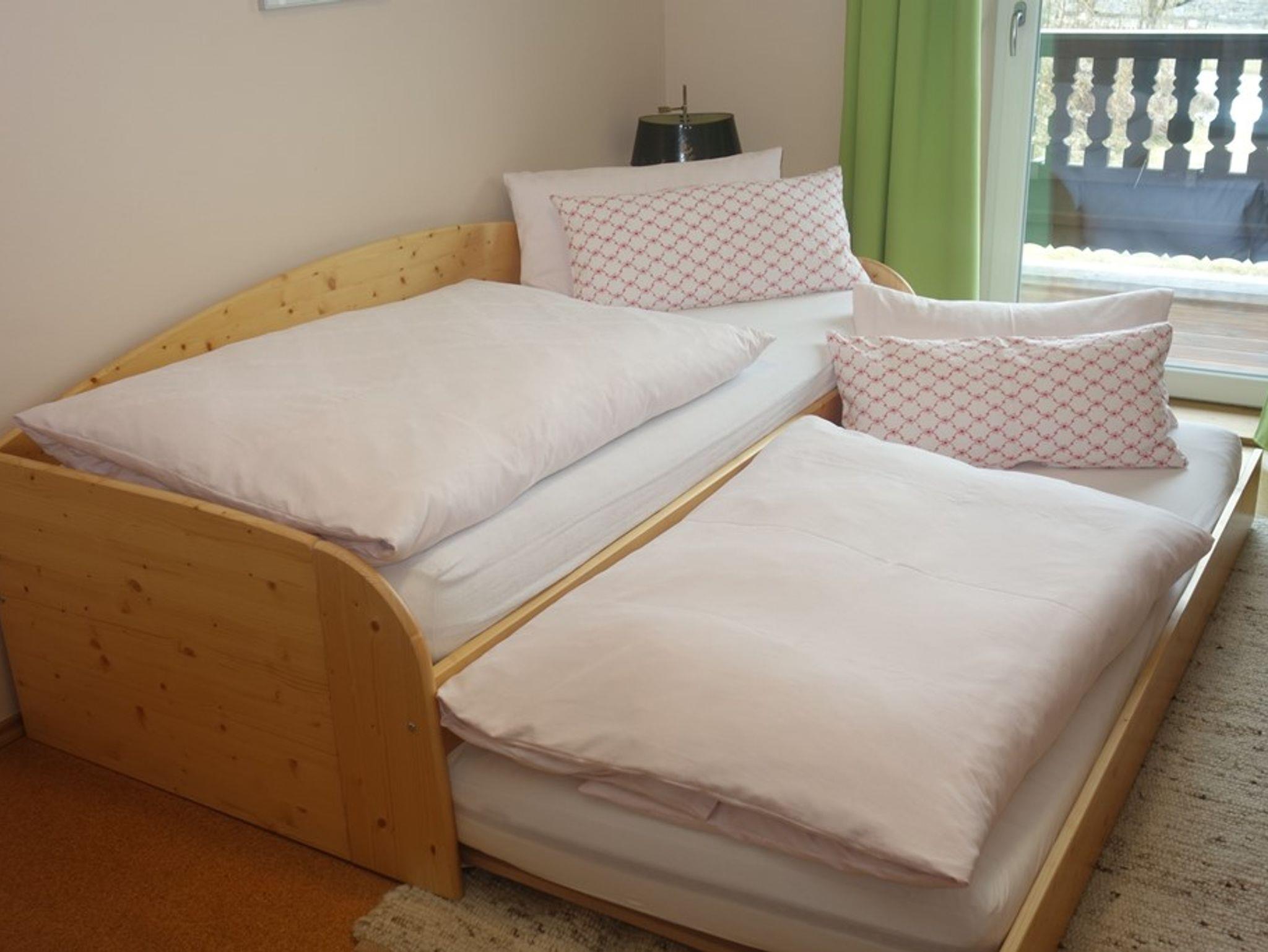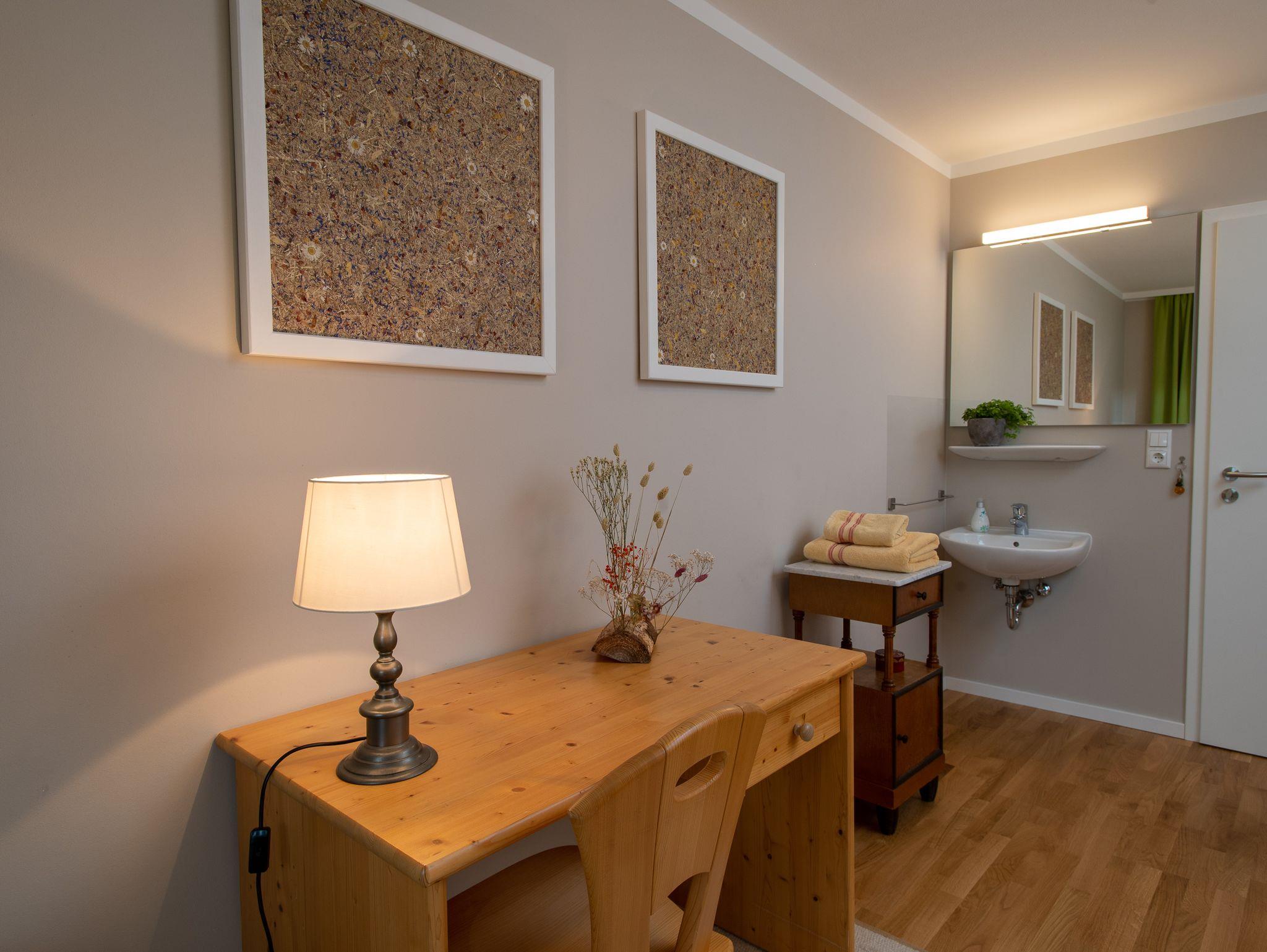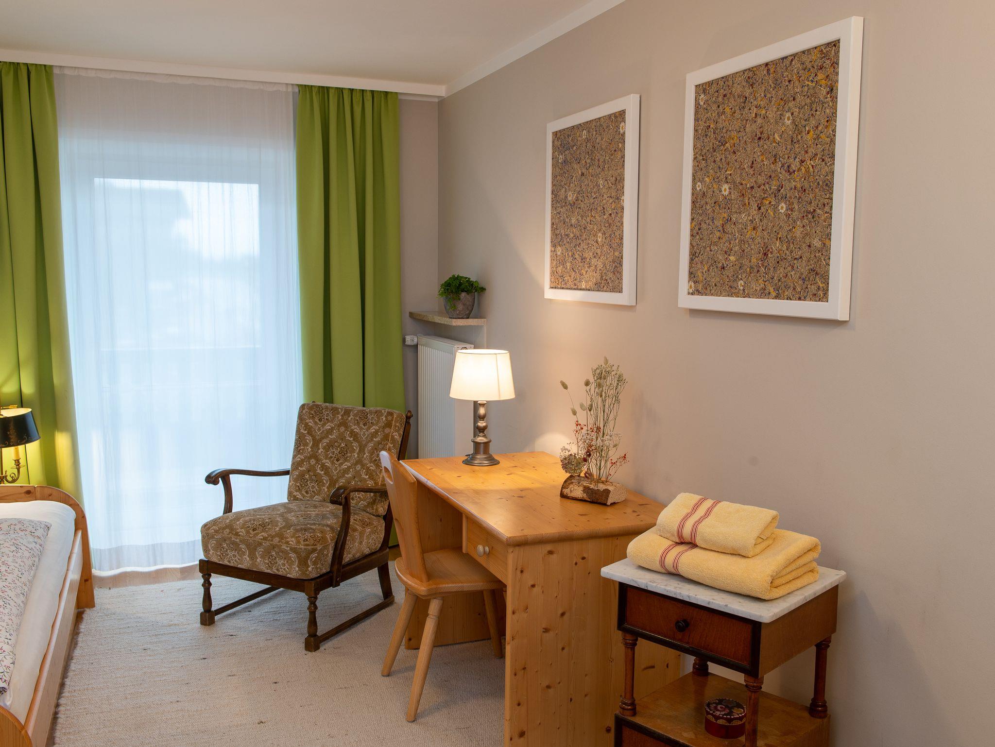 Einzelzimmer mit zusätzlichem Ausziehbett mit Ost-Balkon, ohne Frühstück, freies W-LAN, Waschbecken im Zimmer. Dusche und WC befinden sich auf der Etage und werden nur von den Gästen des Doppelzimmers bei zeitgleicher Belegung mitbenutzt. Bettwäsche, Handtücher, Balkonbestuhlung, auf Anfrage Kinderbett und Hochstuhl.