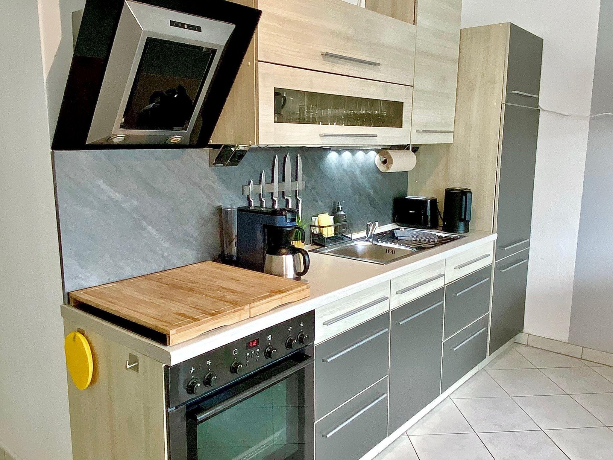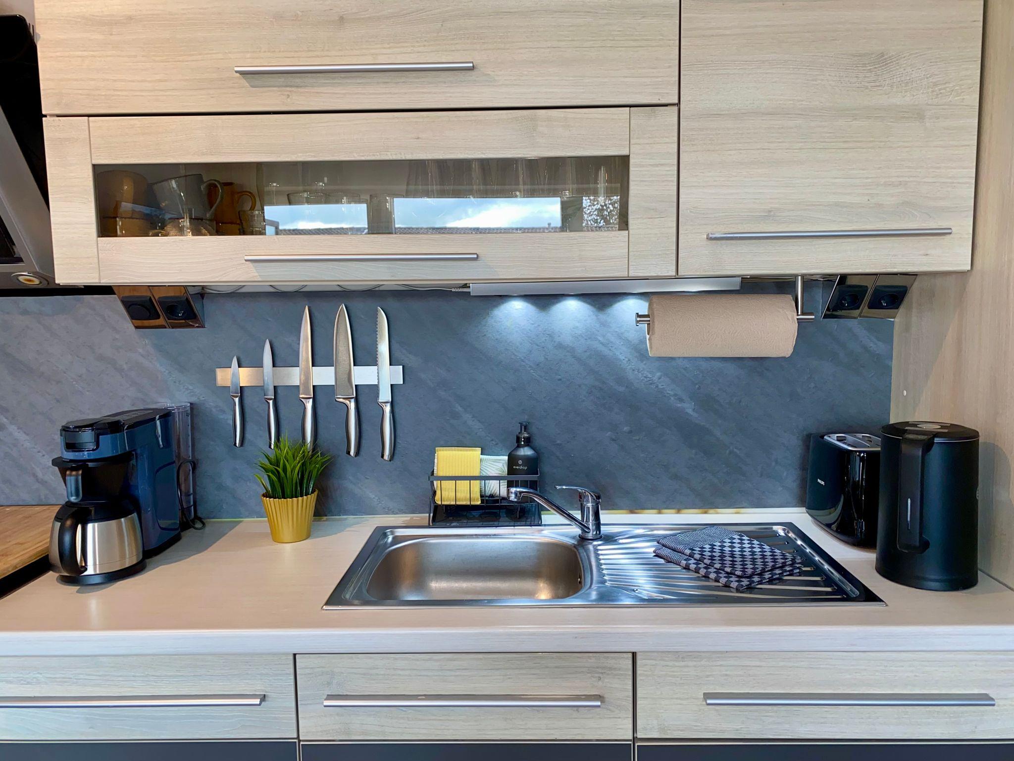 Die gut ausgestattete Küche bietet alles was man zur Zubereitung leckerer Mahlzeiten benötigt. 4 Ceran-Kochplatten, Backofen, Mikrowelle, Spüle, Kühlschrank und Spülmaschine gehören hier zu Grundausstattung.