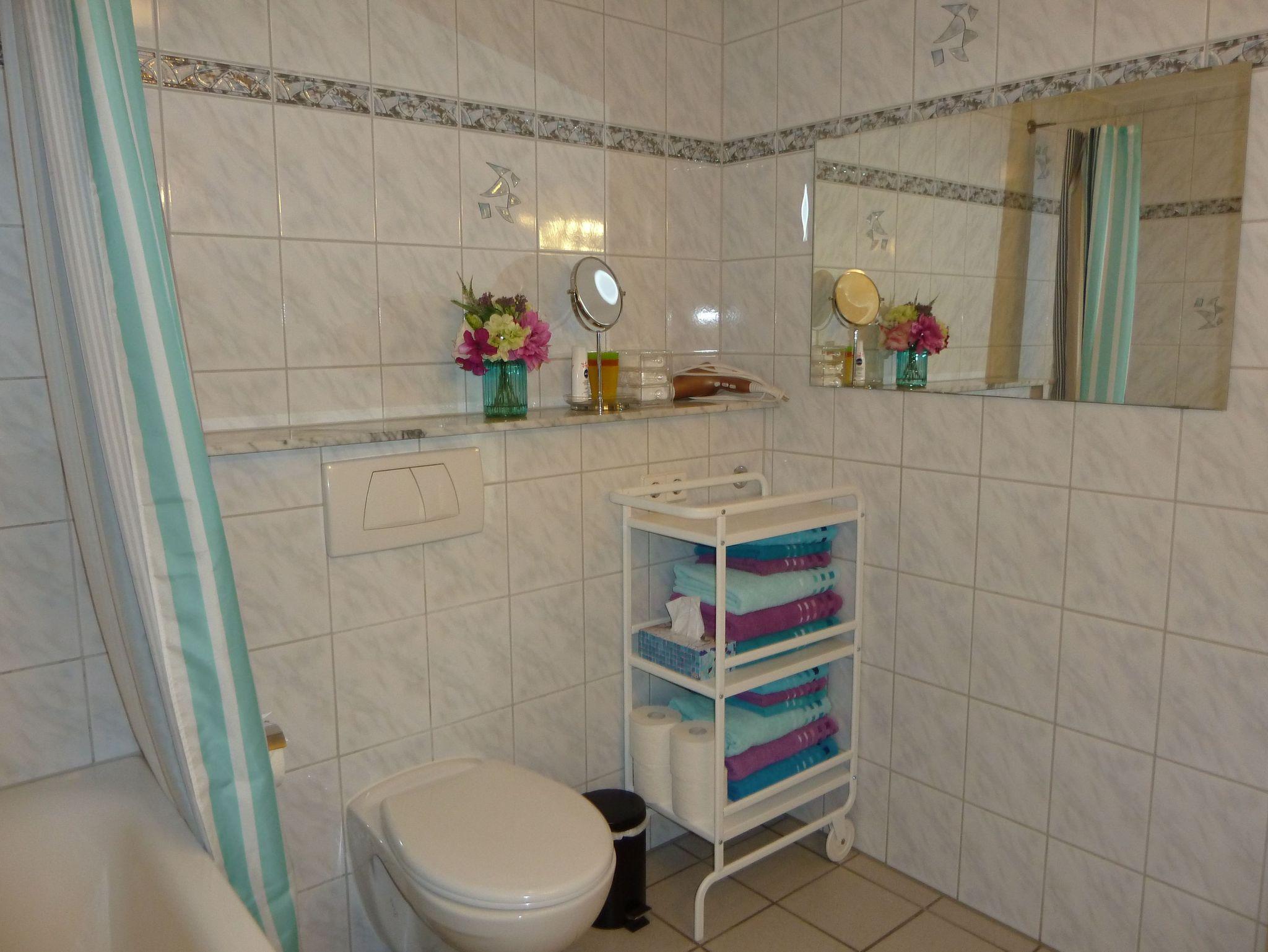 • das Badezimmer mit Wanne, Hand/ Duschtüchern, Fön und Badartikeln ausgestattet.