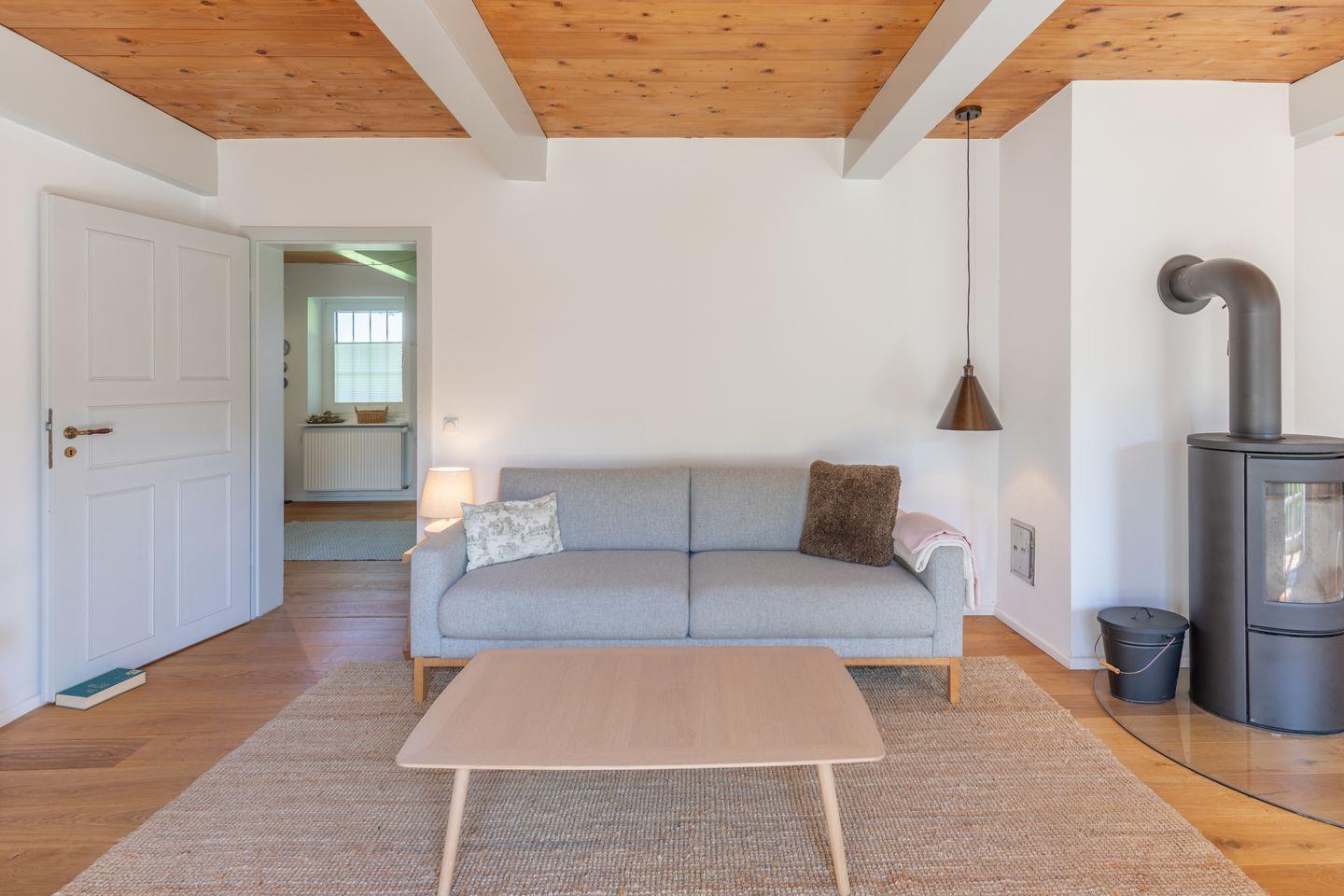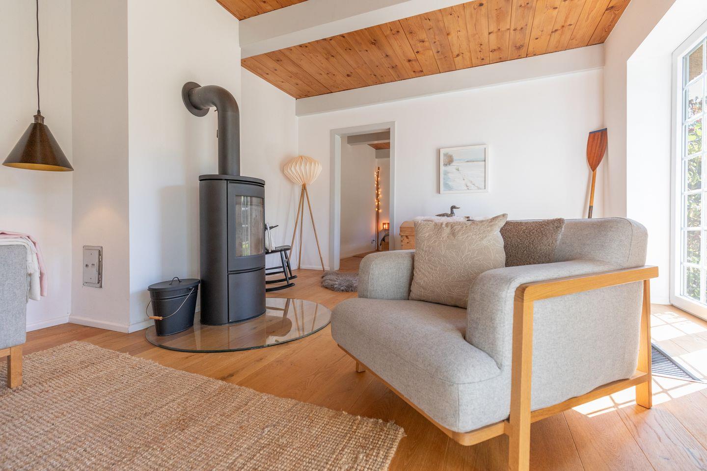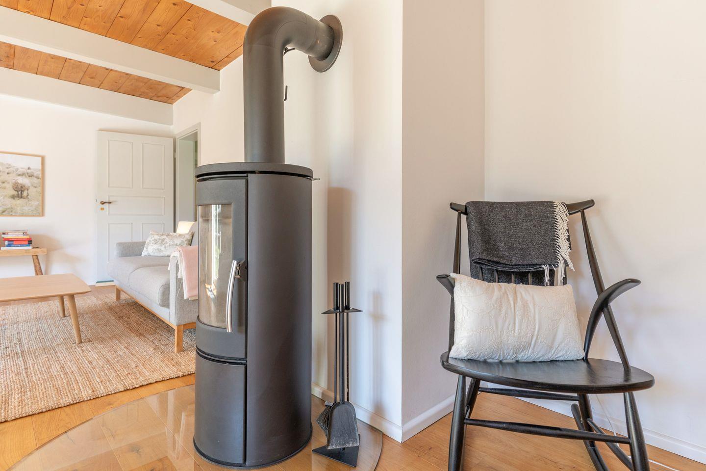 Das gemütliche Wohnzimmer ist mit einem schwedischen Holzofen ausgestattet und lädt zu entspannten Abenden bei knisterndem Kaminfeuer ein. Von hier aus haben Sie direkten Zugang zur sonnigen Westterrasse, wo Sie die Weite der nordfriesischen Landschaft bei einem Glas Wein oder einer Tasse Tee genießen können. Das Schlafzimmer ist mit einem komfortablen Doppelbett (170 x 200 cm) und einem geräumigen Kleiderschrank ausgestattet, während das zweite Schlafzimmer ein Einzelbett (90 x 200 cm) sowie einen Schreibtisch mit Fernseher bietet – ideal für Gäste, die auch im Urlaub gelegentlich arbeiten möchten.