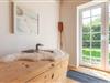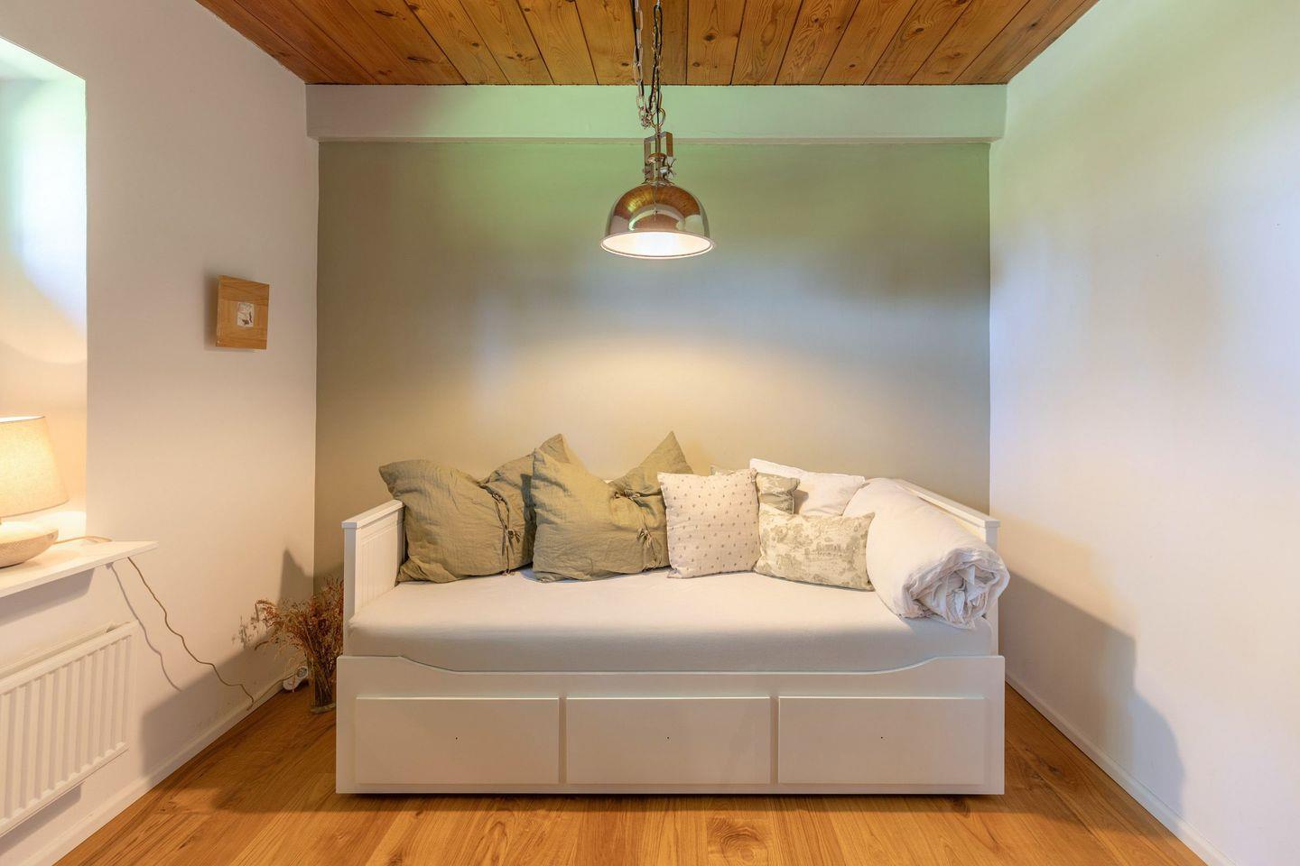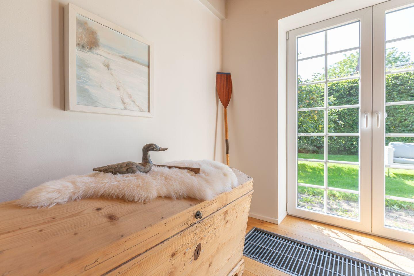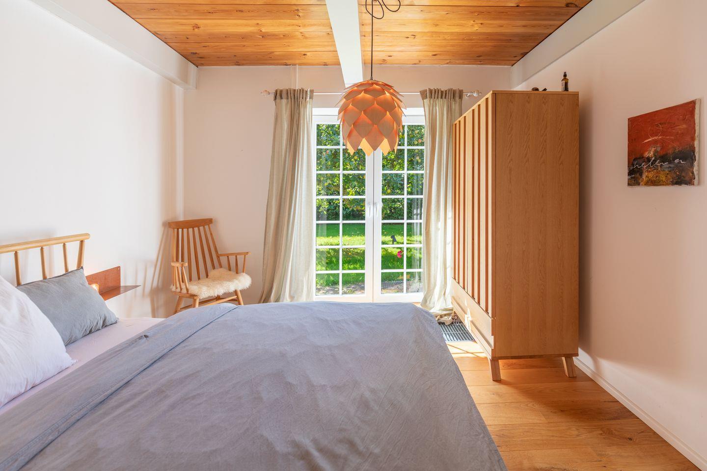Das gemütliche Wohnzimmer ist mit einem schwedischen Holzofen ausgestattet und lädt zu entspannten Abenden bei knisterndem Kaminfeuer ein. Von hier aus haben Sie direkten Zugang zur sonnigen Westterrasse, wo Sie die Weite der nordfriesischen Landschaft bei einem Glas Wein oder einer Tasse Tee genießen können. Das Schlafzimmer ist mit einem komfortablen Doppelbett (170 x 200 cm) und einem geräumigen Kleiderschrank ausgestattet, während das zweite Schlafzimmer ein Einzelbett (90 x 200 cm) sowie einen Schreibtisch mit Fernseher bietet – ideal für Gäste, die auch im Urlaub gelegentlich arbeiten möchten.