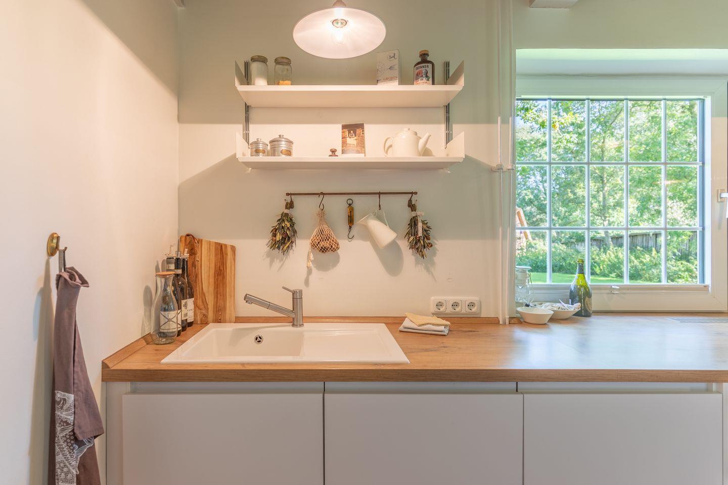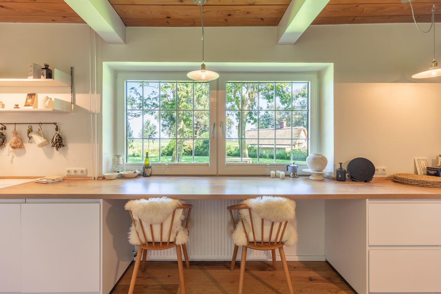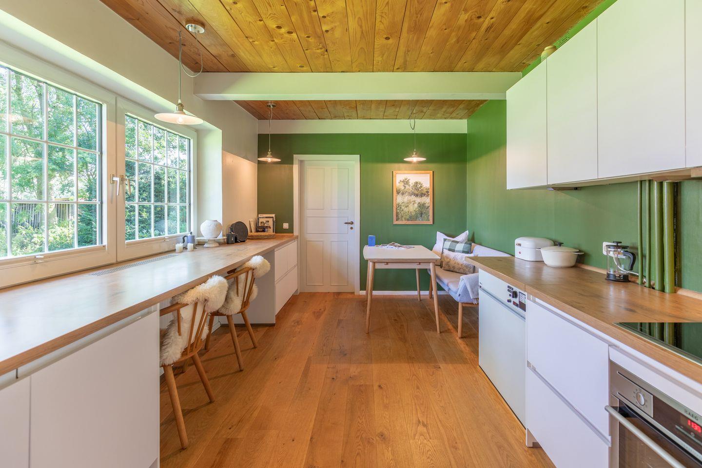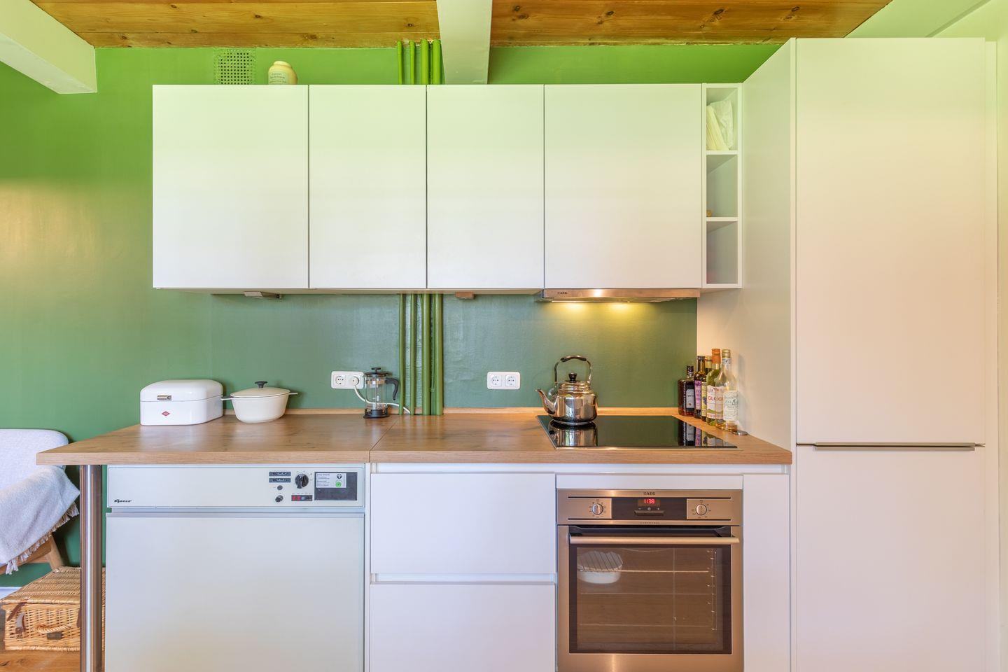 Die Ferienhaushälfte bietet eine umfassende Ausstattung für einen entspannten Urlaub. In der modernen Küche finden Sie einen Induktionsherd mit Dunstabzug, Backofen, Kühlschrank, Gefrierfach, Spülmaschine sowie eine Kaffeemaschine, Espressomaschine und einen Wasserkocher. Kochbegeisterte kommen hier voll auf ihre Kosten.