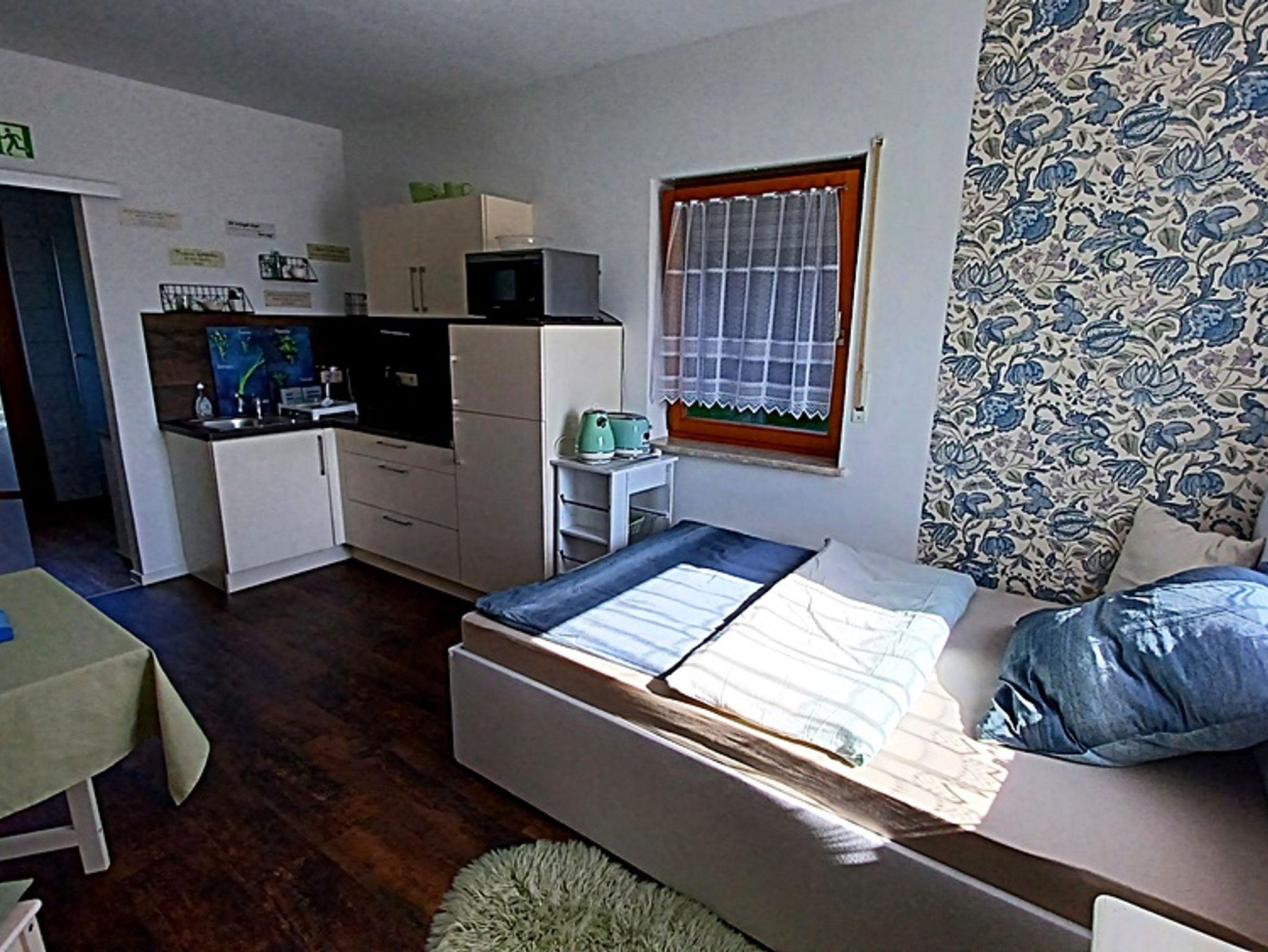 Frisch, einladend und flexibel! Im Erdgeschoss erwartet Sie unser kleines Apartment „Waldwinkel“ – perfekt für Singles, Paare, Eltern mit Kind, Geschäftsreisende oder Monteure. Das stilvoll gestaltete Zimmer bietet ein bequemes Bett (1,40 m), eine voll ausgestattete Küchenzeile und einen gemütlichen Essplatz.