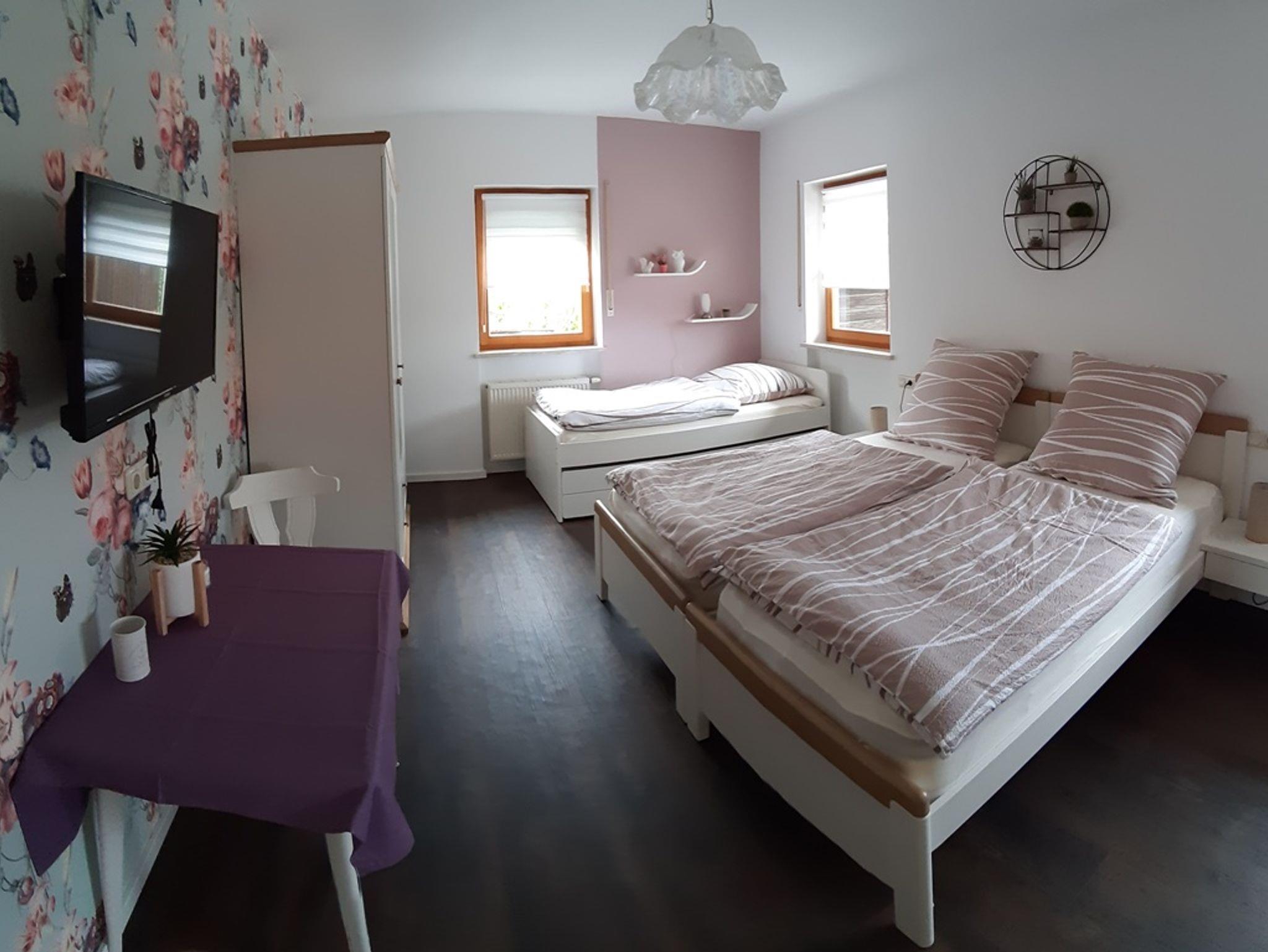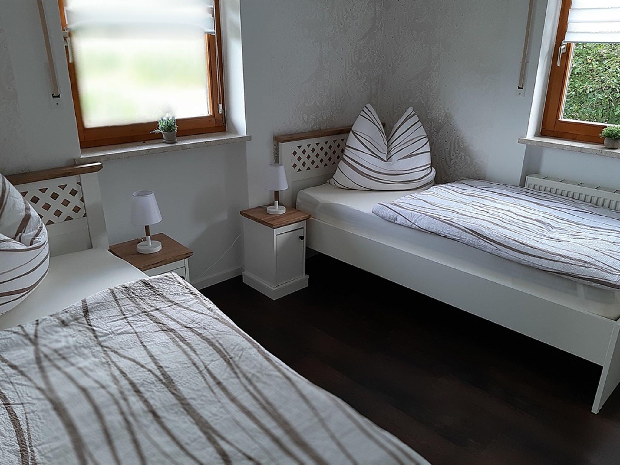 Sie reisen als Gruppe, Familie oder Monteurteam? In unserer modernen Wohnung „Waldblick“ im 1. Obergeschoss finden Sie zwei Schlafzimmer mit insgesamt fünf flexiblen Betten, die sich als Einzel- oder Doppelbetten nutzen lassen. In jedem Zimmer sorgt ein eigener Fernseher für entspannte Abende. Die voll ausgestattete Küche und der offene Essbereich laden zum gemeinsamen Kochen und Verweilen ein. Und das Beste: Auf der großen Dachterrasse mit traumhaftem Weitblick können Sie wunderbar entspannen, lesen oder die Sonne genießen.