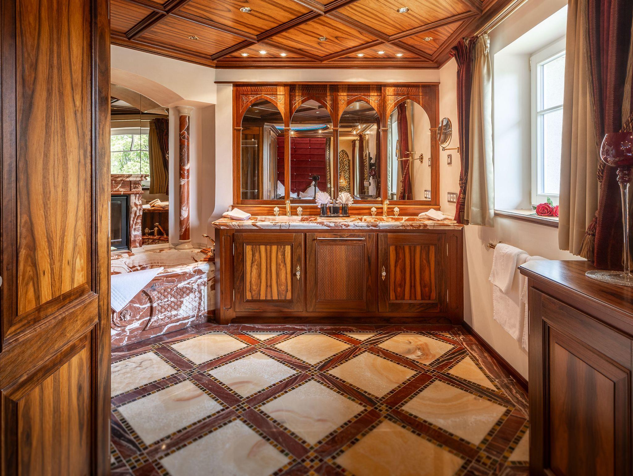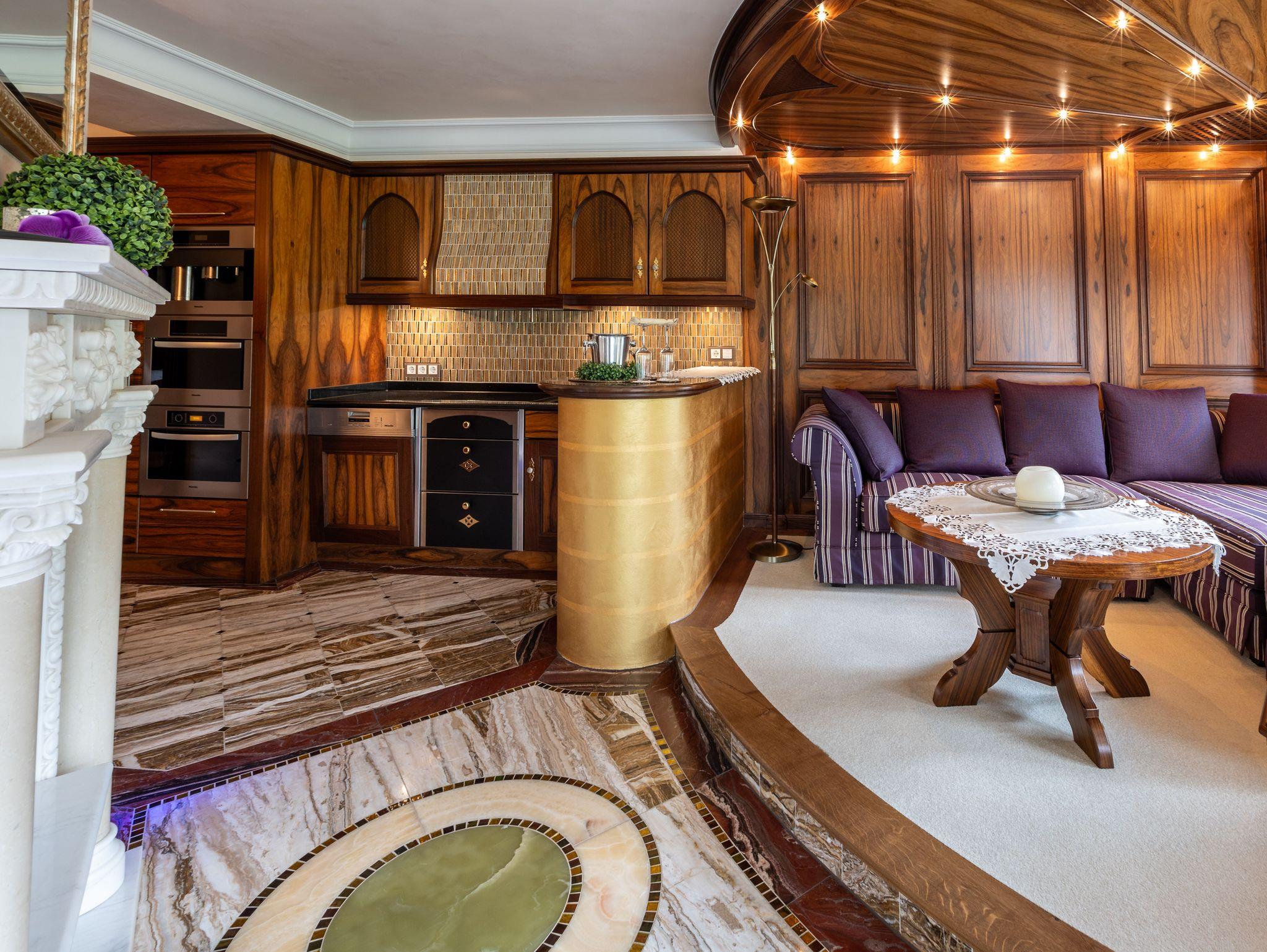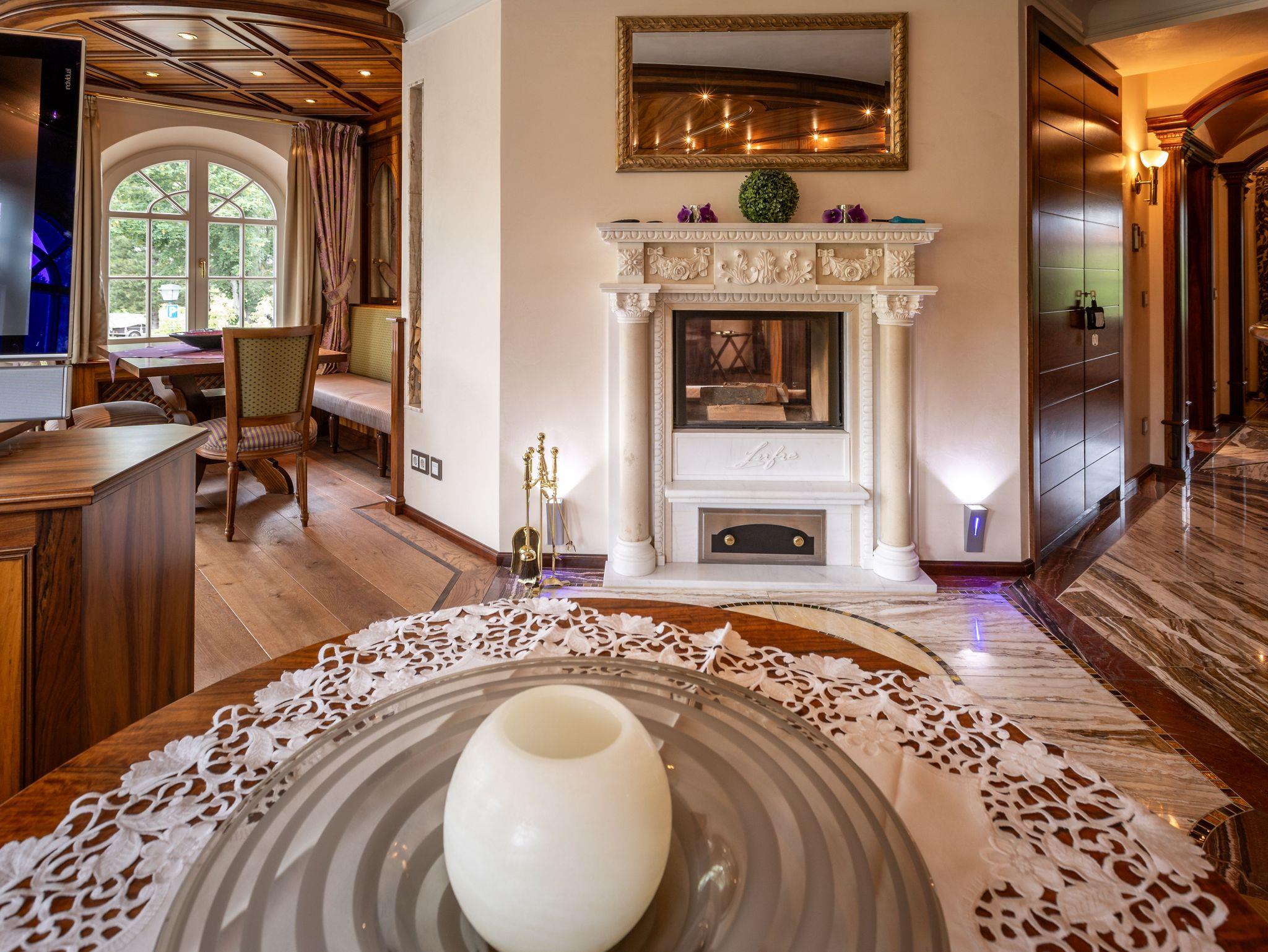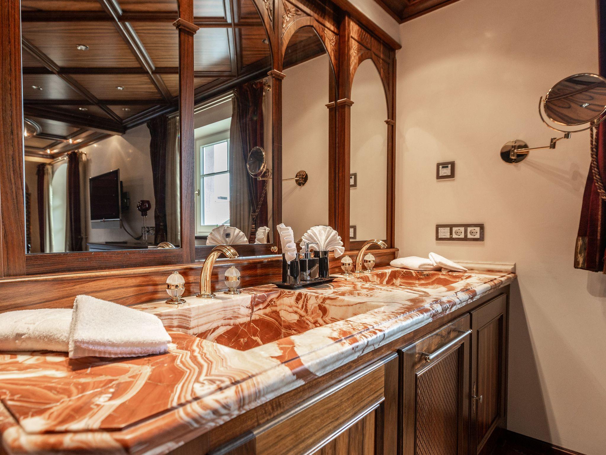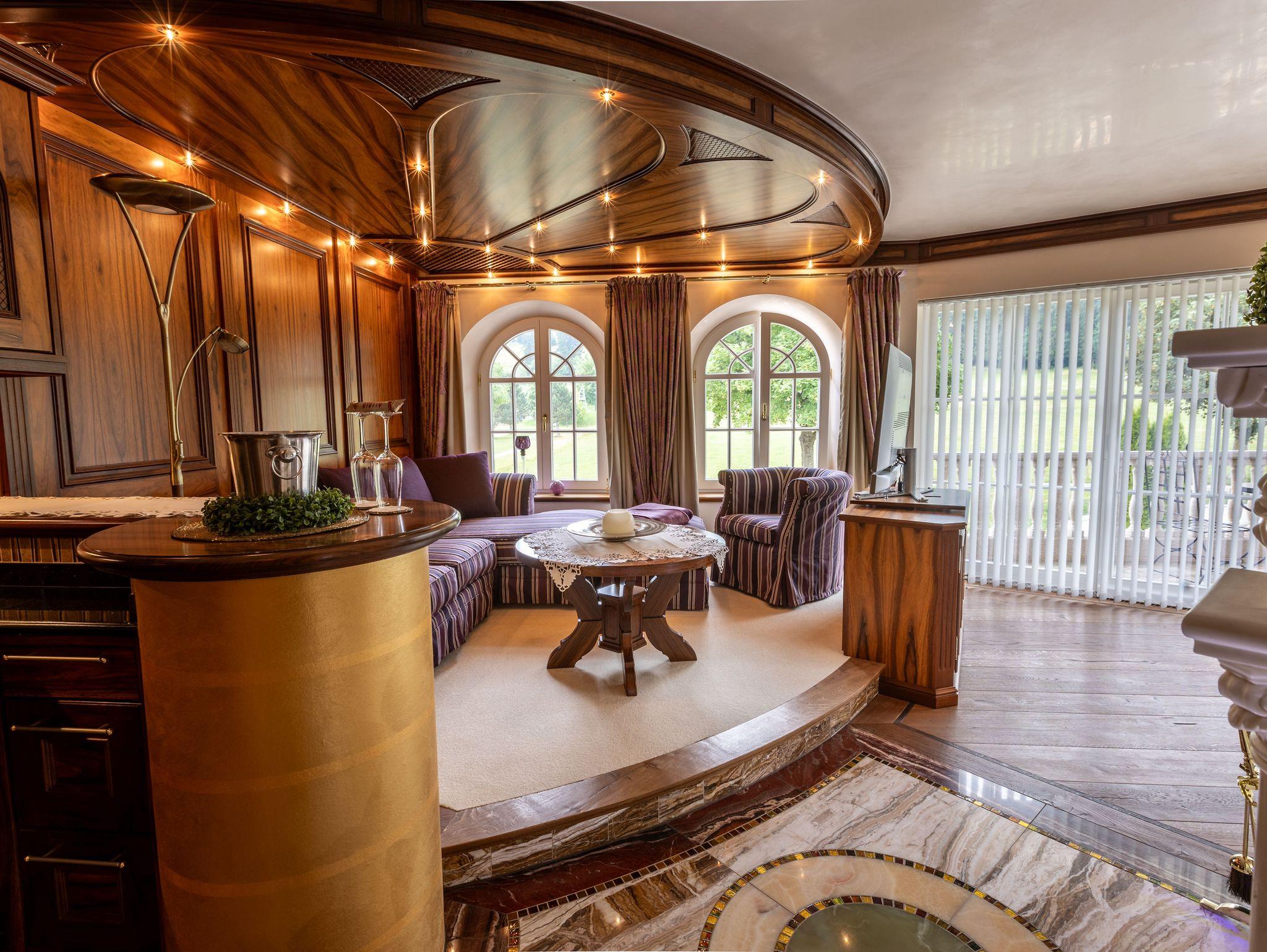 Die Einrichtung der Suite ist im klassischen König-Ludwig-Stil gehalten und verbindet traditionelle Elemente mit modernem Komfort.