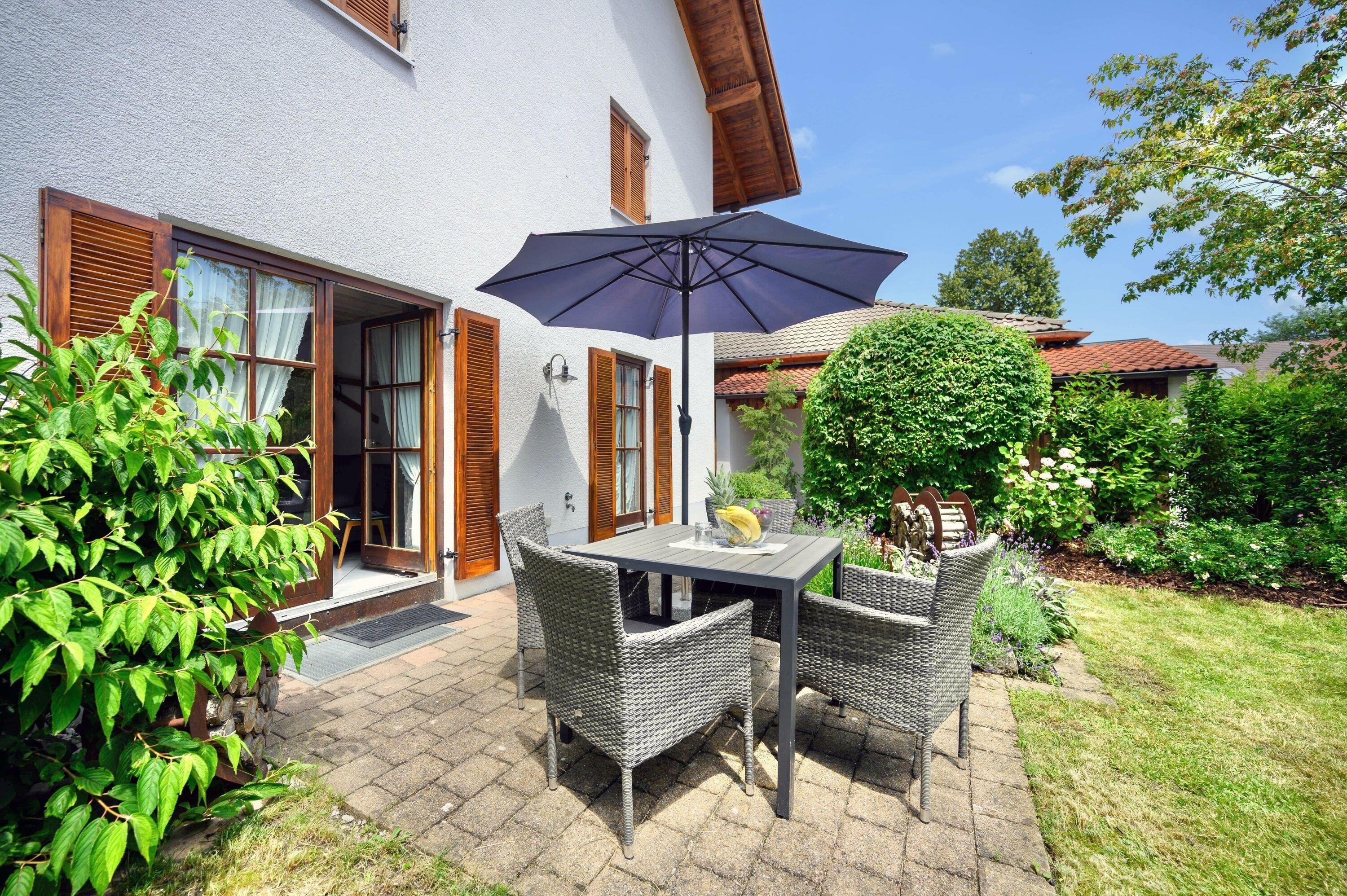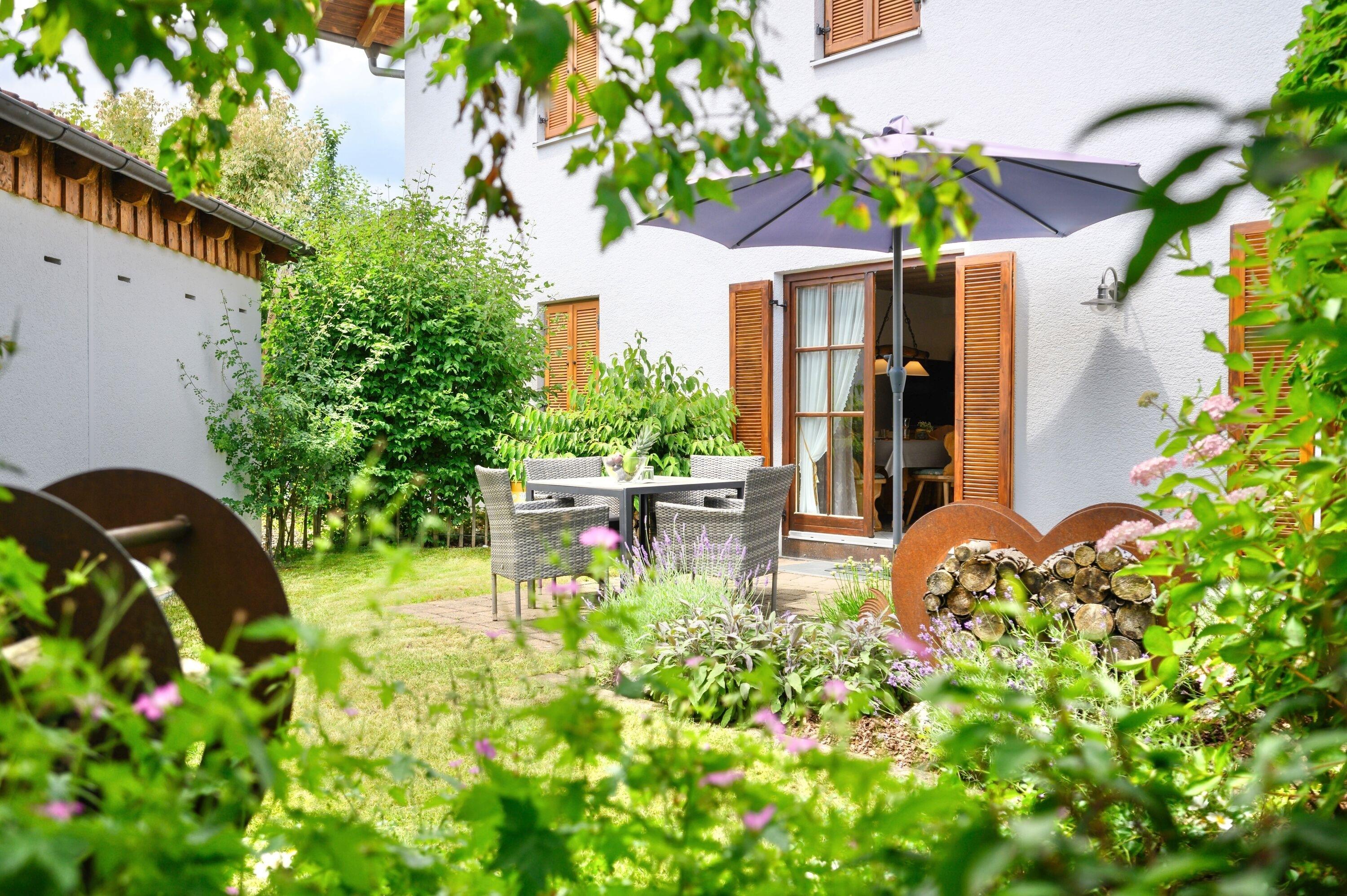 Ein besonderes Highlight ist der private Garten mit Terrasse zur Alleinnutzung. Vom Wohn- und Schlafzimmer gelangen Sie direkt ins Grüne. Hier erwarten Sie eine Ess-Sitzgruppe, bequeme Liegemöbel mit Polsterauflagen sowie ein kleines Kräuterbeet. Ein reservierter Parkplatz direkt am Haus und eine Fahrrad-Unterstellmöglichkeit sind ebenfalls vorhanden. Für unsere kleinen Gäste stellen wir auf Wunsch ein Baby Reisebett mit Bettwäsche, einen Hochstuhl und Spielzeug bereit.