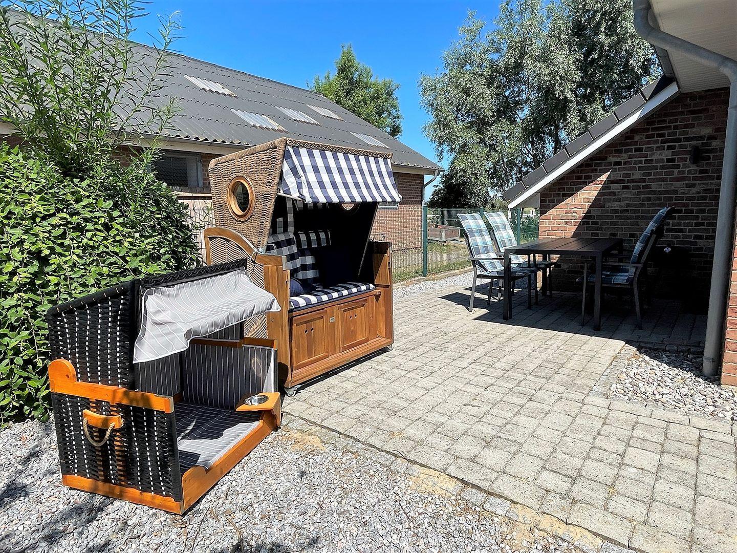 Die große Terrasse lädt dazu ein, die frische Luft zu genießen und entspannende Stunden im Freien zu verbringen. Gartenmöbel stehen bereit, damit Sie bei einem Grillabend am kohlebetriebenen Grill das Zusammensein feiern können. Der große, auf einer Höhe von 1,20m eingezäunte Garten bietet viel Platz zum Spielen für die Kinder. Der Strandkorb für Gäste und ein eigener Strandkorb für den Hund sorgen für Gemütlichkeit und Ruhe. Hier können Ihre Kinder sorglos spielen, während Sie die Natur in voller Pracht erleben. Die ruhige und ländliche Lage garantiert erholsame Tage abseits des hektischen Lebens.