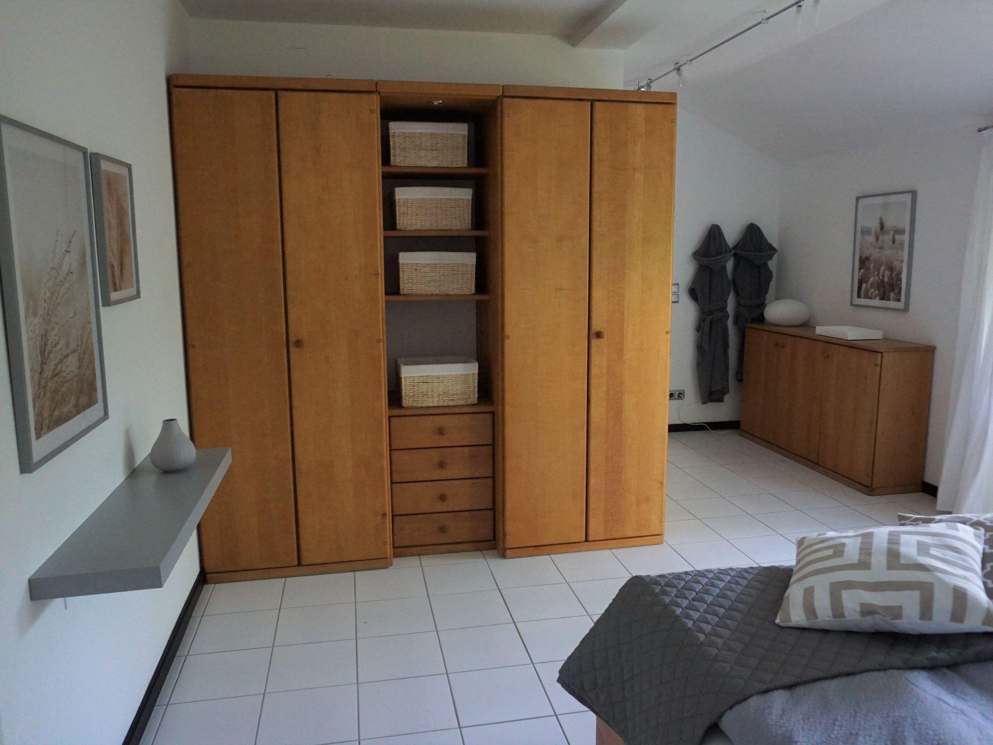 Two bedrooms also lead off this open-plan area. The first bedroom is equipped with a TV and real wood furniture in a country house style and leads to the bathroom with a free-standing bathtub and walk-in rain shower.