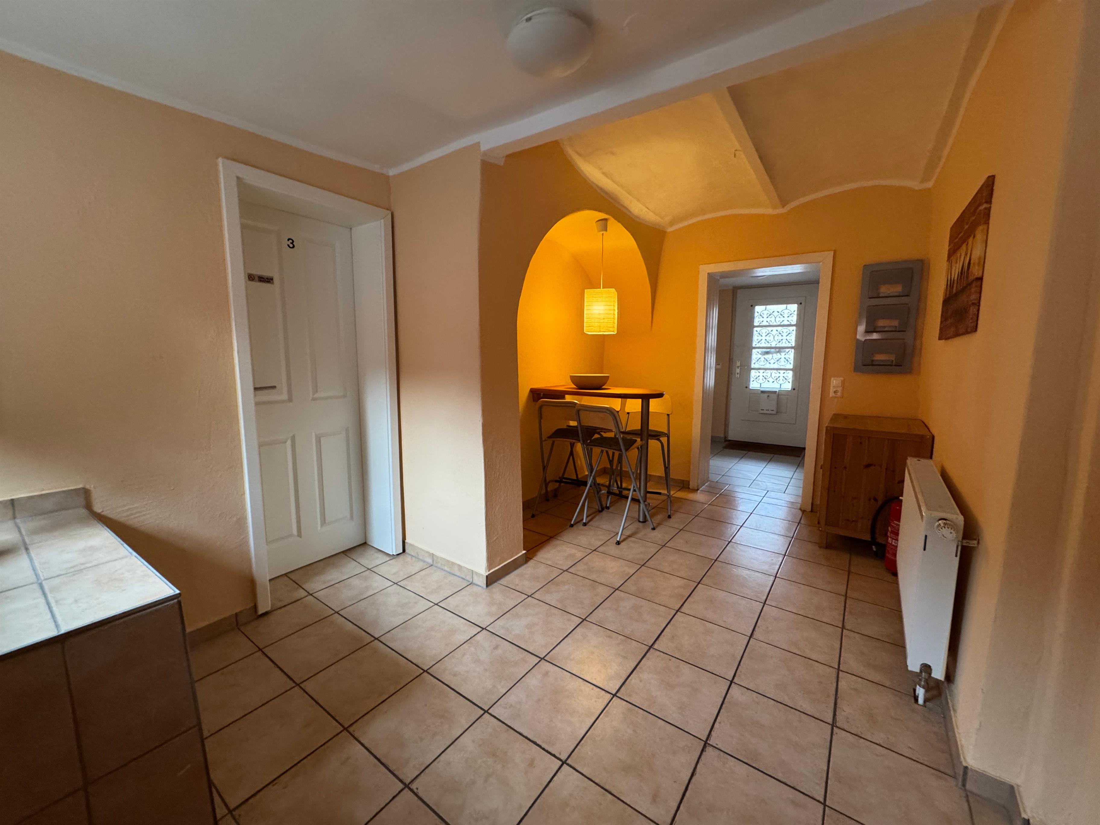 Im Gemeinschaftsbereich finden Sie eine voll ausgestattete Küche mit Kaffeemaschine, Toaster und allem Nötigen für die Zubereitung Ihrer Mahlzeiten. Der angrenzende kleine Sitzbereich im Flur lädt zum Verweilen ein.