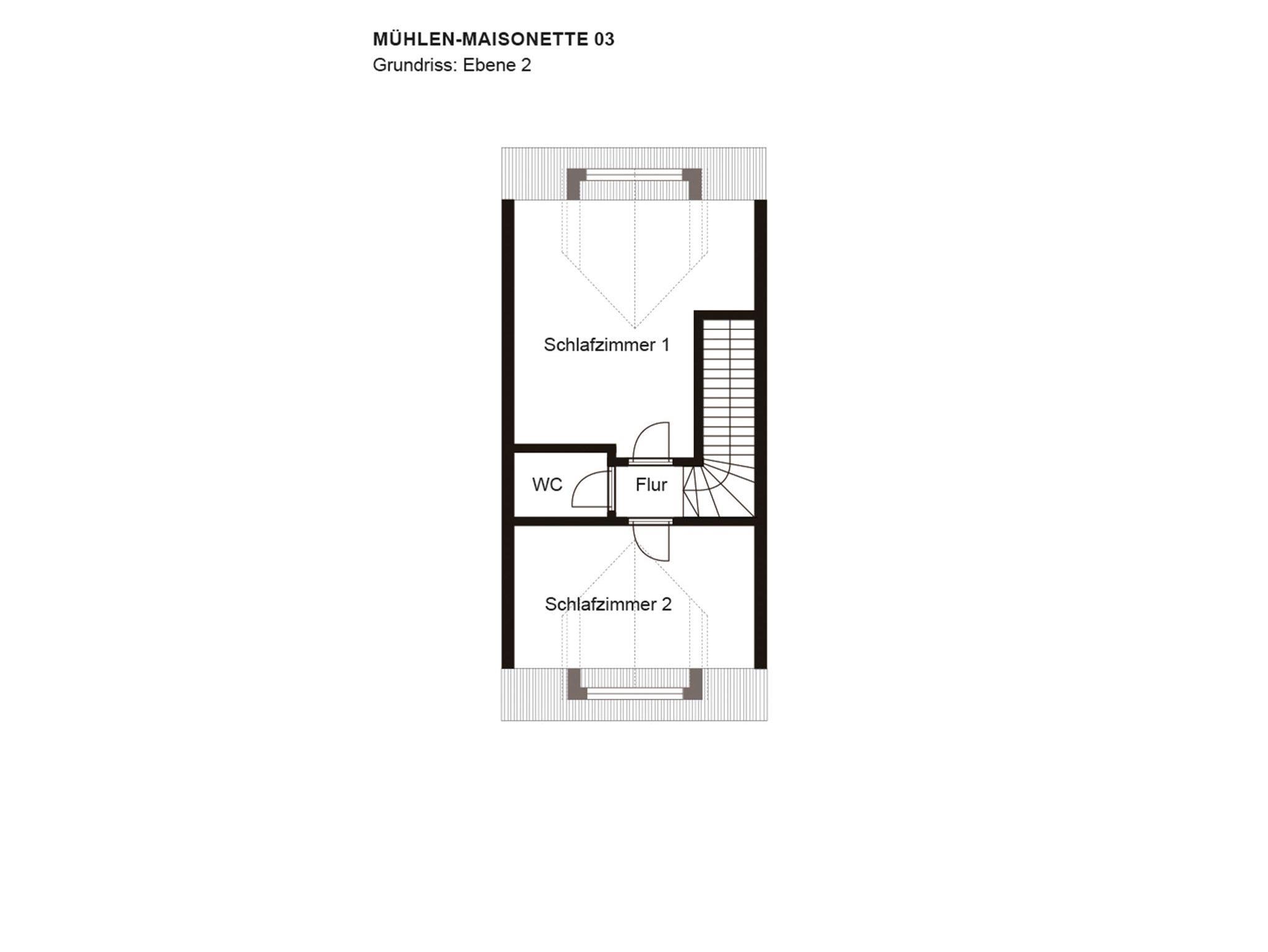Die Mühlen-Maisonette Wohnungen sind über einen überdachten Laubengang erschlossen. Jede Wohnung verfügt über einen eigenen Zugang direkt zum Laubengang und einen direkt am Laubengang positionierten Parkplatz.