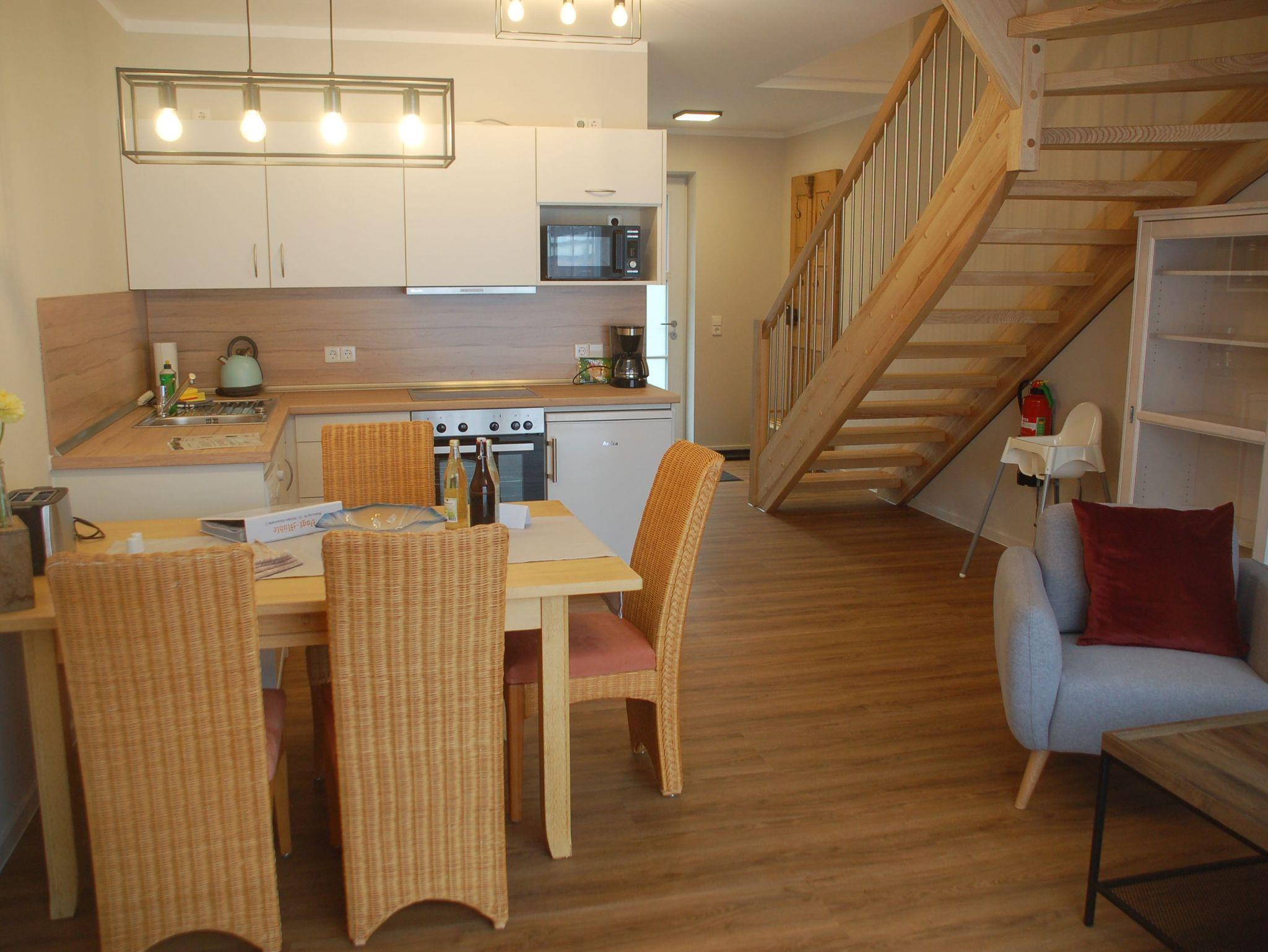 Die Maisonette Wohnungen erstrecken sich über zwei Ebenen. Im unteren Bereich befindet sich ein großzügiges Badezimmer mit schwellenloser Dusche und WC. Der große Wohn-/Essbereich ist mit einer komplett ausgestatteten Küchenzeile, einem großen Esstisch und einer gemütlichen Couch bestückt. Ein terrassenähnlicher Balkon in Süd-/West-Ausrichtung rundet die hervorragende Ausstattung ab und lädt sowohl zum Sonne genießen als auch zum Essen im Freien ein. Über eine bequem begehbare Holztreppe aus heimischem Ahorn erreichen unsere Gäste die im oberen Bereich gelegenen zwei Schlafzimmer sowie das separate WC.
