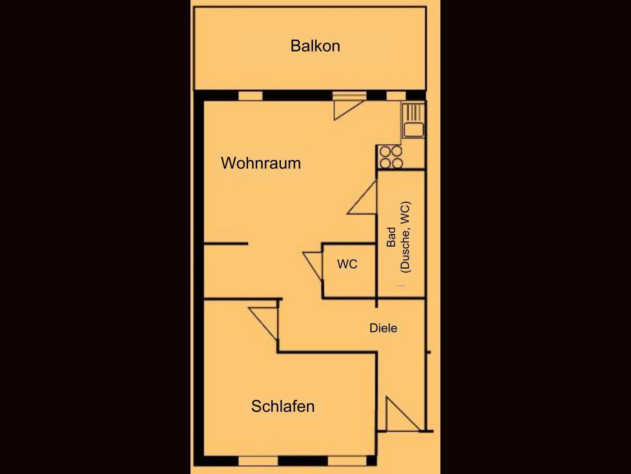 1 Schlafzimmer mit Zustellbett für 1 Kind, Küchenecke mit Essplatz, Wohnzimmer mit Schlafcouch, Bad mit Dusche/WC, separates WC, Windfang mit Garderobe, Balkon oder Terrasse zum Bach, Kfz-Stellplatz