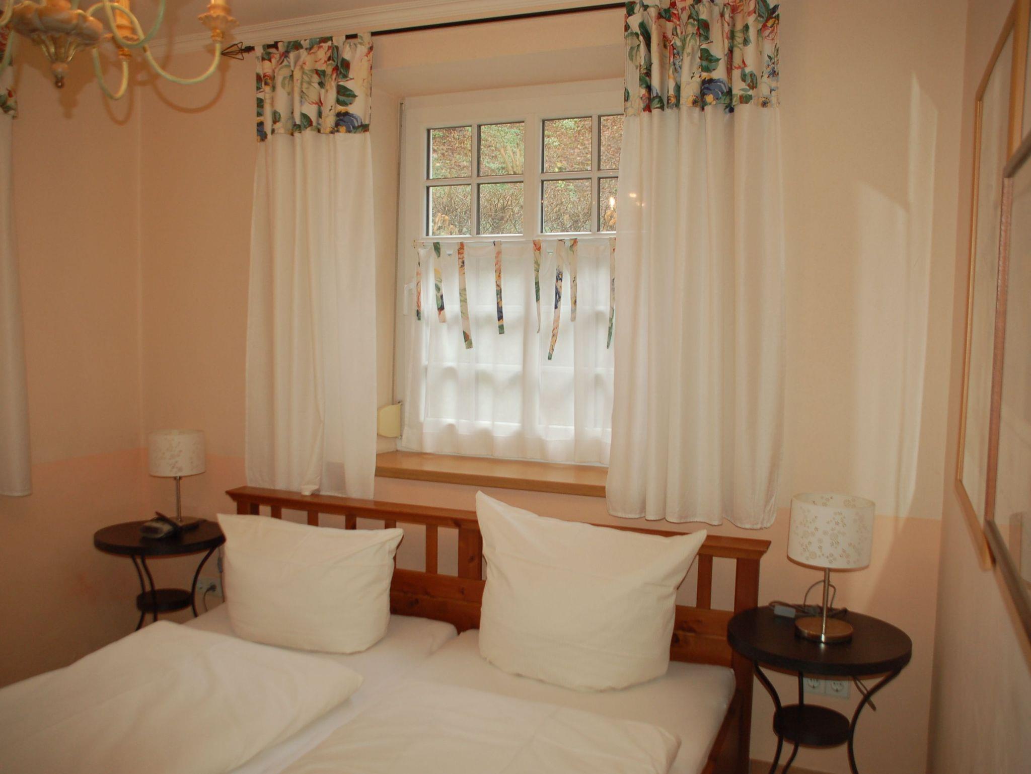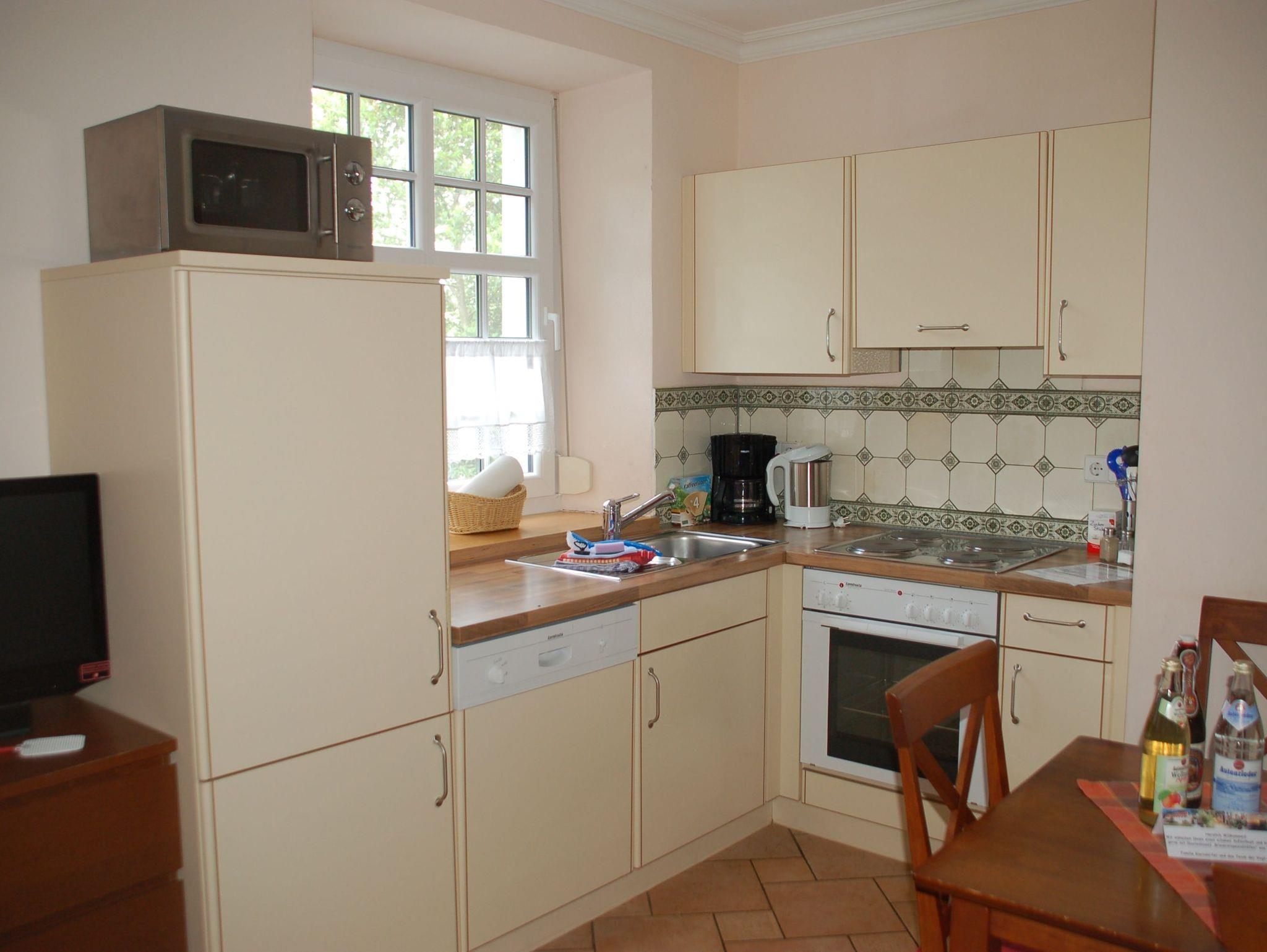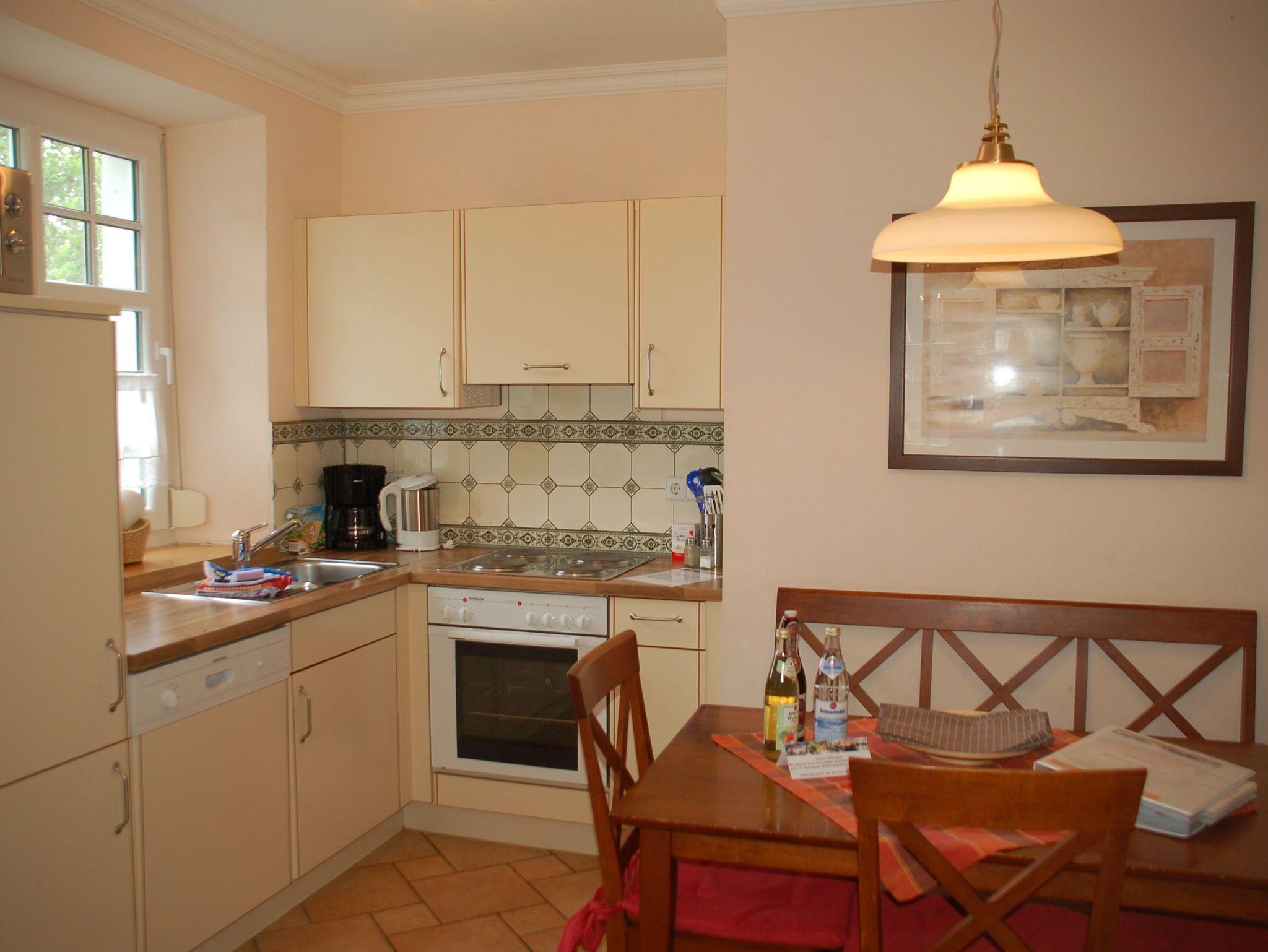 Im Eingangsbereich sind historische Bodenfliesen (Villeroy und Boch aus dem Jahr 1898) verlegt. Der große Wohn-/Essbereich ist mit einer komplett ausgestatteten Küchenzeile, einem großen Esstisch und einer gemütlichen Couch bestückt. Auf Wunsch können die Gäste im Mühlenbüro Raclette, Fondue oder Sandwichmaker ausleihen. Kinderhochstühle können vorbestellt werden. Im Bad erwartet unsere Gäste ein im toskanischen Stil gefliester Waschtischbereich sowie eine Badewanne, in der auch geduscht werden kann. Die Toilett ist in einem separaten Raum untergebracht. Das Elternschlafzimmer verfügt über ein 180 cm breites Doppelbett. Im Kinderzimmer erwartet unsere kleinen Gäste ein Etagenbett (oberes Bett 90 x 200 cm, unteres Bett 140 x 200 cm). Schallschutzfenster mit Insektenschutzrollos sind Teil der hochwertigen Ausstattung dieser Wohnung.