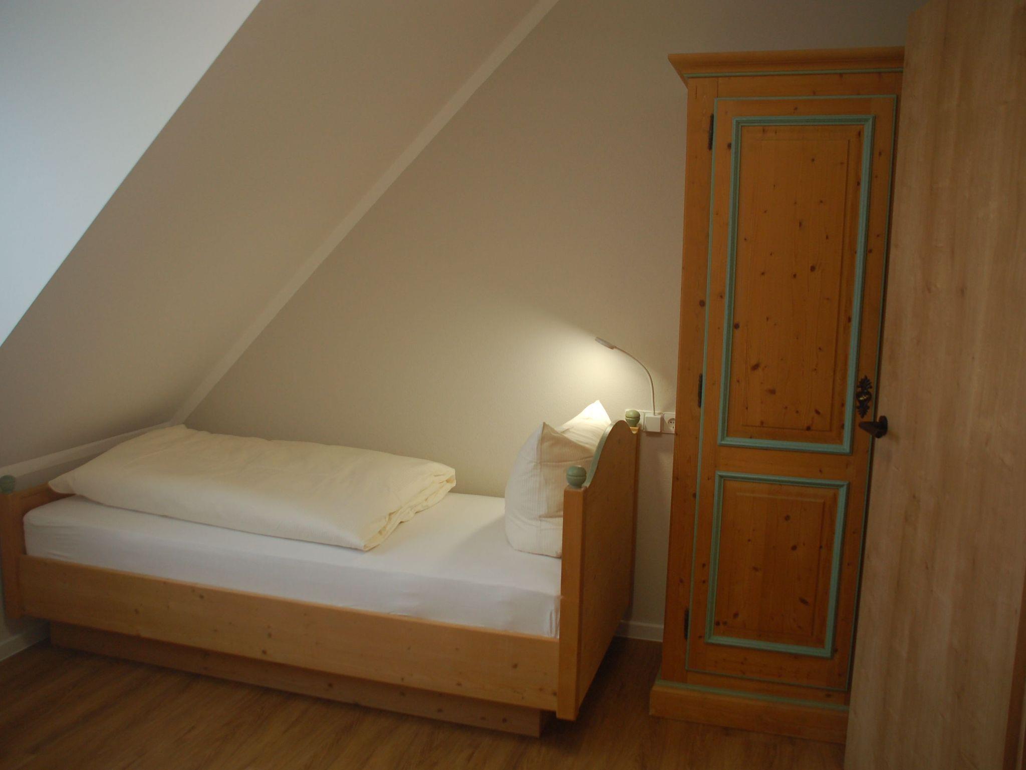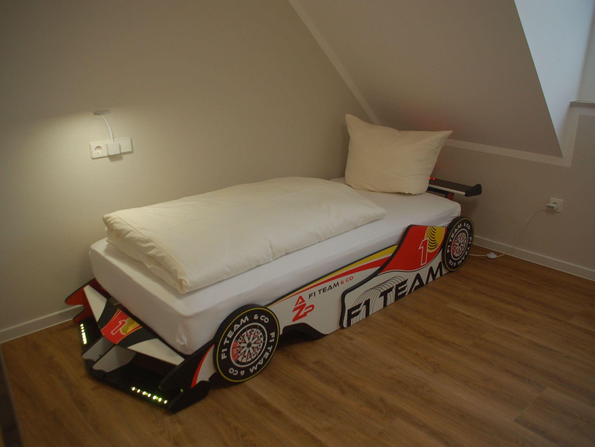 Im Kinderschlafzimmer freuen sich unsere kleinen Gäste auf ein Rennautobett (200 x 90 cm). Ein zweites Bett mit ebenfalls 200 x 90 cm komplettiert die Kinderzimmerausstattung.