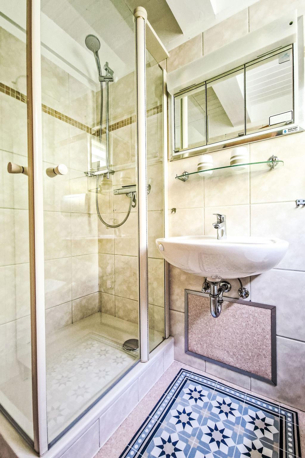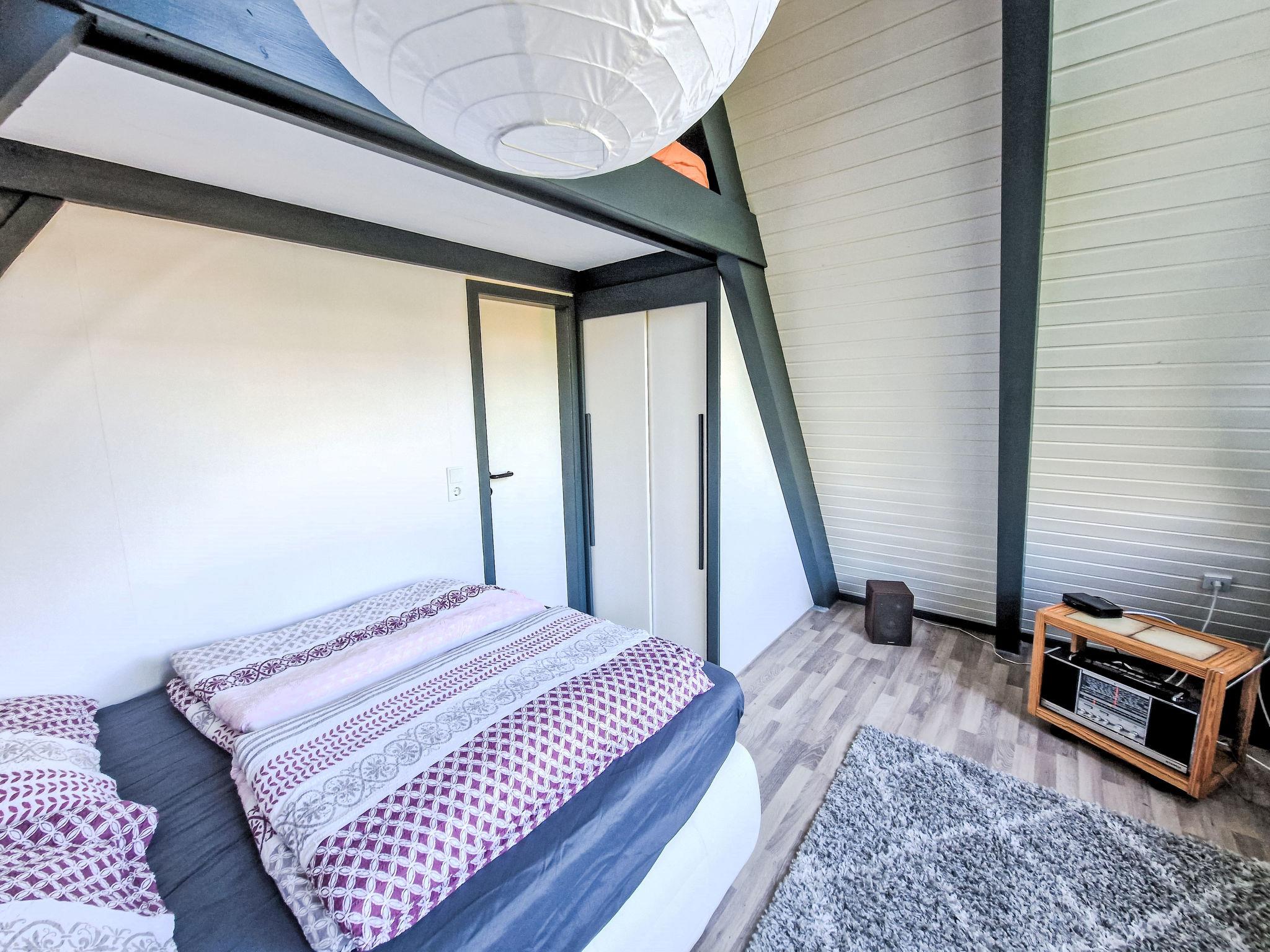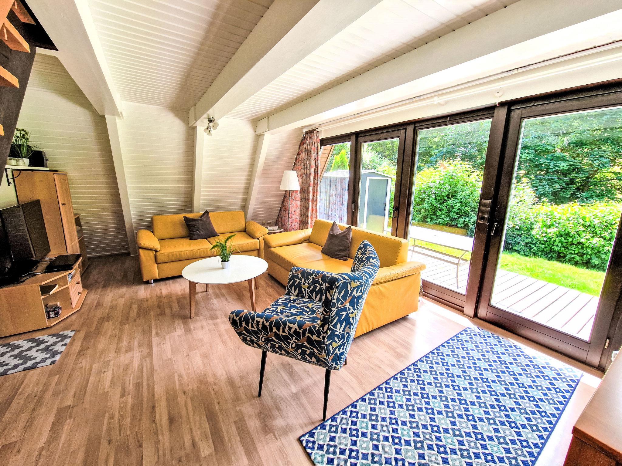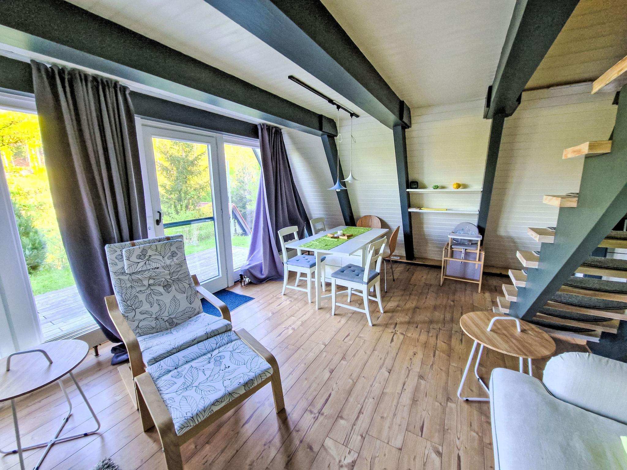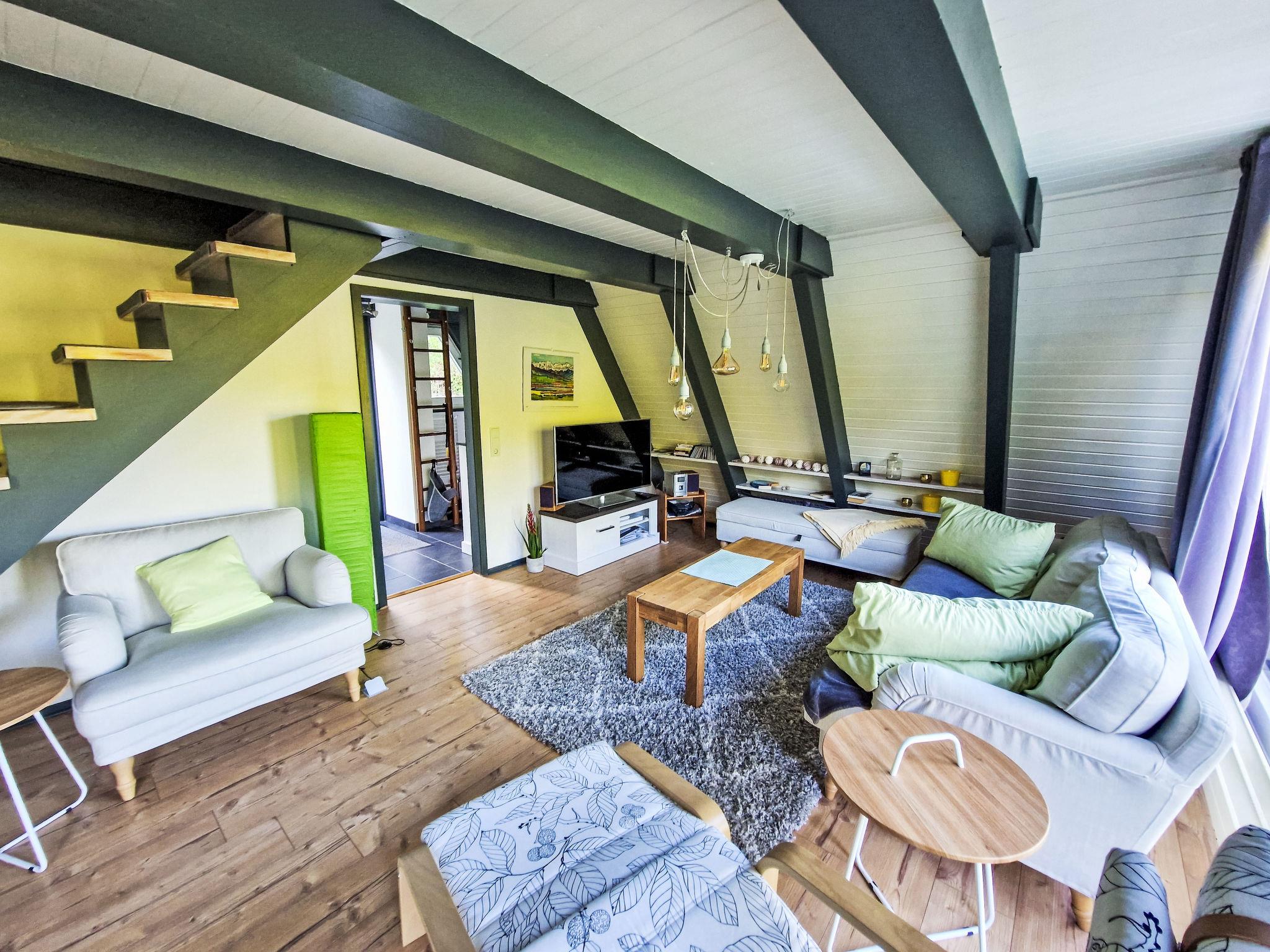 "Winnetou", 3-room house 68 m2 on 2 levels. Object suitable for 4 adults + 2 children. Practical furnishings: living/dining room with dining table and satellite TV. Exit to the terrace. Open kitchen (4 hot plates, oven, electric coffee machine). Shower/WC. Top floor: 1 double bedroom with sloping ceilings. With sloping ceilings, 1 room with 2 beds and 2 sleeping facilities. Gas heating. Terrace partly roofed, lawn 300 m2. Terrace furniture, box-room. Facilities: children's high chair, baby cot (extra). Please note: maximum 1 pet/ dog allowed. Smoke alarm, fire extinguisher. The property is one of a type of property or apartment. Please note: From the double room, an open, slanting bunk under the roof (height not suitable for adults), with a matrass (1,40 m large) for children, is accessed by a vertical ladder. There can be a room with 2 beds instead of a double room.