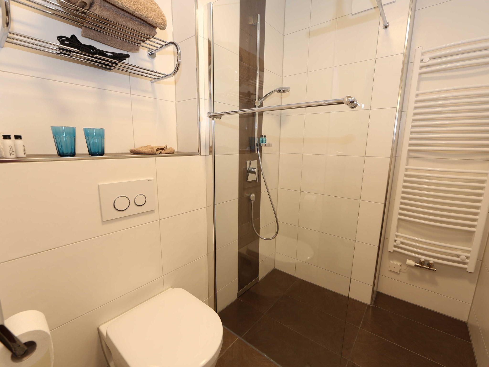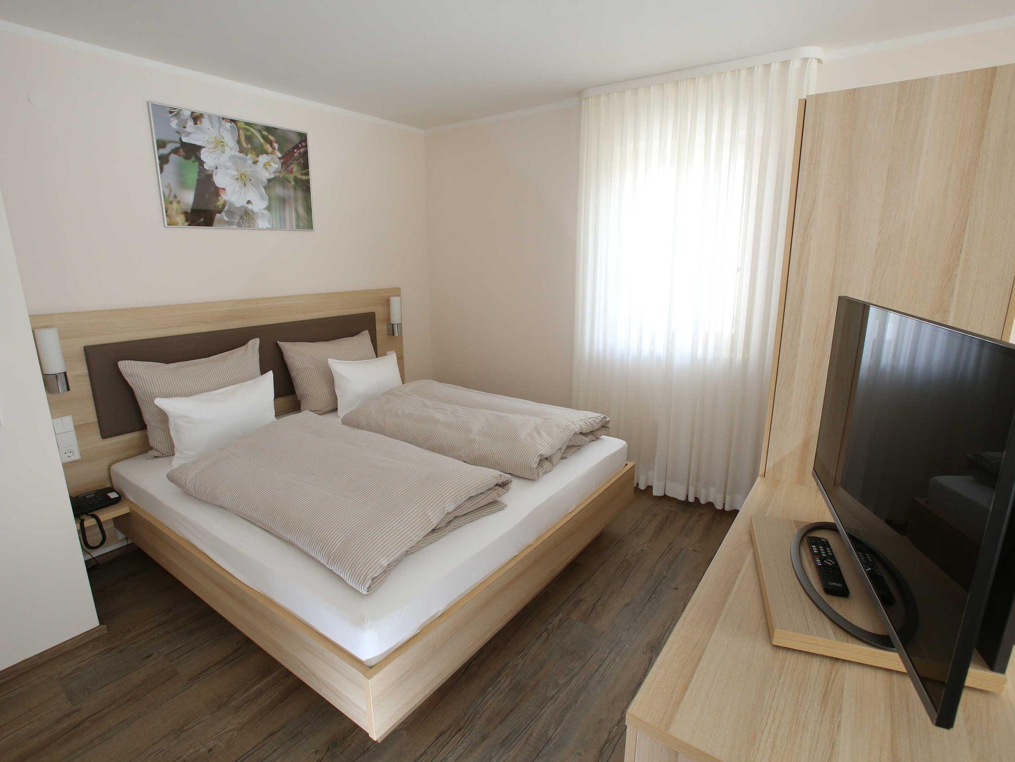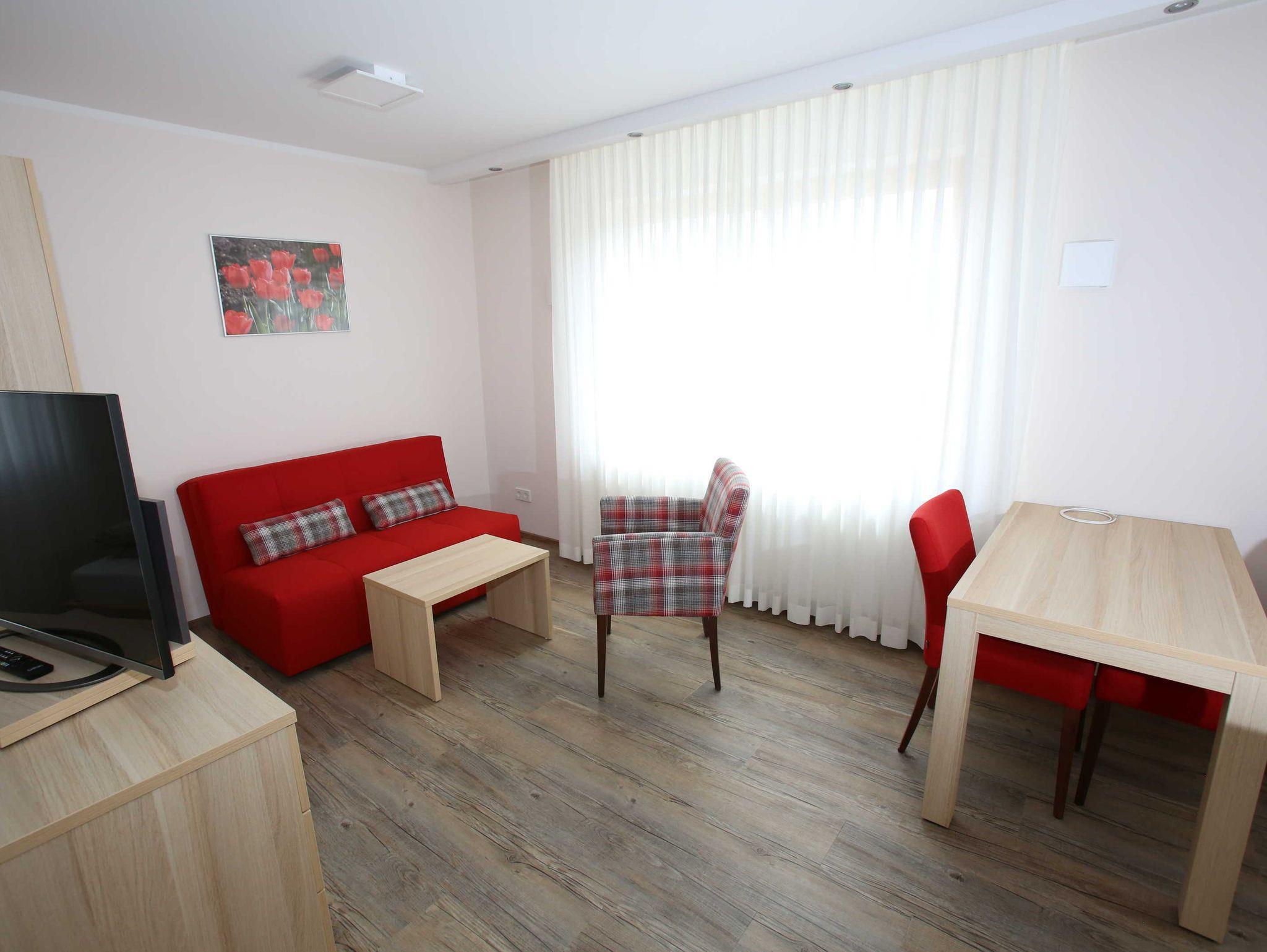 Gut ausgestattetes Apartment mit Doppelbett und zusätzlichem Schlafsofa. SAT-TV (Flatscreen 42 Zoll), Kleinküche mit Spüle, Kühlschrank, Herd, Backofen und Mikrowelle ist vorhanden. Barrierefreier Zugang, barrierefreies Bad mit ebenerdiger Dusche. Esstisch vorhanden.