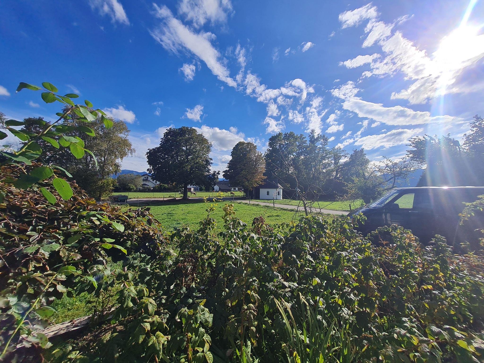 Im Sommer sind Kälber auf der angrenzenden Wiese. Die Unterkunft liegt am äußersten Südrand des ehemaligen Dorfes Pang (jetzt von Rosenheim eingemeindet). Diese ist sehr ruhig, sonnig und hell gelegen.