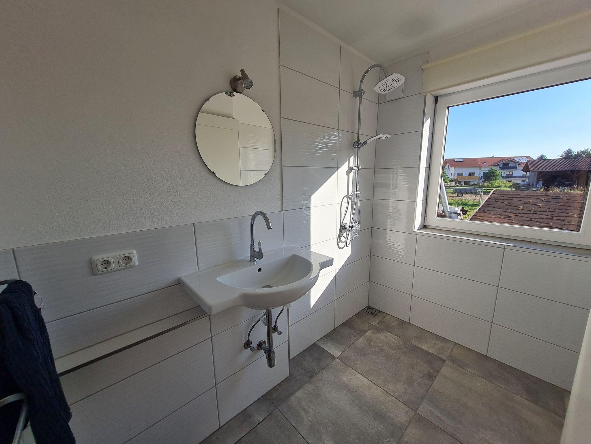 Die Einrichtung hat Hotelstandard. Diese Einheit ist behindertengerecht, wenn ein Toilettenstuhl mitgebracht wird. Aus den Fenstern und der Terrasse genießt man die Aussicht ins Grüne und auf die Berge. Die Unterkunft befindet sich bis zum Sonnenuntergang in sonniger heller Lage. Im Sommer sind Kälber auf der angrenzenden Weide. Es steht eine Waschmachine und ein Trockner im Untergeschoß der Unterkunft über eine Treppe erreichbar zur Verfügung. Ein Bügelbrett und Bügeleisen sind im ebenerdigen Gemeinschaftsbereich verfügbar. Die Unterkunft liegt am äußersten Südrand des ehemaligen Dorfes Pang (jetzt von Rosenheim eingemeindet) sehr ruhig, sonnig und hell gelegen. Der Flughafen München ist über die Autobahn 100 km, ca 1 Stunde entfernt. Zum Flughafen Salzburg sind es 77 km über die Autobahn. In 5 Minuten erreicht man das Autobahnkreuz Inntaldreieck oder die Anschlußstelle Bad Aibling an der A8. Auch mit den öffnetlichen Verkehrsmitteln Bahn und Bus und 2 Gehminuten (nach 19:00 Uhr ca 6 km mit dem Taxi) erreicht man die Unterkunft sehr gut. Der Bus fährt im 20 Minuten Takt vom Bahnhof zur Unterkunft in Pang. Vor Ort gibt es in 2-5 Gehminuten Apotheke, Lebensmittelladen, Bäcker, Pizzaria, bayerische Wirtschaften, Post, Bushaltestellen, Dorfladen, Autowerkstatt, 5 Fahrminuten zu den nächsten Seen, Angelmöglichkeiten, Golfplatz, Boulderhalle, Ponyreiten, Beachvolleyball, Tankstelle, Supermarkt. Kanufahren, Kajakwelle, diverse Freibäder, Hallenbad, Kletterhalle, Stadtmitte (Bahnhof) sind 10 Auto-Minuten entfernt. Die nächsten Skilifte sind 18,4 km (18 Auto-Minuten bis 33 km (29 Minuten) (Nachtskilauf) entfernt. Man kann von der Haustüre weg flach Wandern, Radfahren und Bergradfahren (13 km Anfahrt über Feldstraßen verkehrsberuhigt) mit sehr guter Aussicht. Die nächsten Bergwanderungen und Klettergebiete sind 18,4 km (18 Auto-Minuten) entfernt. Langlaufen kann man an den nächsten schneesicheren Zielen in ca. 30 km Entfernung ca. 30 Minuten entfernt in zB. Sachrang und Bayrischzell, Tiersee etc., 55 km in 53 Minuten dauert die Anfahrt zum legendären Alpinkletter und Wander Mekka - dem Kaisergebirge. Wenn es um Berg-, Skisport, Klettersteige, Hochtouren und Eisklettern geht, sind sie von der Vermieterin bestens beraten und geführt. Diese ist staatlich geprüfte BERG UND SKIFÜHRERIN. Tauchen, Windsurfmöglichkeiten und geführte Angeltouren mit Boot bietet der Chiemsee. Das Westufer erreicht man in ca. 29 km und 25 Minuten. Zur nächsten Gleitschirmschule und den nächsten Flugbergen sind es ca. 16 km.