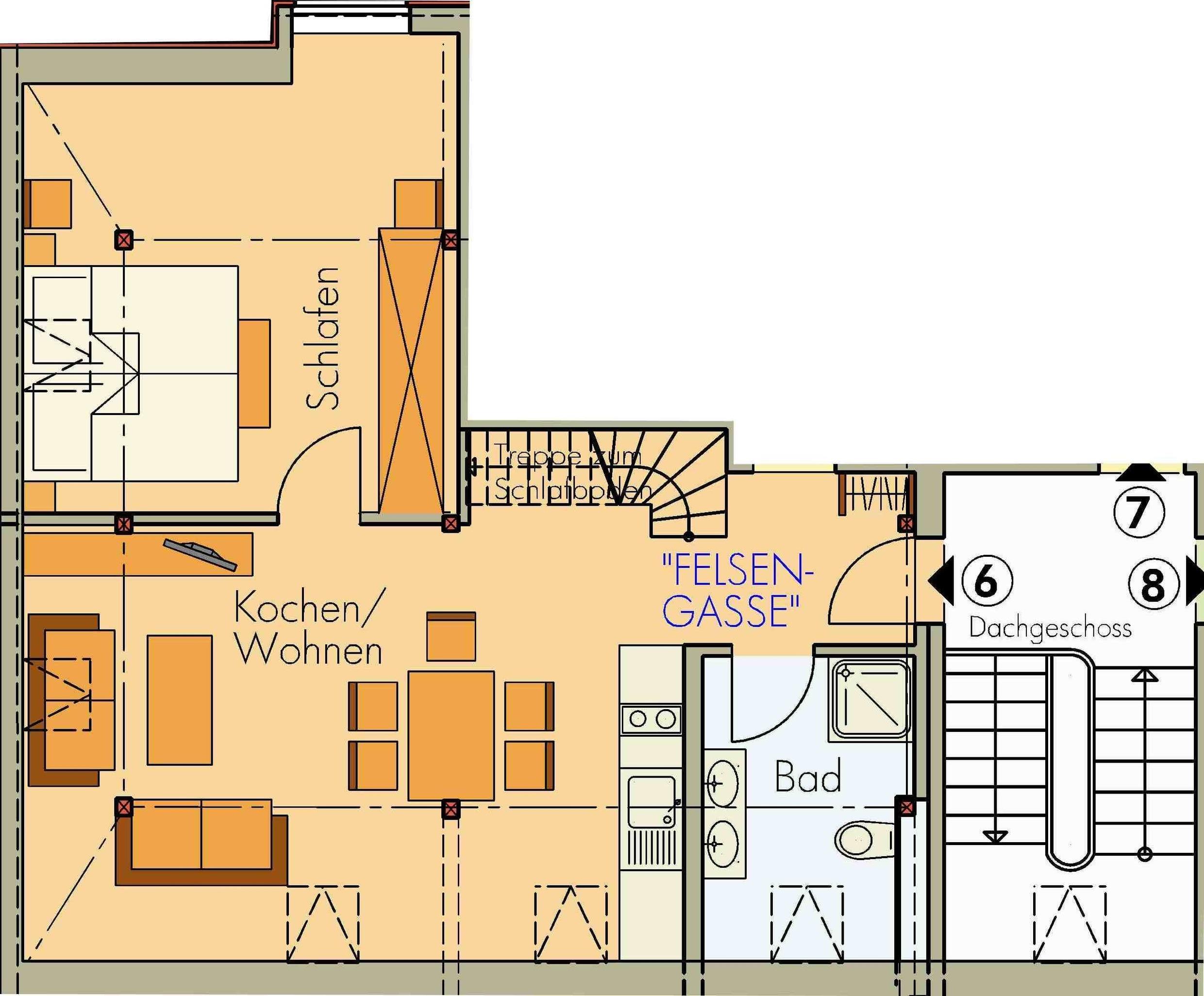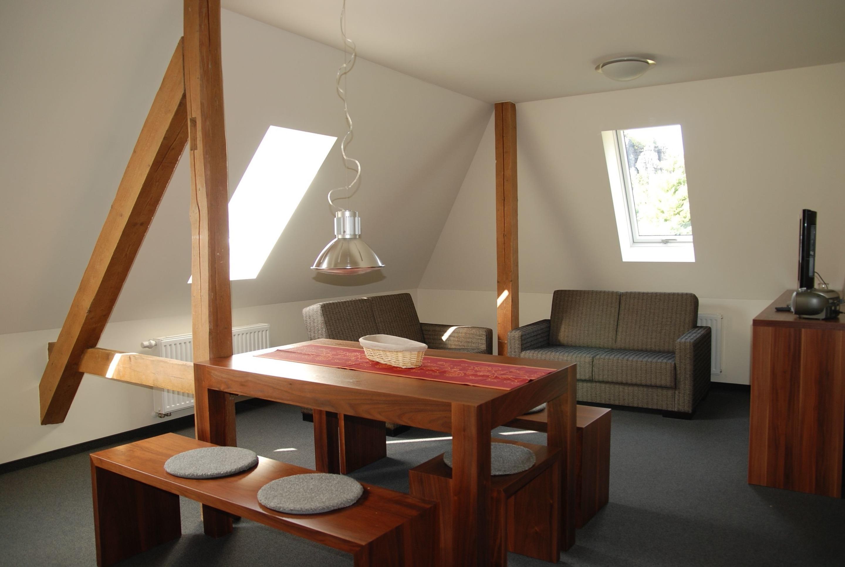 Die stillvoll und gemütlichen eingerichtete Ferienwohnung, liegt im Dachgeschoss der Felswelten und bietet für 2 – 4 Personen größzügig Platz, mit schöner Schlafgalerie