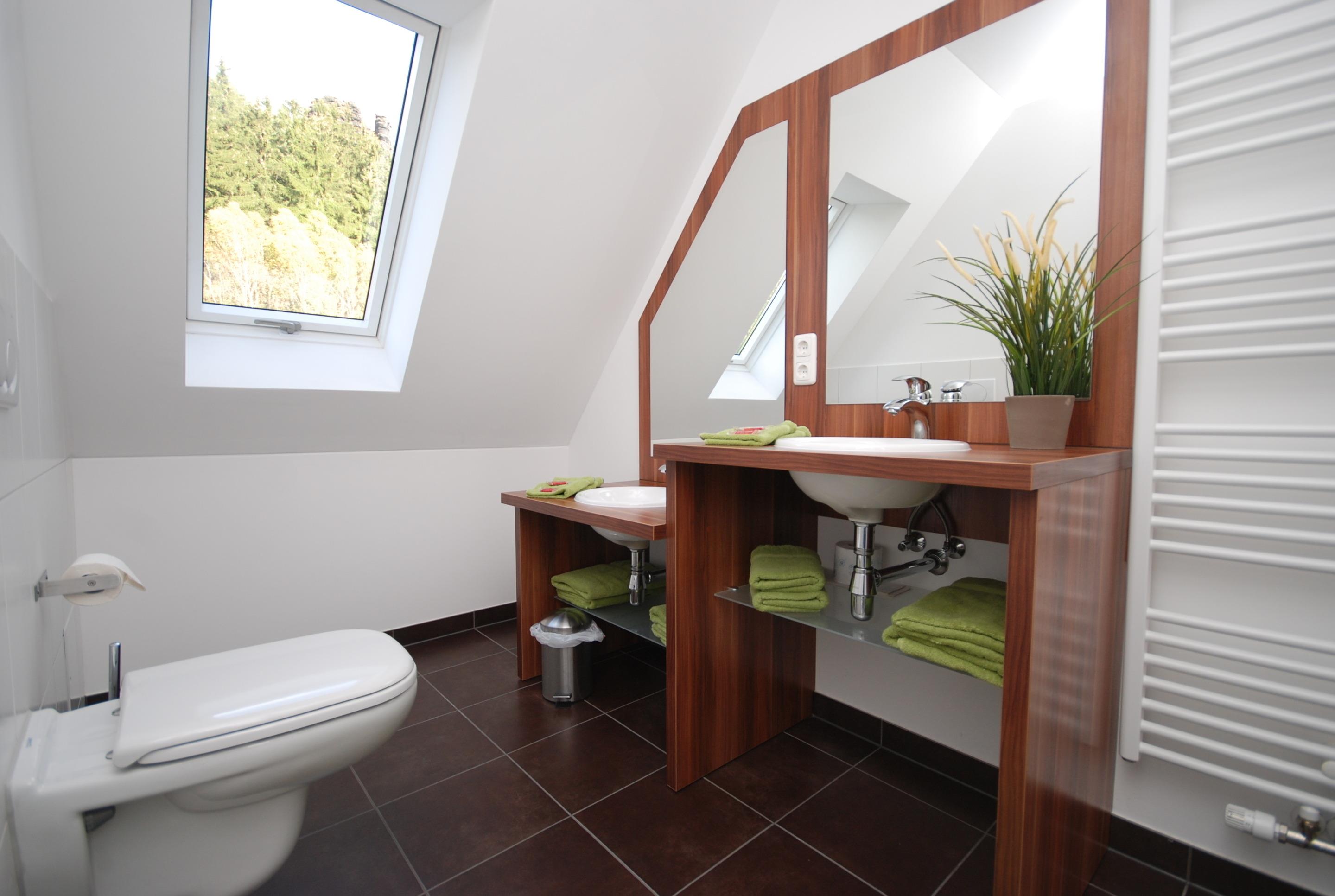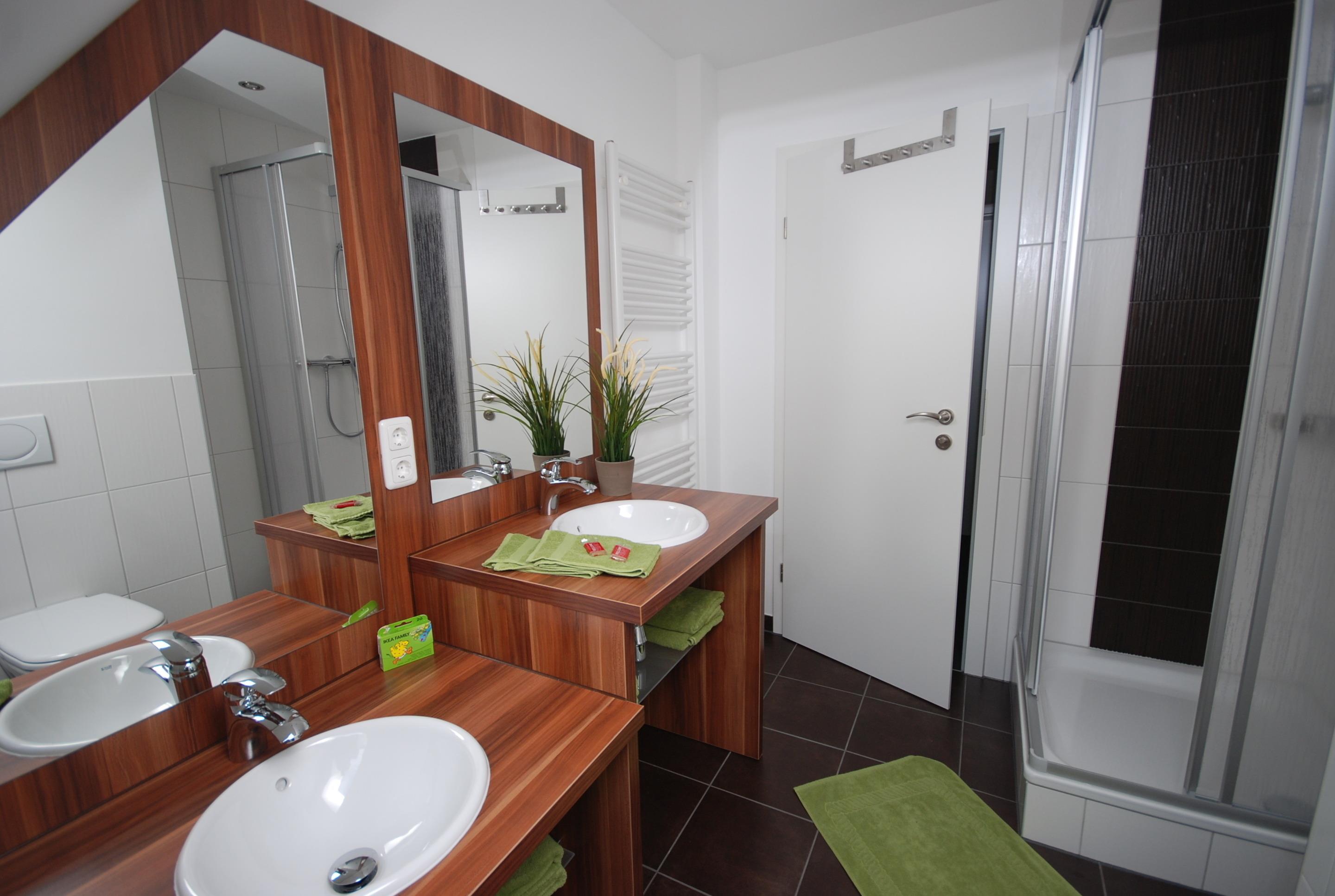 Kinder- und Elternwaschbecken, Dusche, Fön, Tageslicht