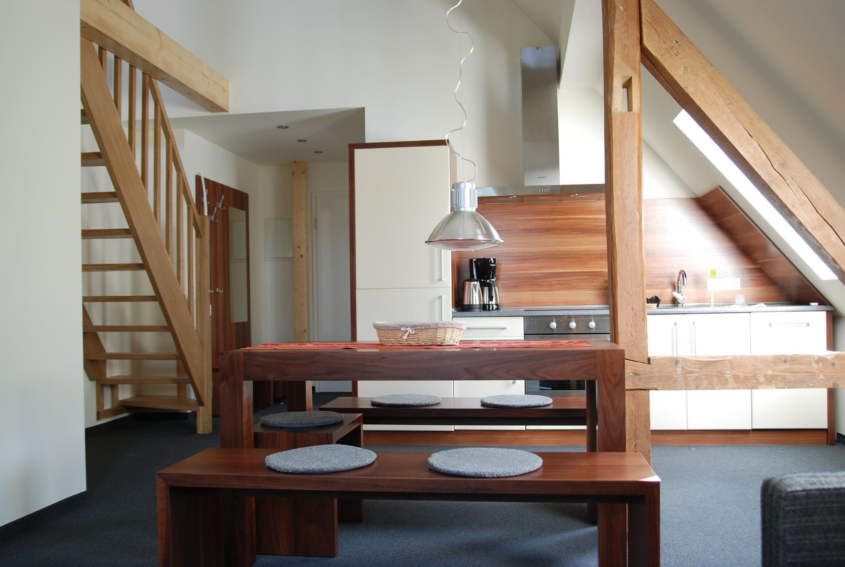 moderner Esstisch/Sitzbänke,Spülmaschine, Cerankochfeld, Kühlschrank mit Gefrierfach, Wasserkocher, Kaffeemaschine,