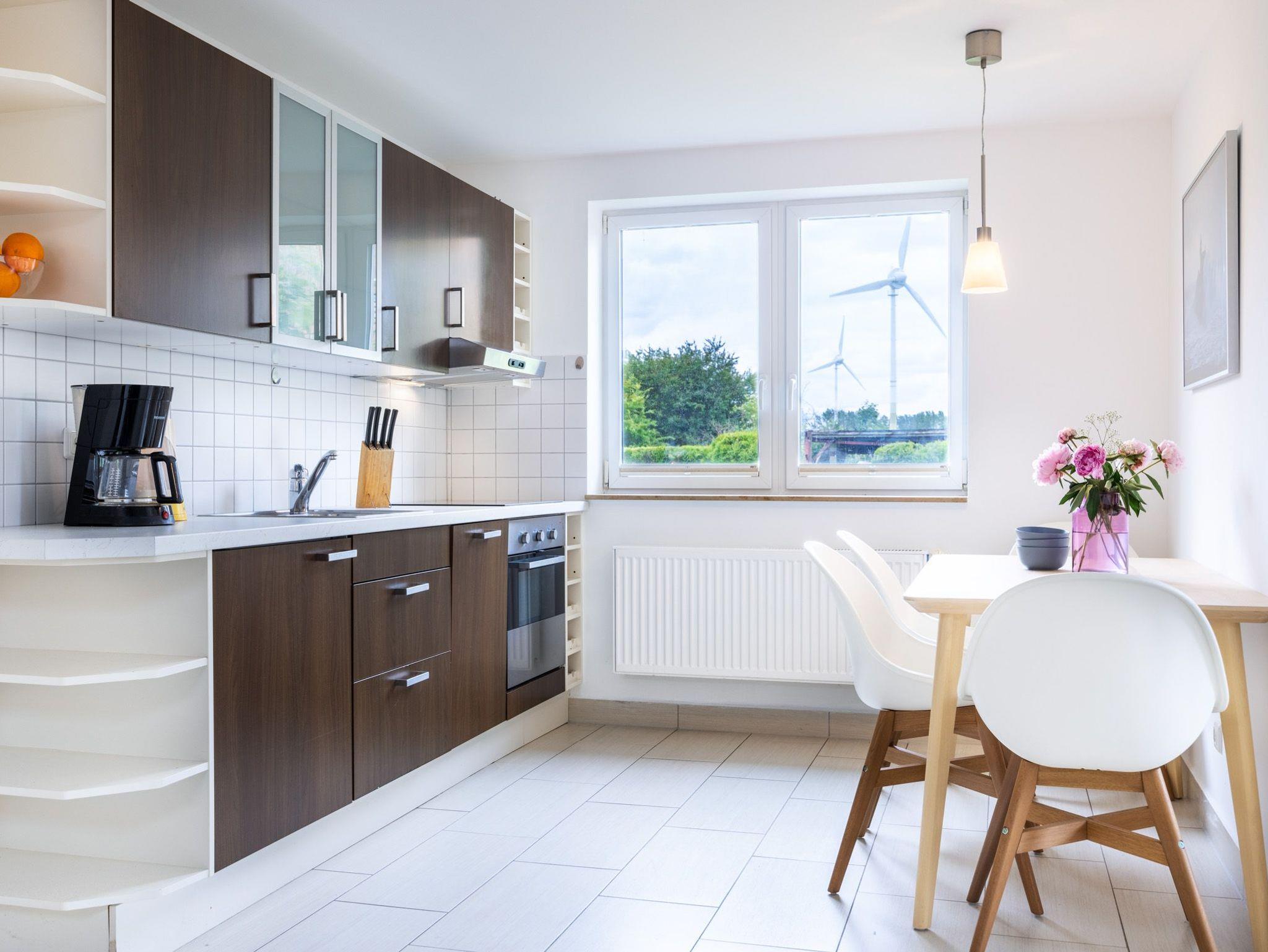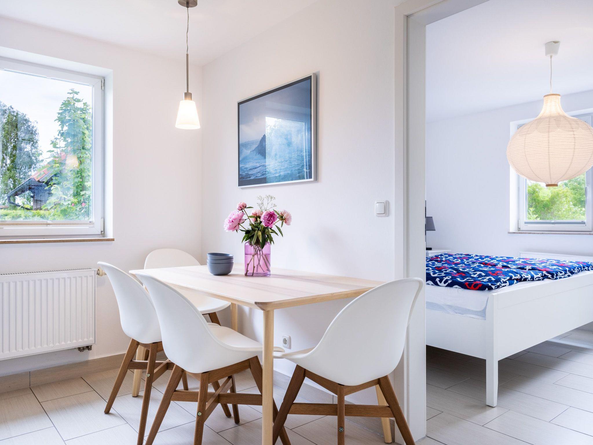 Wohnzimmer mit Sofaecke (Schlafsofa) und TV. Offene Küche mit 4- Platten Herd, Backofen, Geschirrspüler, Kaffeemaschine, Wasserkocher und Toaster, Esstisch. Schlafzimmer mit Doppelbett und Kommode, Bad mit Dusche und WC.