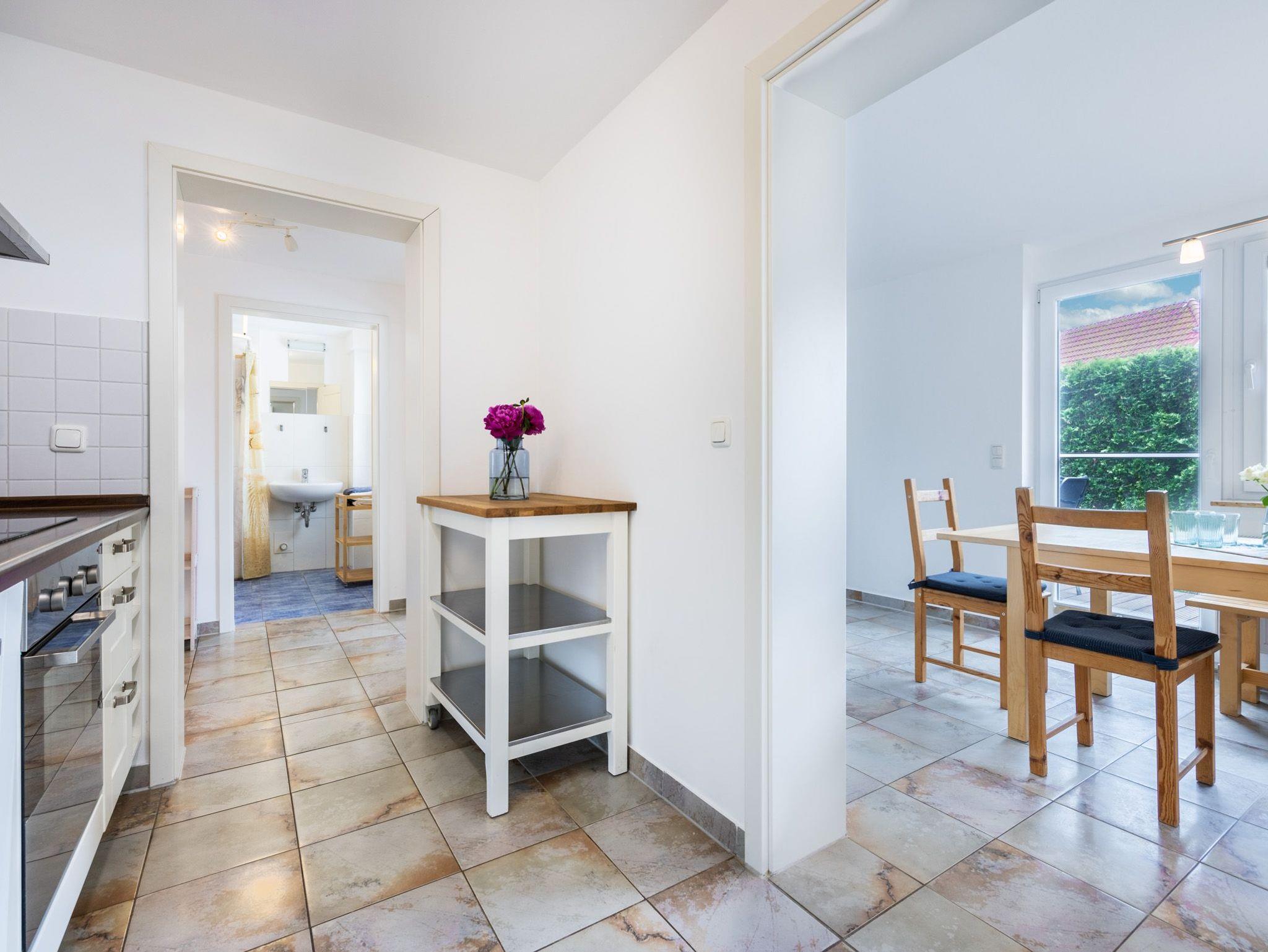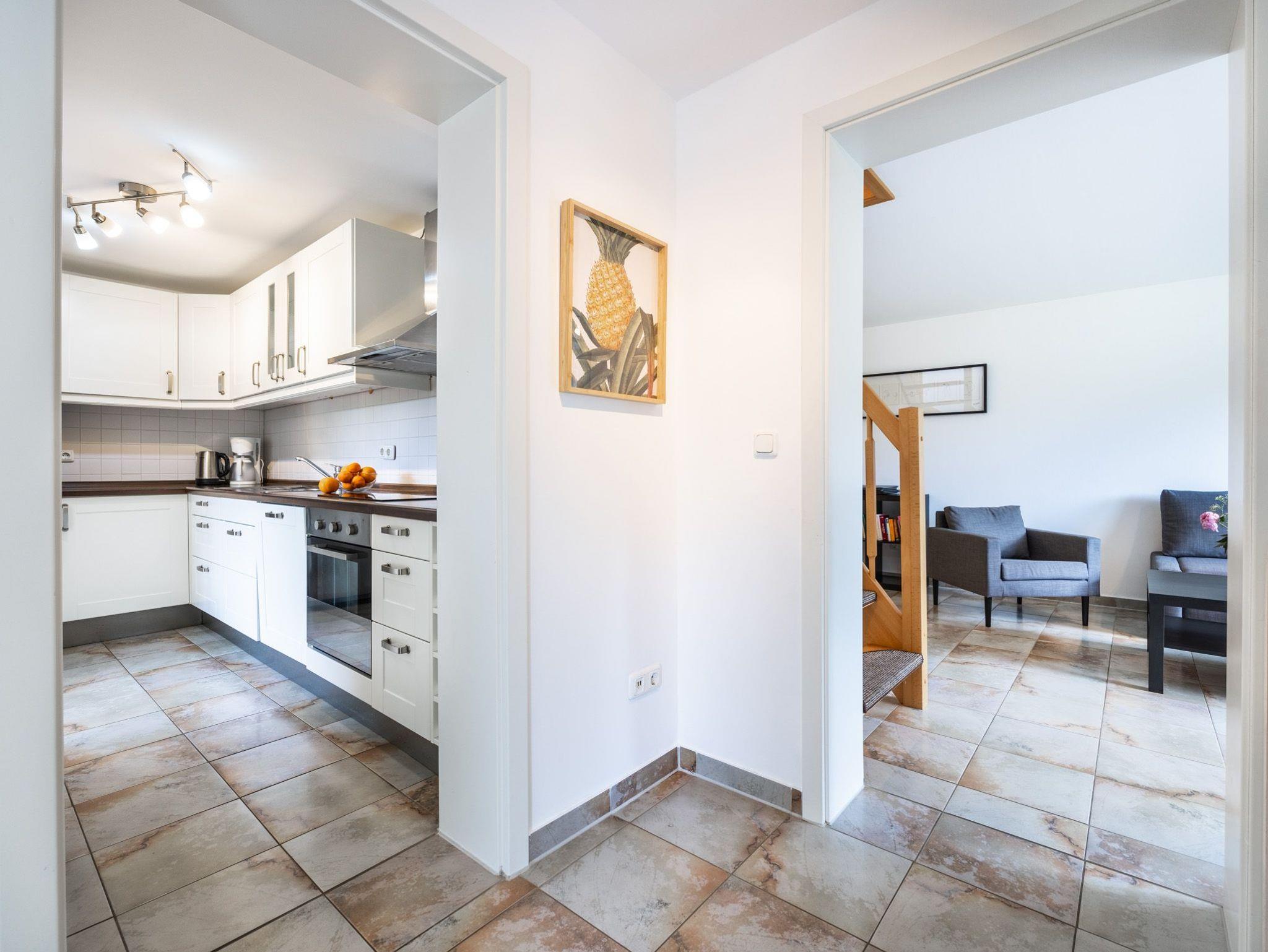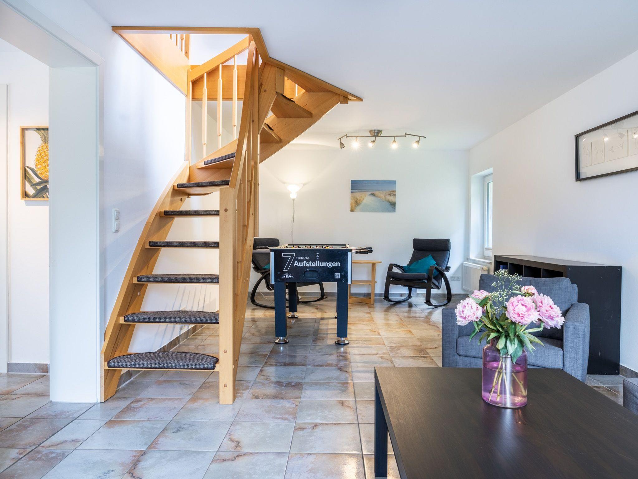 Im Erdgeschoss: Wohnzimmer mit Sofaecke (Schlafsofa), TV und Tischkicker. Separate Küche mit 4- Platten Herd, Backofen, Geschirrspüler, Kaffeemaschine, Wasserkocher und Toaster. Separater großzügiger Essbereich mit Zugang zur Terrasse. Bad mit Dusche und WC.
