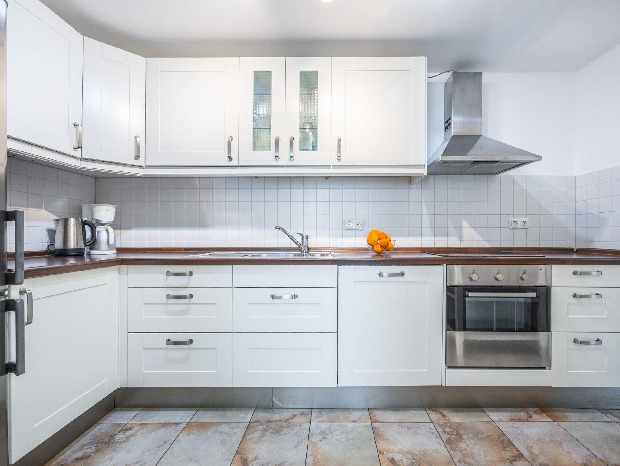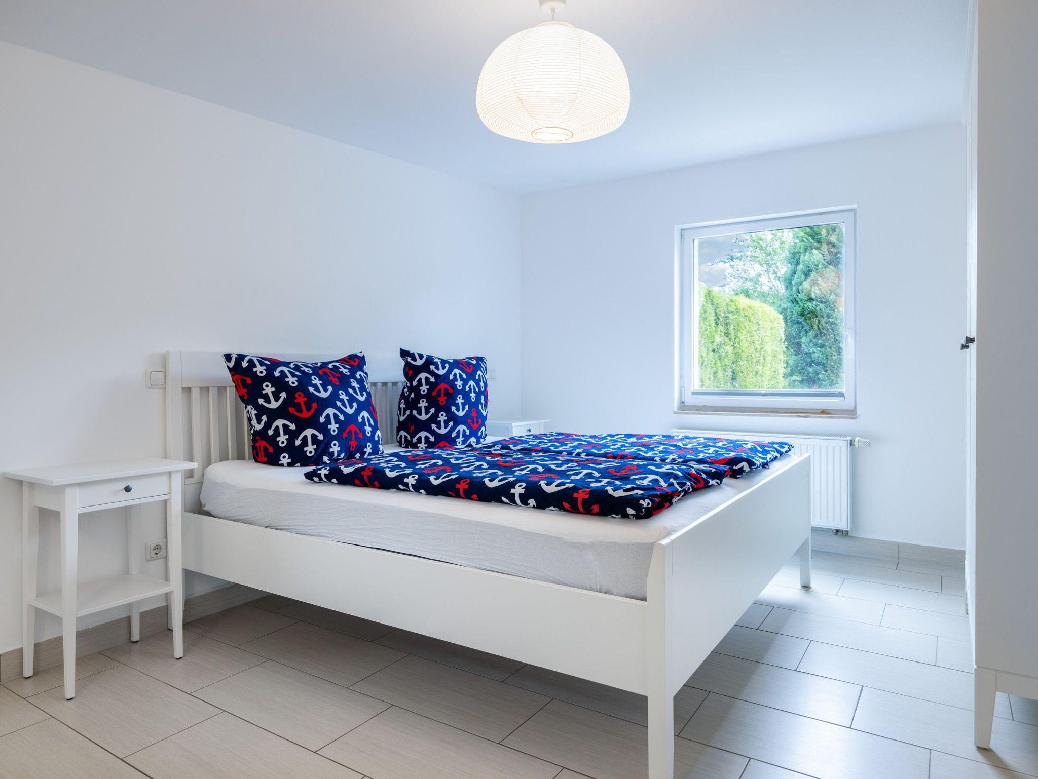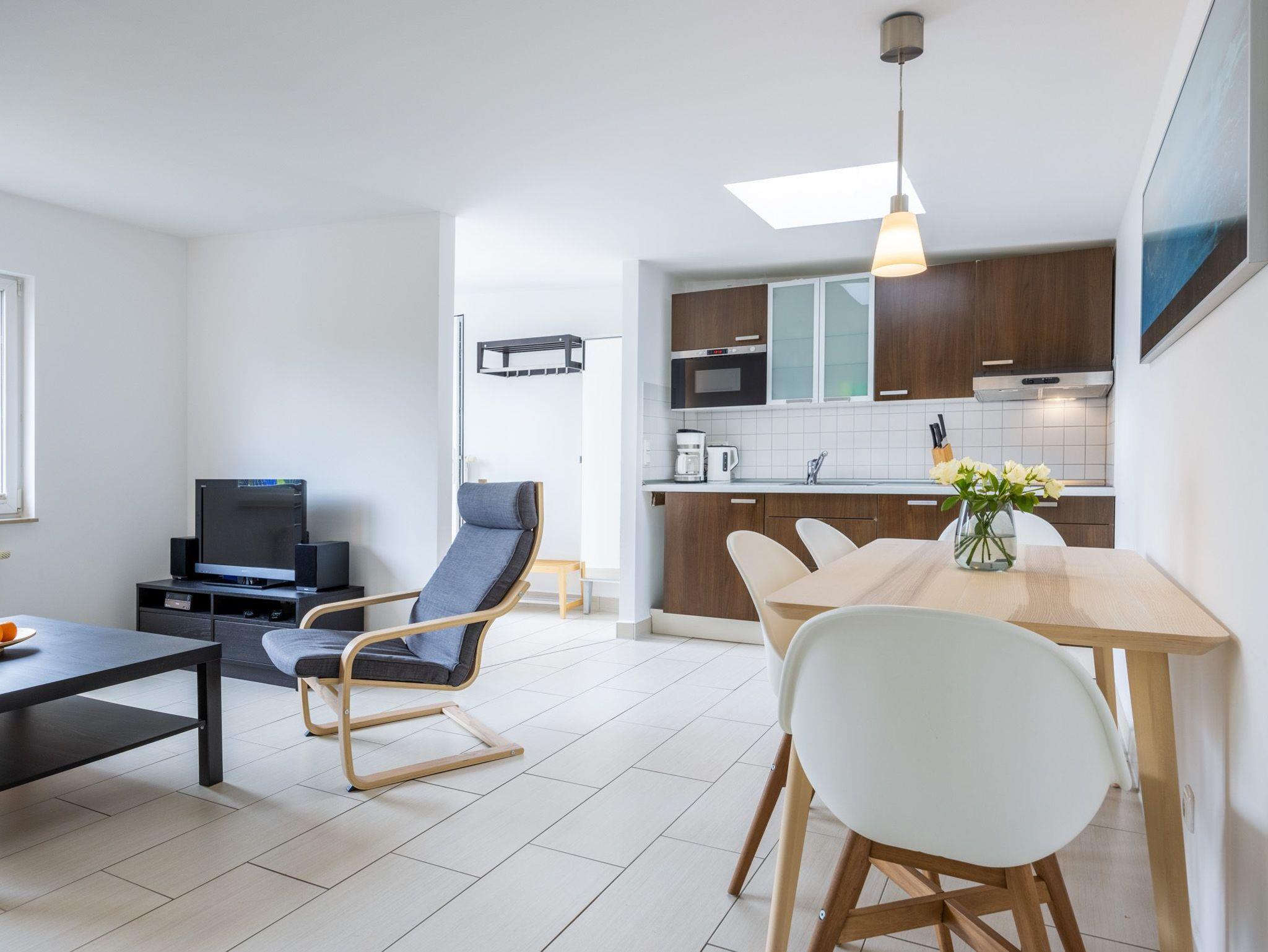 Im Erdgeschoss: Wohnzimmer mit Sofaecke (Schlafsofa), TV und Tischkicker. Separate Küche mit 4- Platten Herd, Backofen, Geschirrspüler, Kaffeemaschine, Wasserkocher und Toaster. Separater großzügiger Essbereich mit Zugang zur Terrasse. Bad mit Dusche und WC.