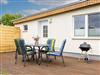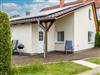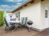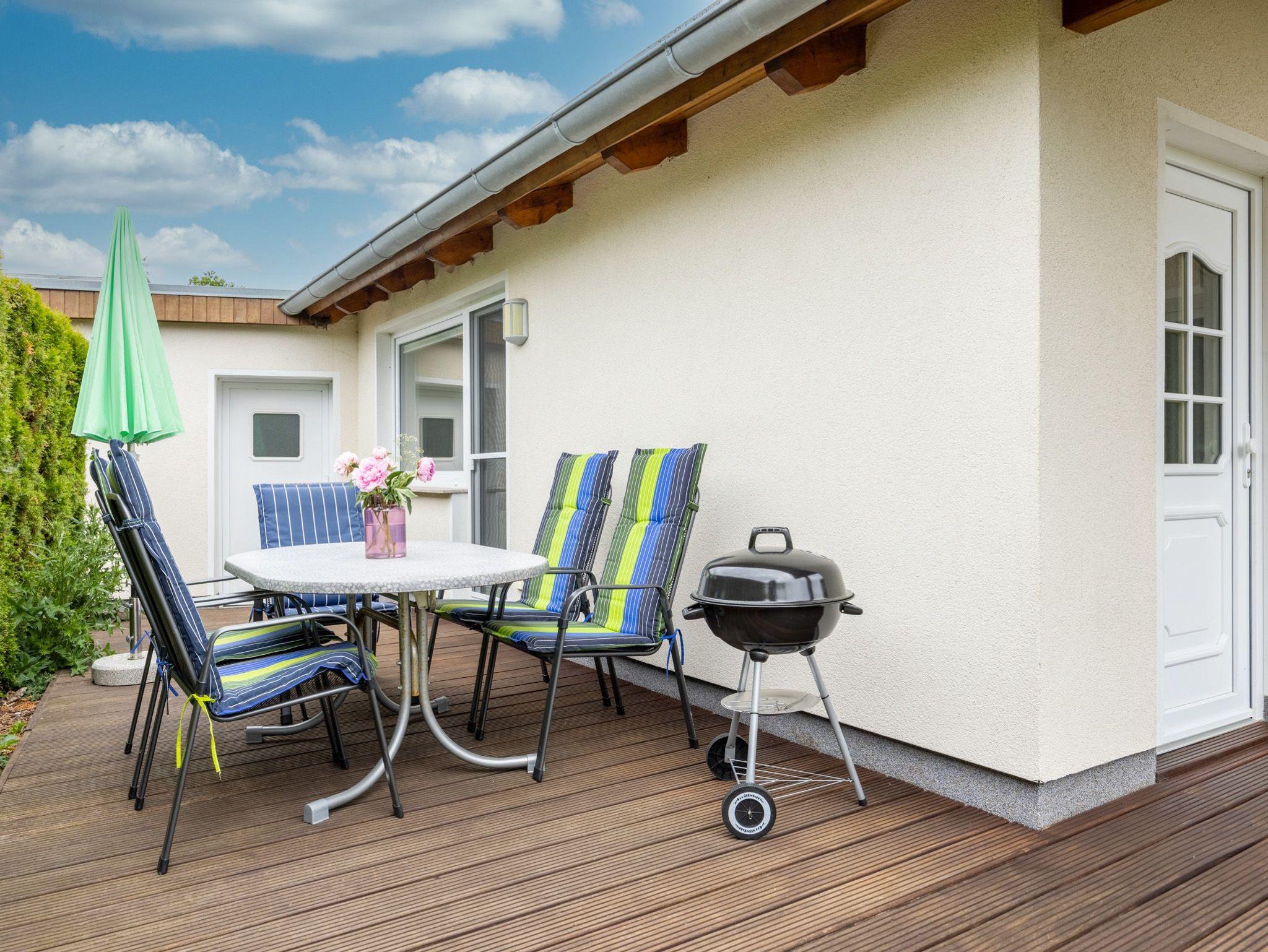 Am Ferienhaus: Terrasse mit Grill, Parkplatz.