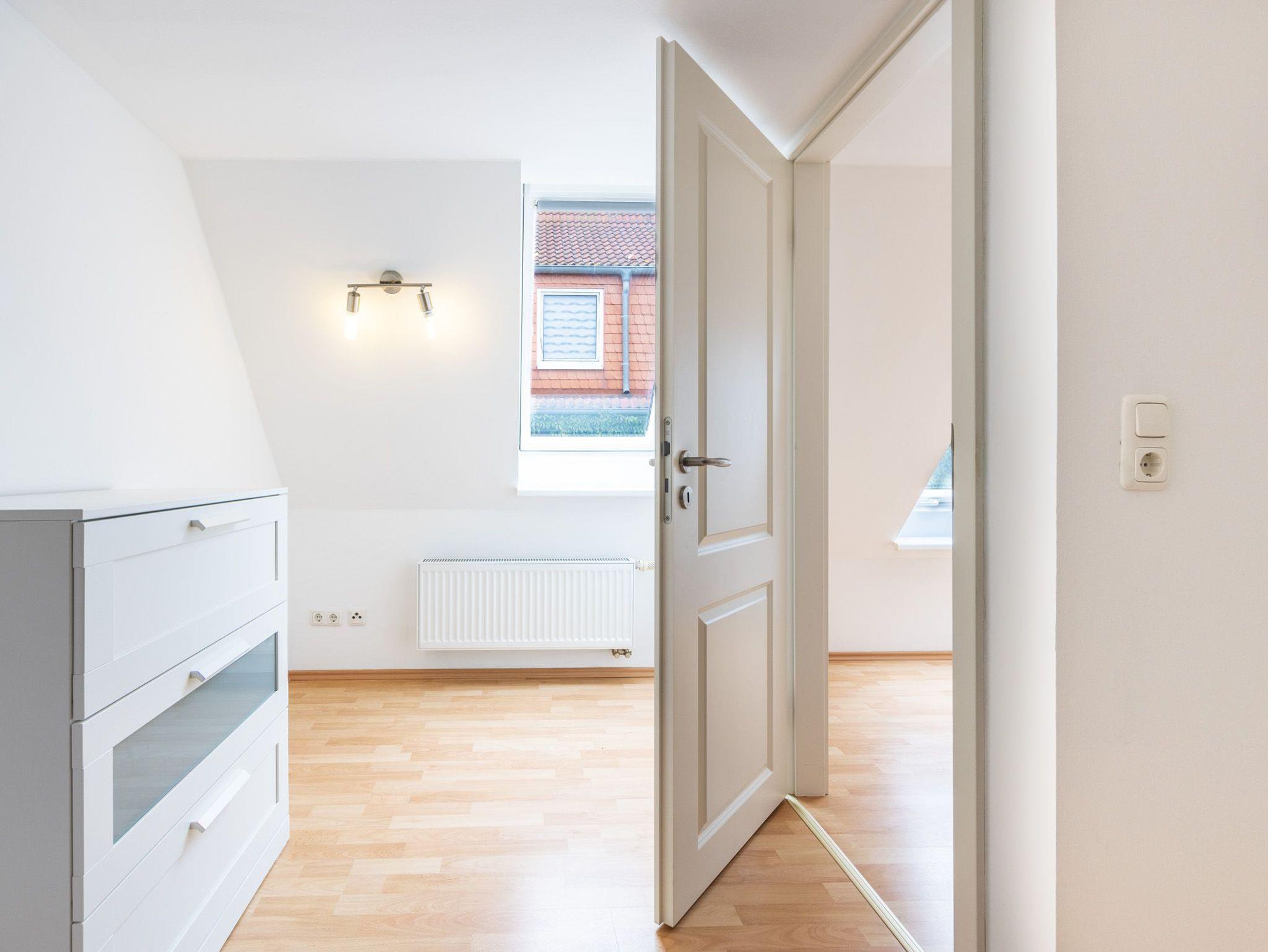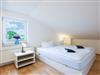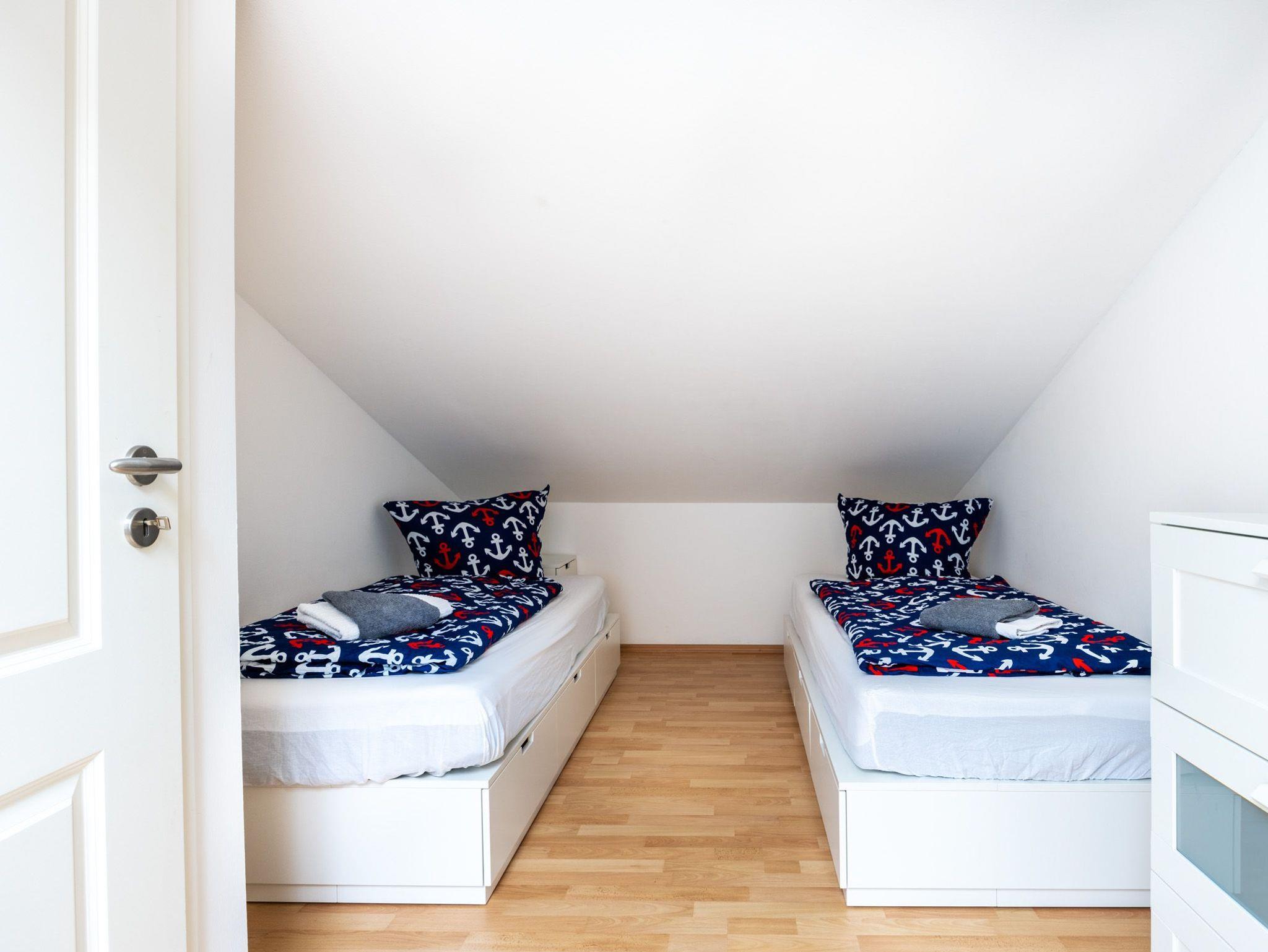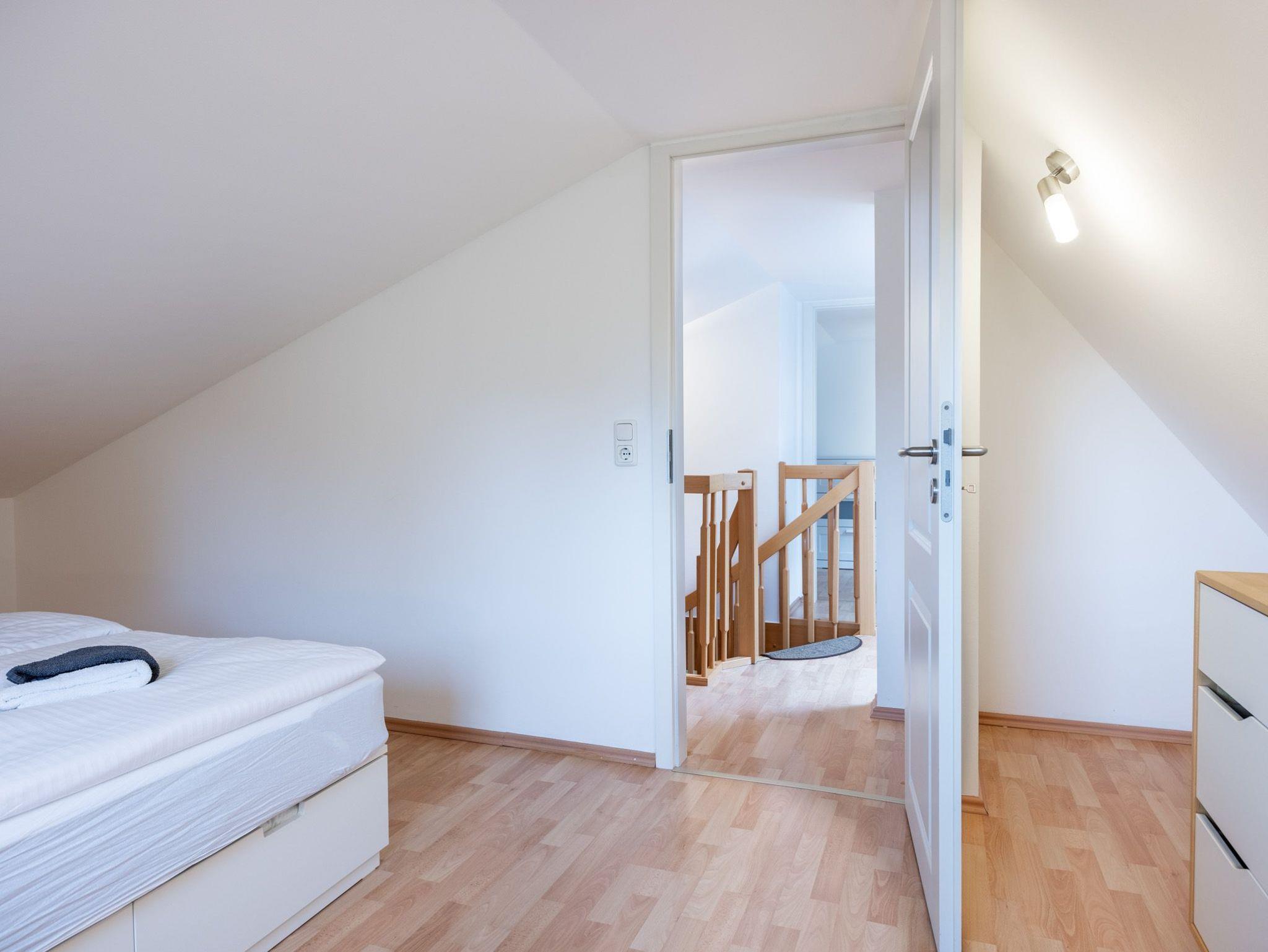 Im Obergeschoss: Schlafzimmer 1 mit Doppelbett und Kommode, Schlafzimmer 2 mit 2 Einzelbetten. Im oberen Flur gibt es einen offenen Garderobenbereich.