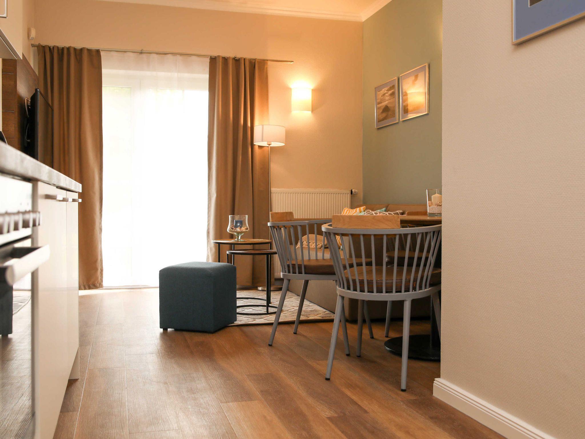 Die 2-Zimmer-Ferienwohnungen mit einer Größe von ca. 44 m² mit Balkon oder Terrasse bieten viel Platz für bis zu 4 Personen in separaten Wohn- und Schlafzimmern mit Doppelbett sowie ein neu gestaltetes Duschbad. Im Wohn- und Essbereich befindet sich ein Doppelschafsofa und eine hochwertig ausgestattete Einbauküche.