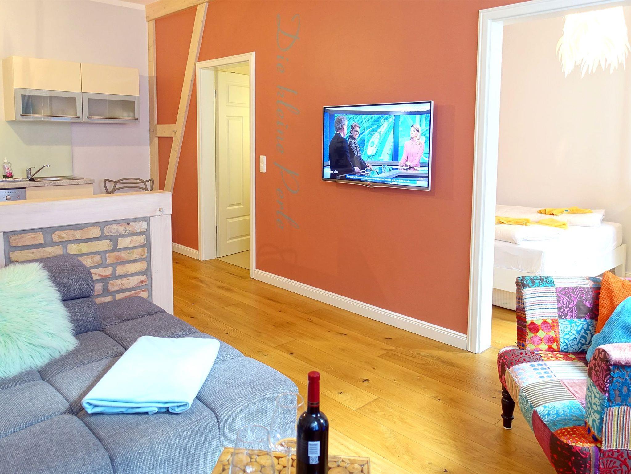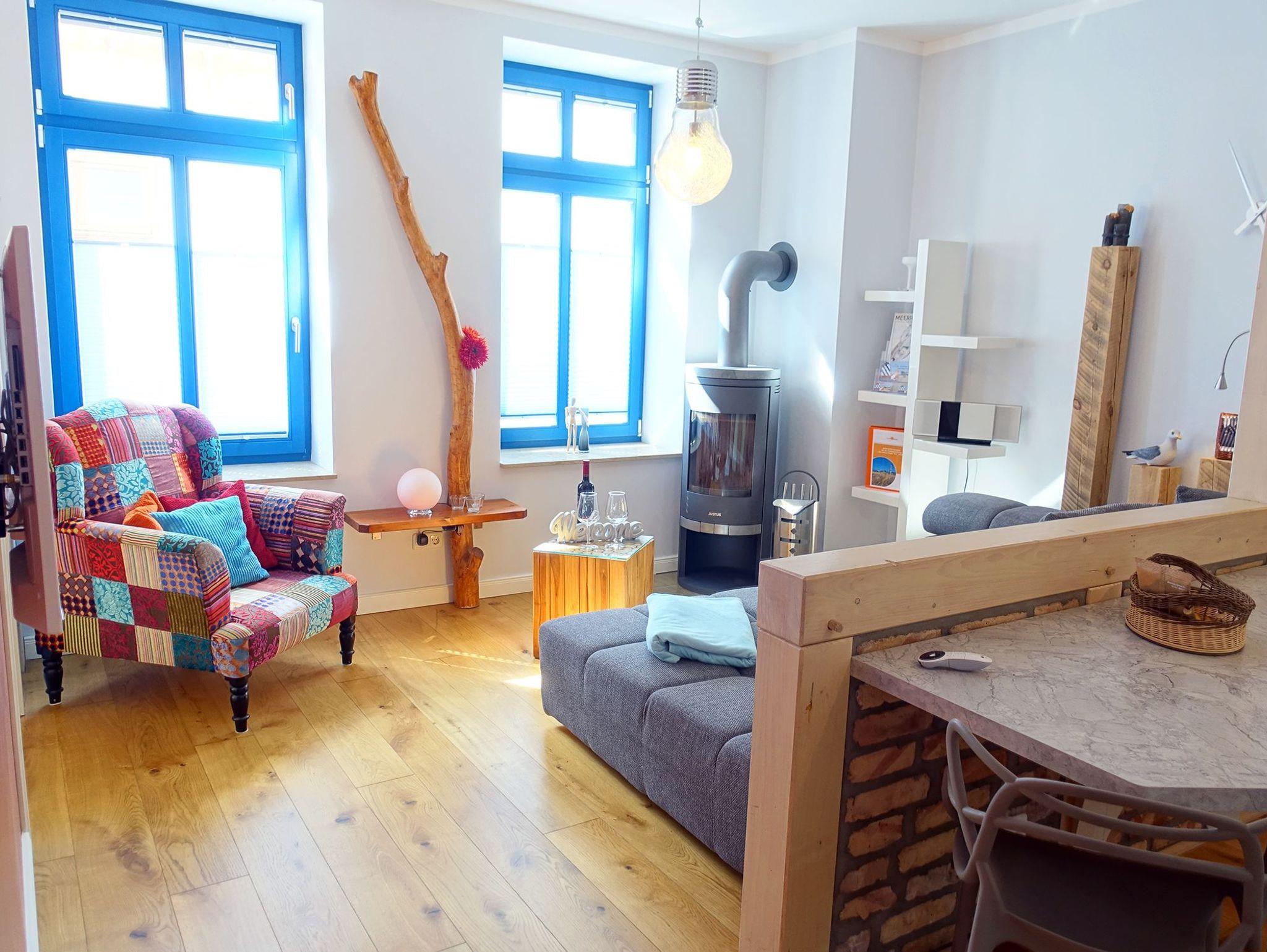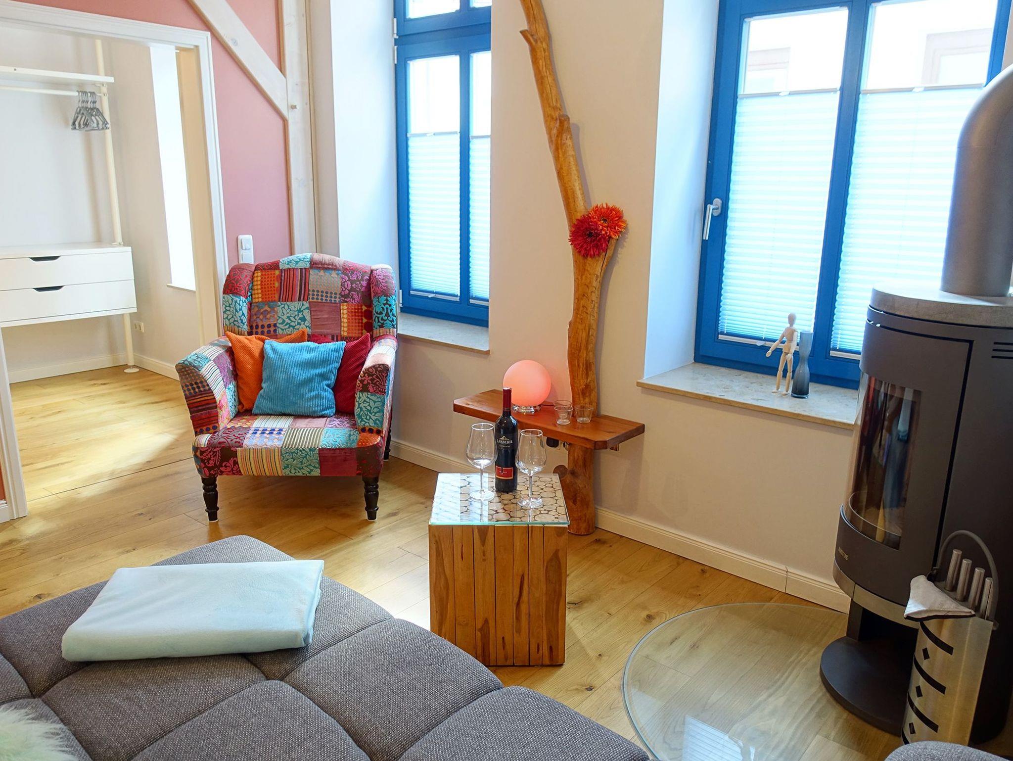Die 43 qm große Wohnung ist farbenfroh und modern eingerichtet. Das Wohnzimmer ist kombiniert mit einer voll ausgestatteten Küchenzeile. An kühleren Tagen lässt es sich wunderbar mit einem Tee am Kamin entspannen (kein Holz vorhanden). Ein Esstisch sowie eine gemütliche Sofaecke mit Flachbildfernseher befinden sich ebenfalls in dem hellen Wohnraum.
