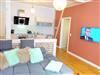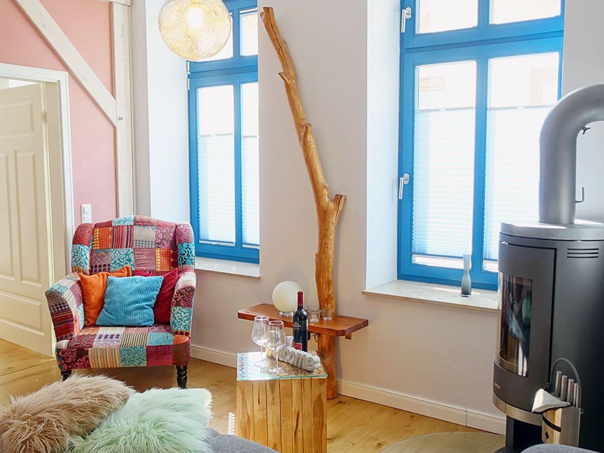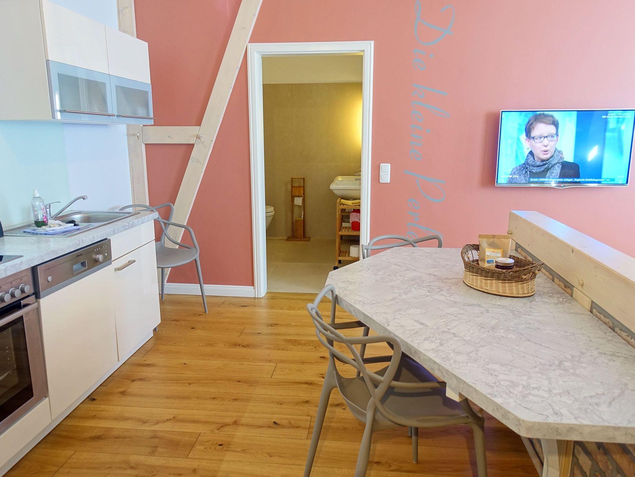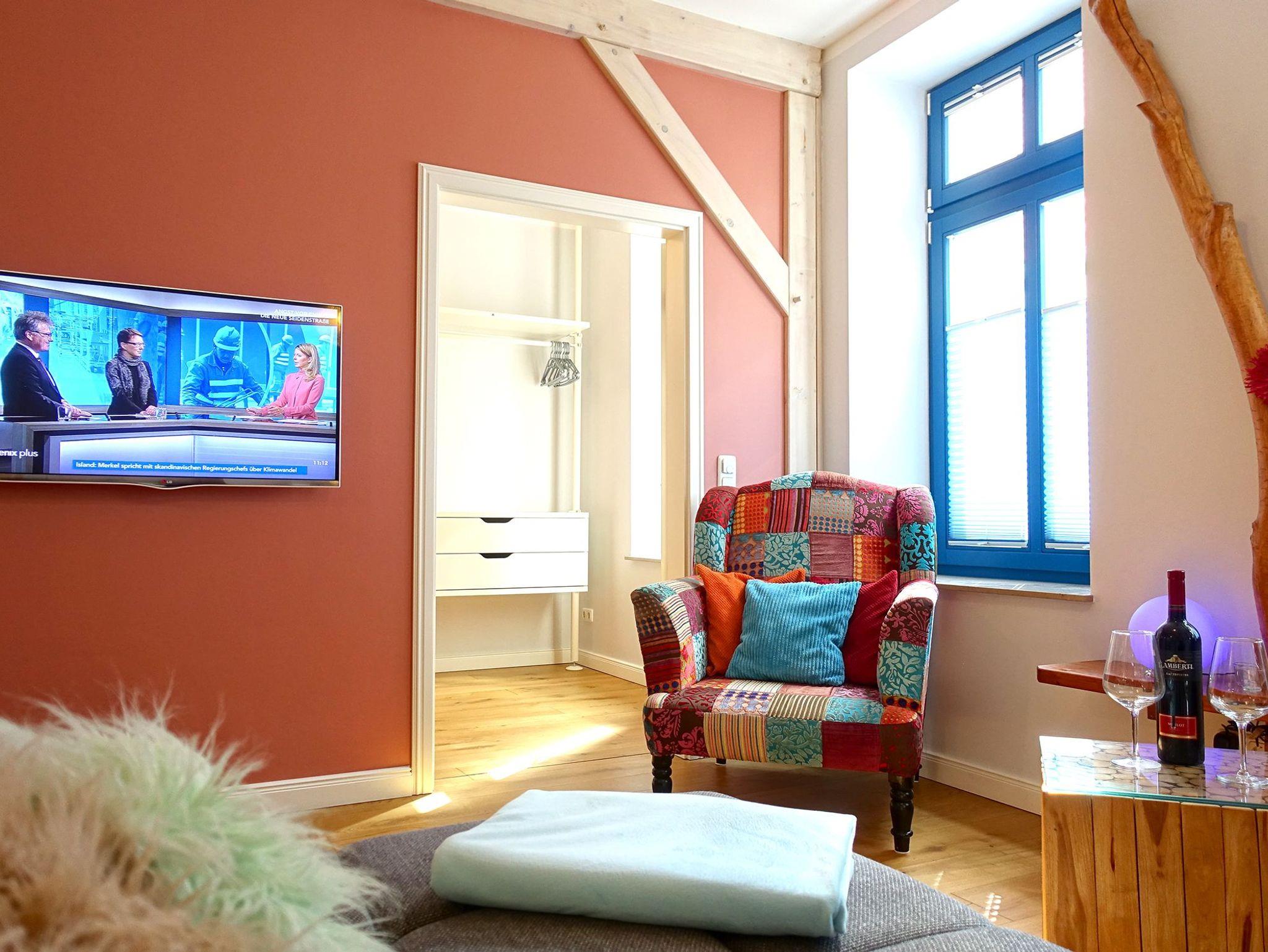 Die 43 qm große Wohnung ist farbenfroh und modern eingerichtet. Das Wohnzimmer ist kombiniert mit einer voll ausgestatteten Küchenzeile. An kühleren Tagen lässt es sich wunderbar mit einem Tee am Kamin entspannen (kein Holz vorhanden). Ein Esstisch sowie eine gemütliche Sofaecke mit Flachbildfernseher befinden sich ebenfalls in dem hellen Wohnraum.