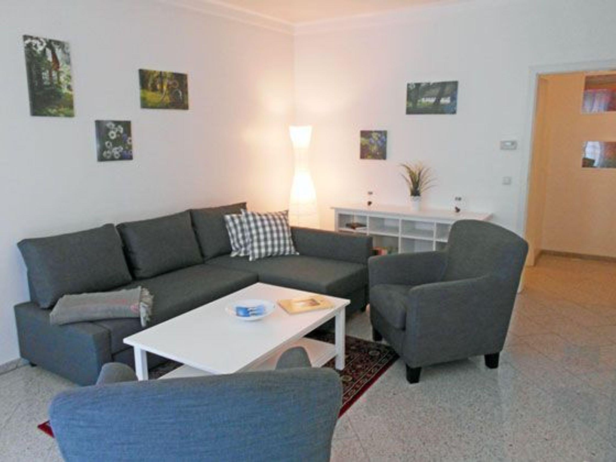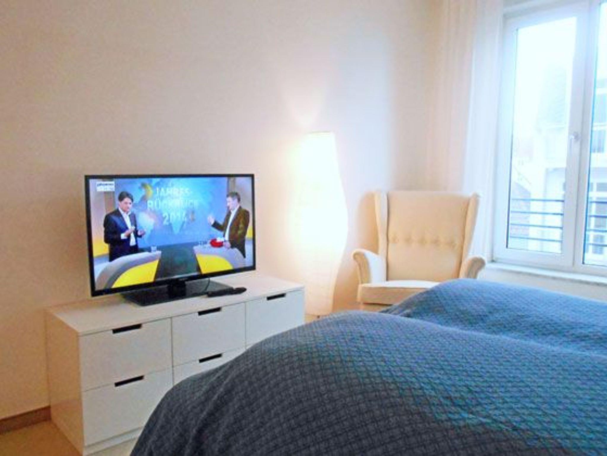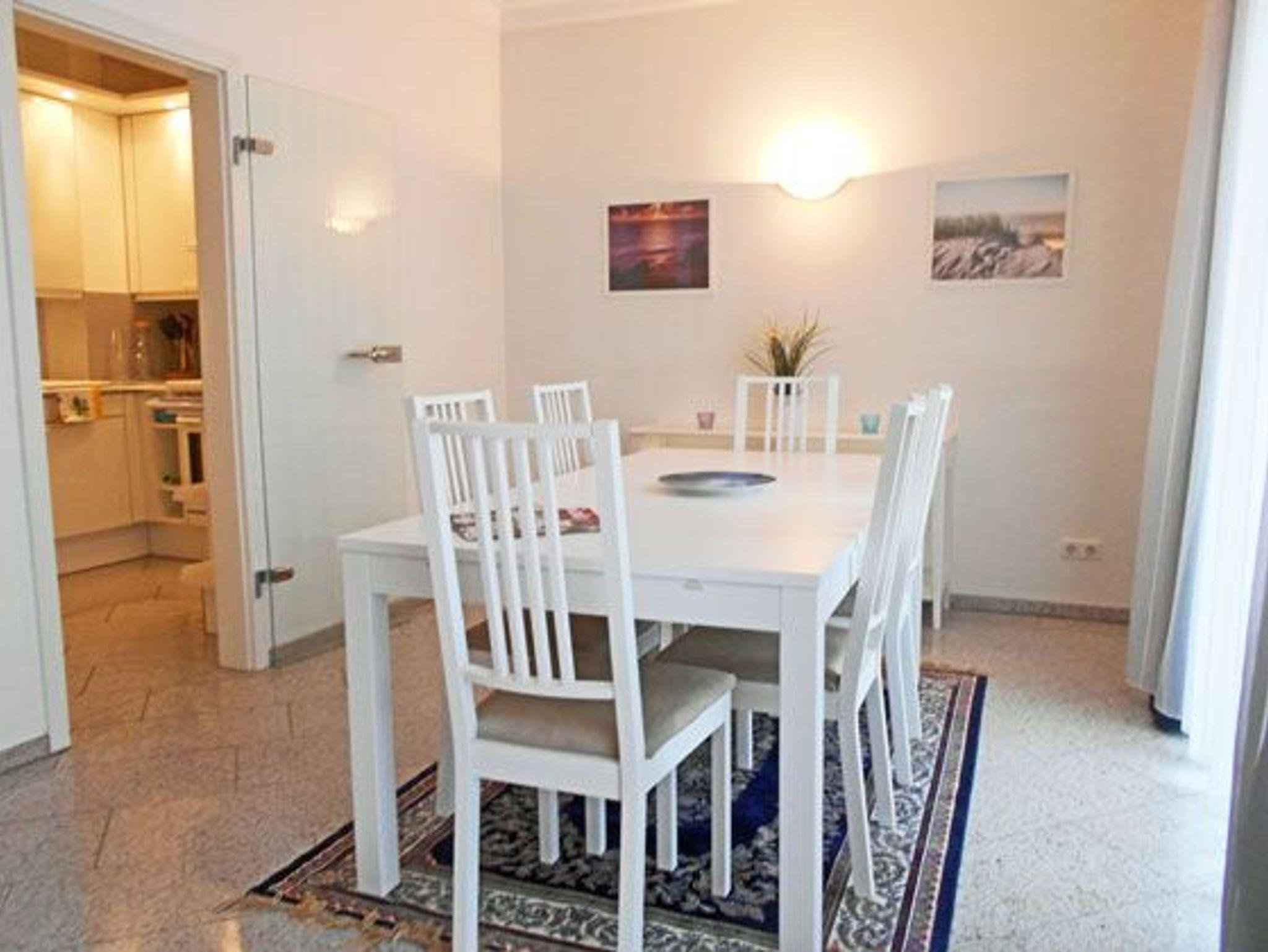 Die schöne Ferienwohnung befindet sich rückwärtig zur Strandpromenade. Der großzügige Wohn- und Essbereich ist offen gestaltet. Hier befindet sich ein Ecksofa, welches sich mit wenigen Handgriffen bequem in ein Bett für zwei Personen umwandeln lässt. Im Wohnzimmer sowie in beiden Schlafzimmern befinden sich jeweils ein Flachbildfernseher.