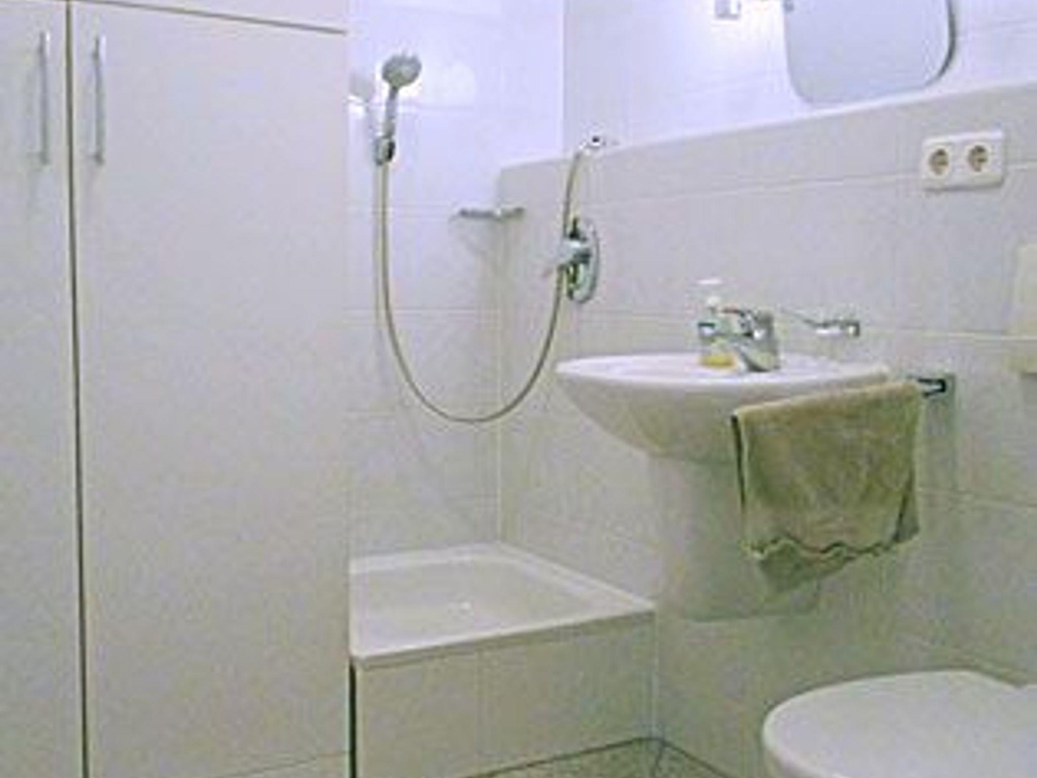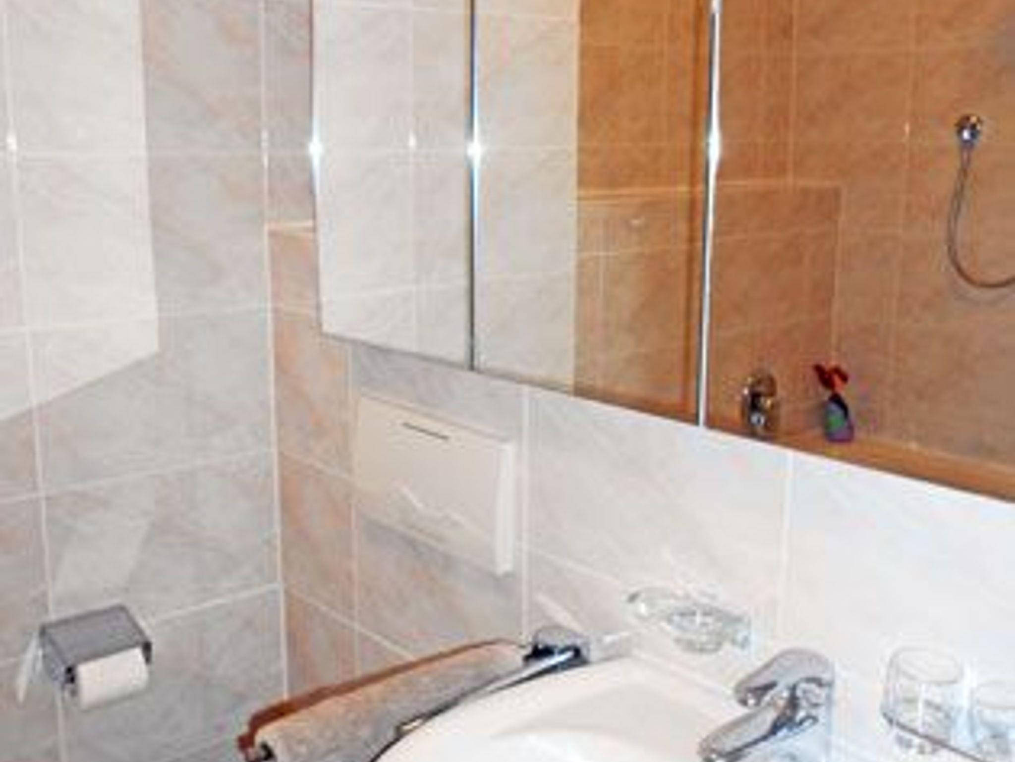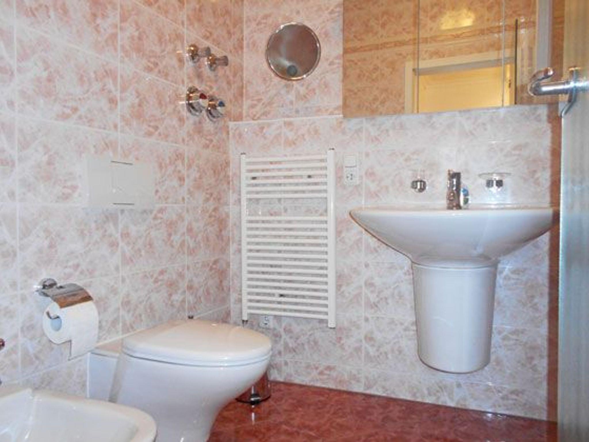 Insgesamt gibt es 2 Schlafzimmer, eines ist mit einem Doppelbett ausgestattet, das andere mit einem Einzelbett mit ausziehbarem Unterbett. Es gibt drei Badezimmer, davon eines mit Badewanne und zwei sind mit einer Dusche ausgestattet.