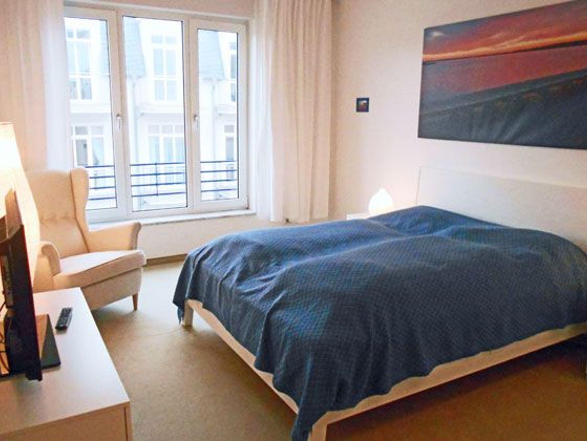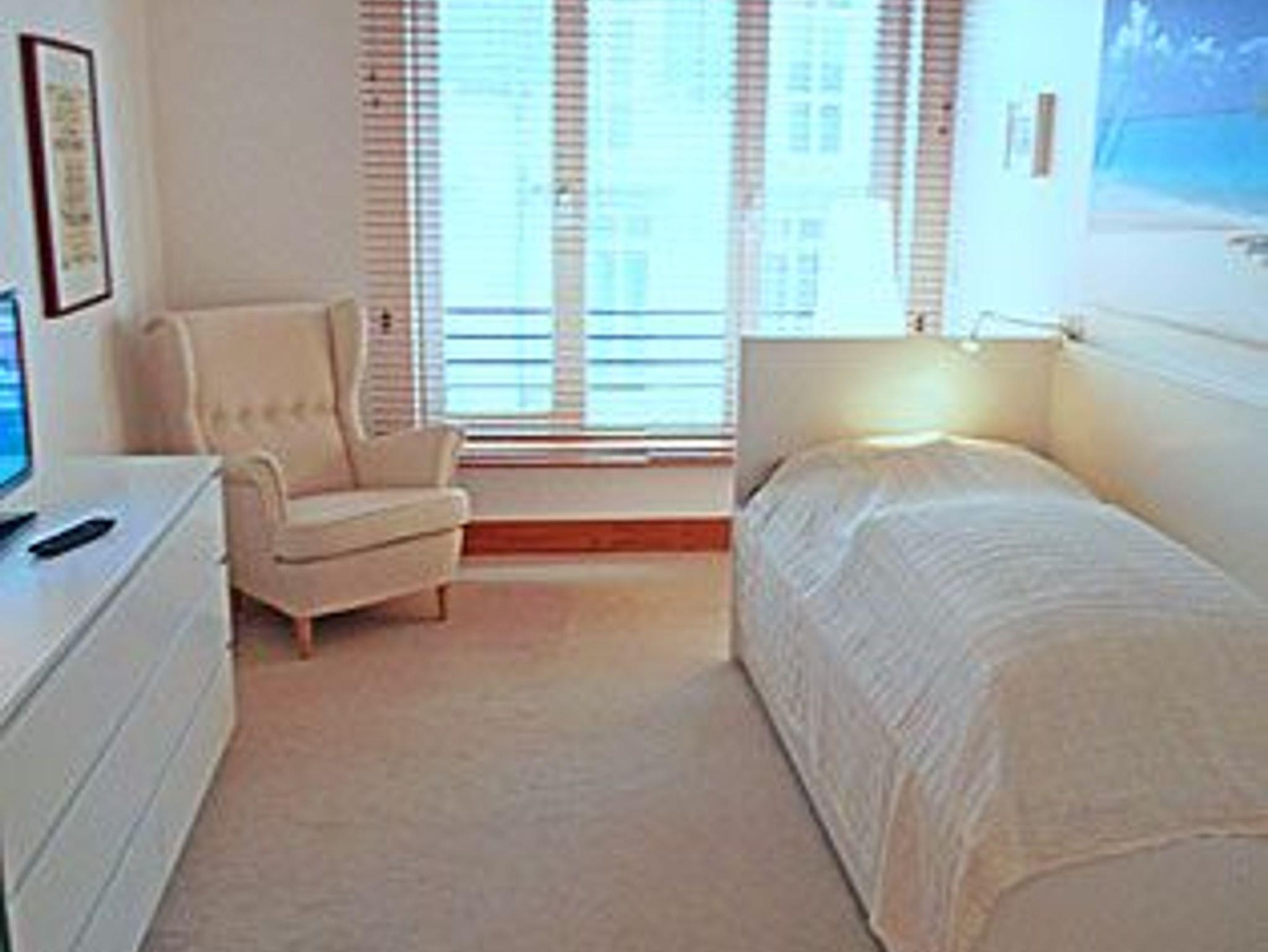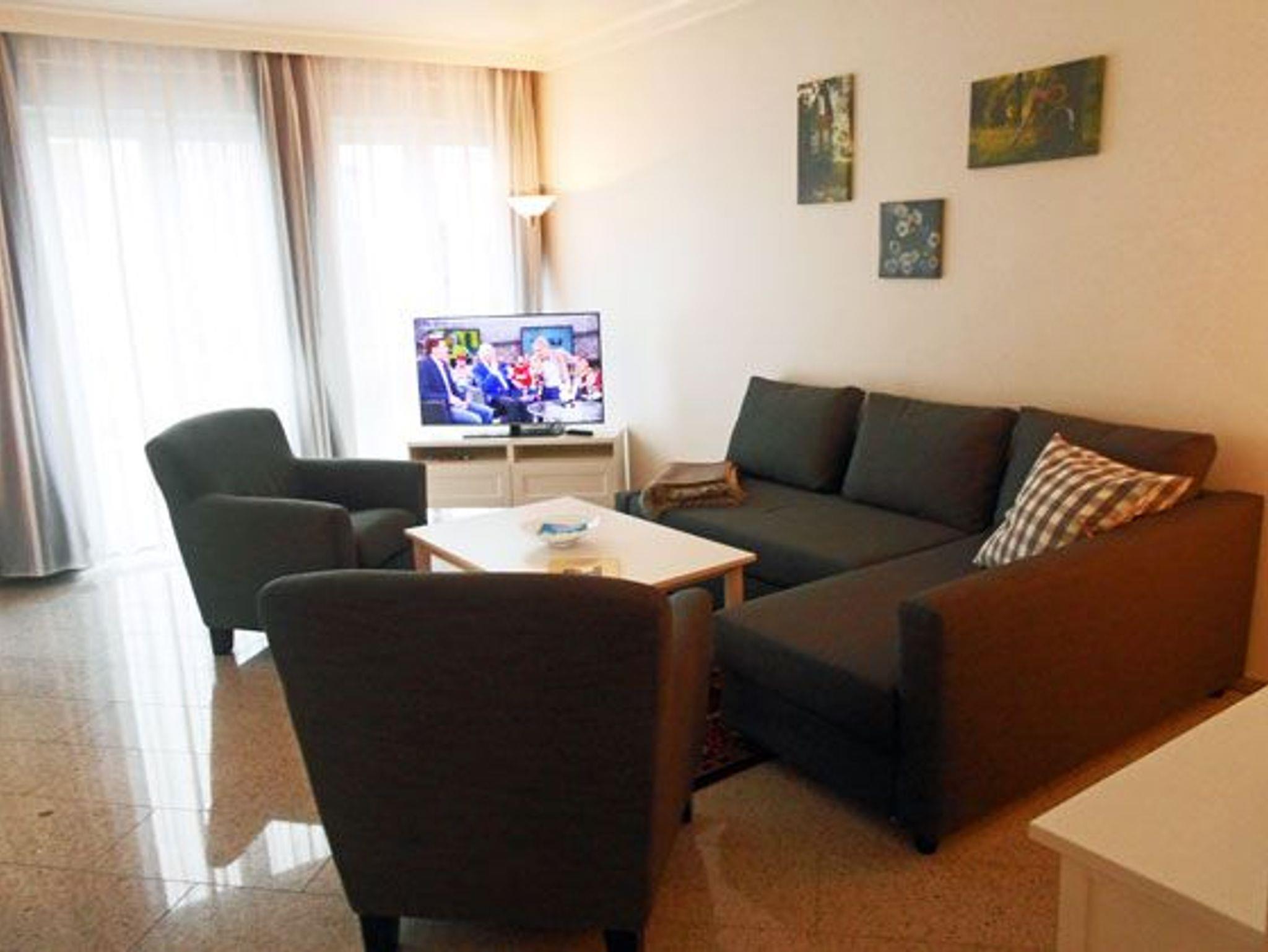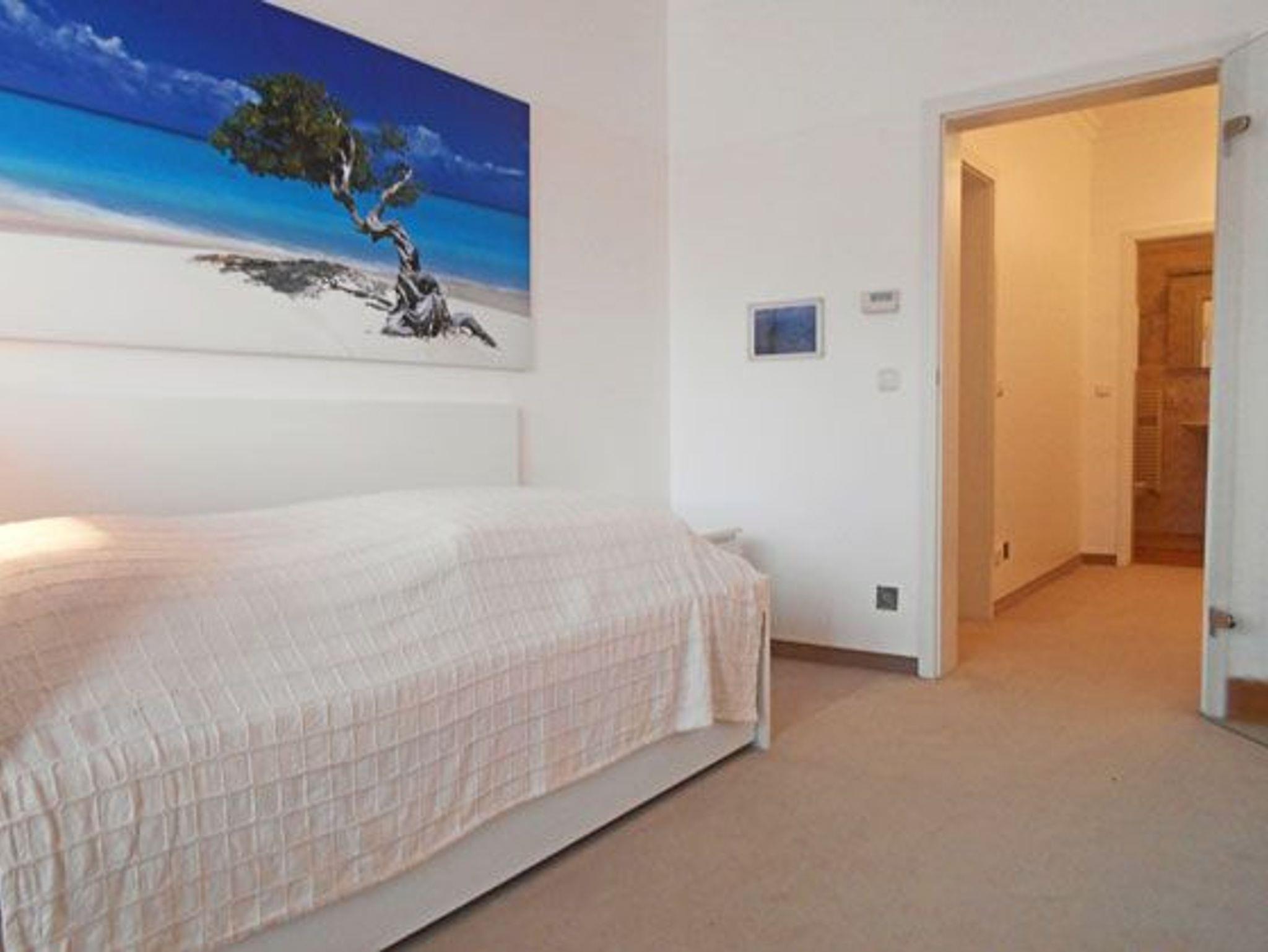 Luxuswohnung mit 3 Bädern und großer Terrasse. Die Wohnung liegt rückwärtig zur Strandpromenade. Der große Wohn- und Essbereich ist offen gestaltet; die Eckcouch lässt sich mit nur wenigen Handgriffen in ein bequemes Bett für zwei Personen umwandeln. Im Wohnzimmer wie in beiden Schlafzimmern befindet sich jeweils ein Flachbildfernseher.